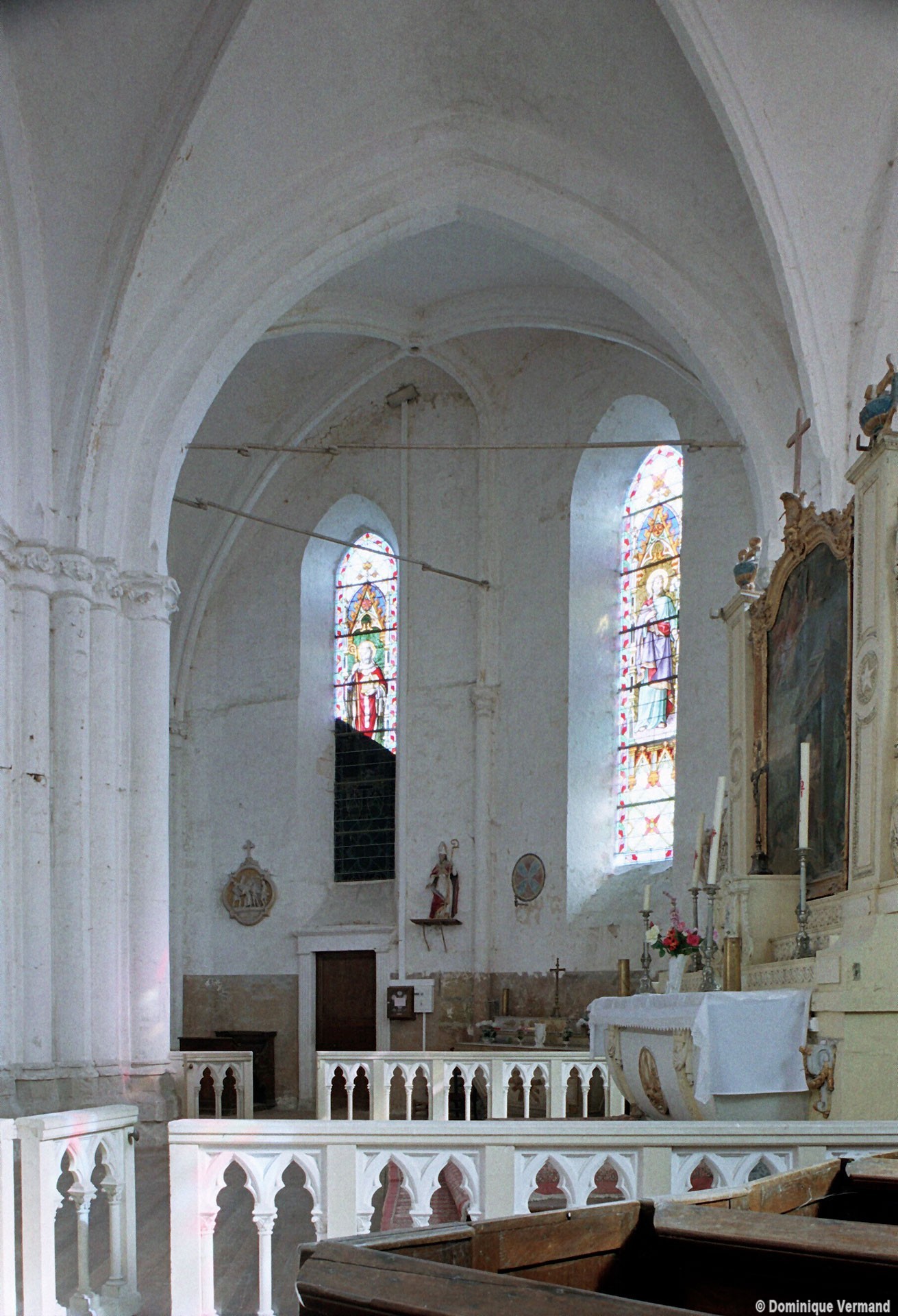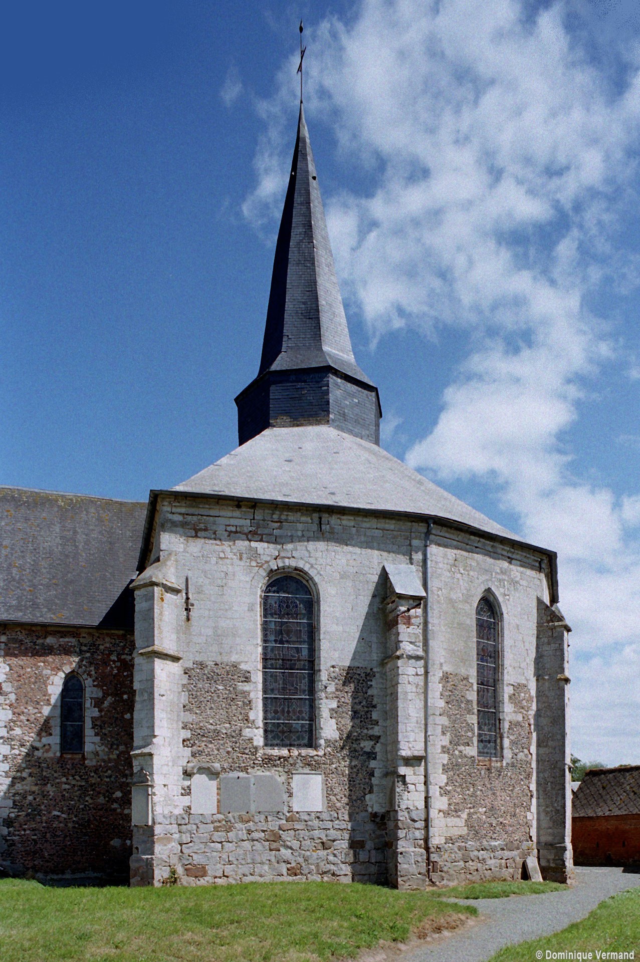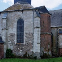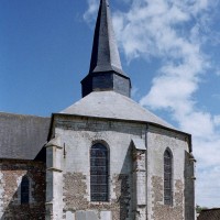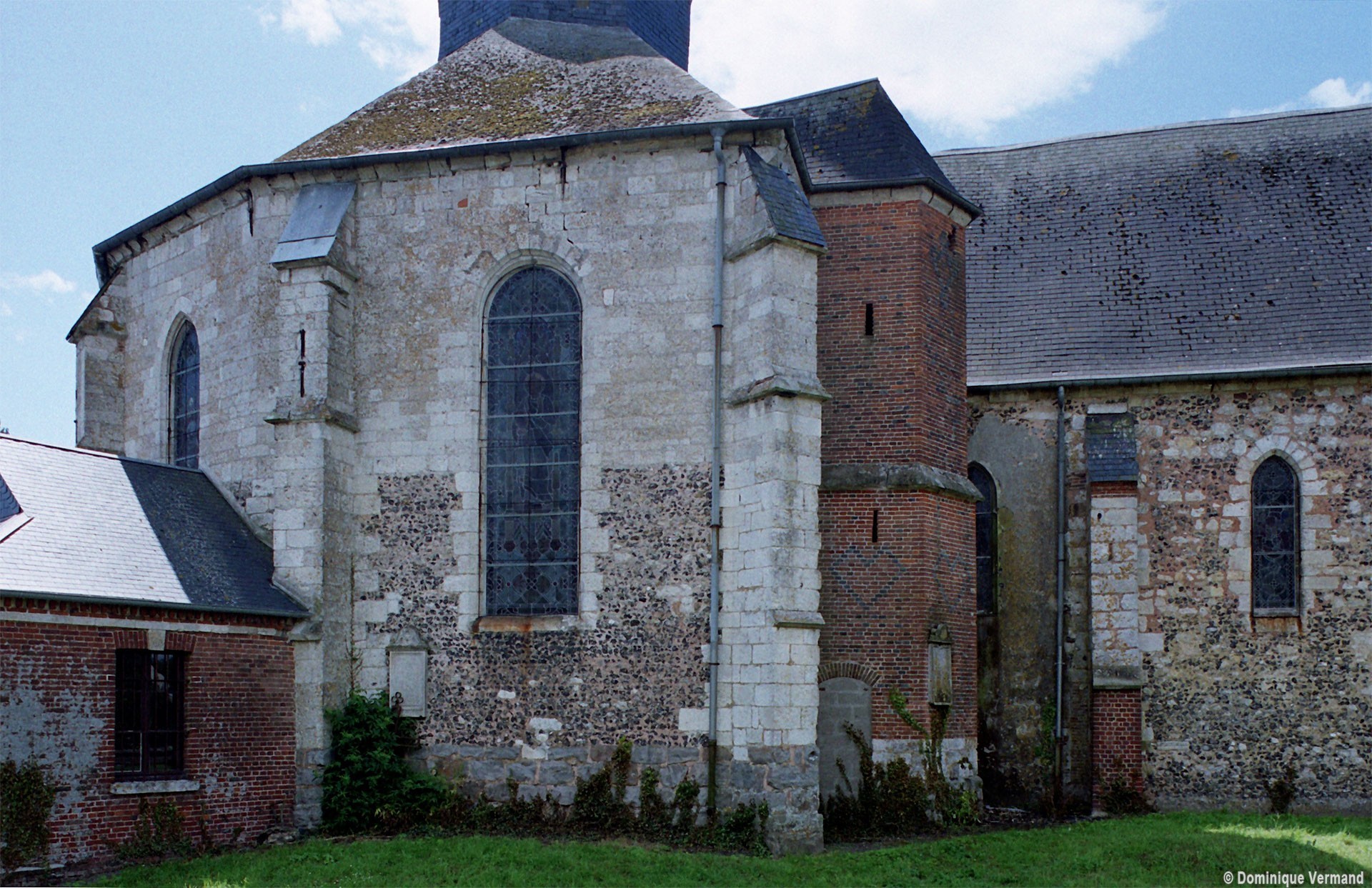 Mais c’est, bien sûr, le choeur et sa curieuse silhouette qui retiennent l’attention. A l’extérieur, les sept pans coupés qui le constituent donnent l’impression d’un édifice autonome à plan centré qui aurait été amputé de sa partie occidentale. Il n’en est rien et le raccord avec la nef s’effectue par des murs perpendiculaires à celle-ci et qui sont d’origine. L’ensemble, que domine une flèche en charpente et ardoises beaucoup plus tardive, est très austère. Assis sur un soubassement de grès, les murs sont d’abord en silex puis en pierres bien appareillées. Des contreforts à l’aspect monolithique épaulent les angles. Hautes et de largeurs inégales, les fenêtres sont dénuées de tout décor. Deux sont en plein cintre et l’accent est mis sur la fenêtre axiale, plus large que les autres.
