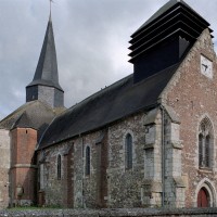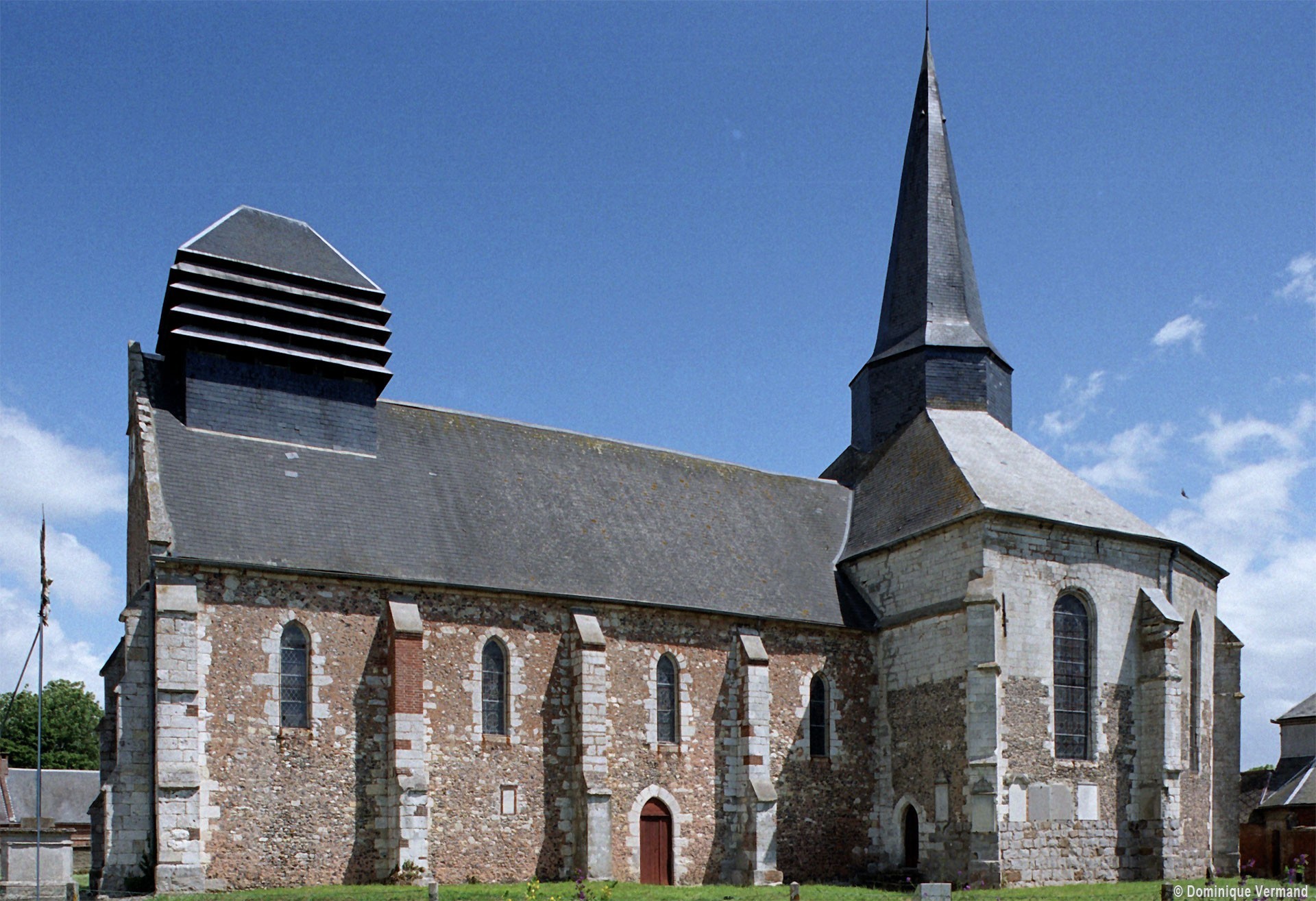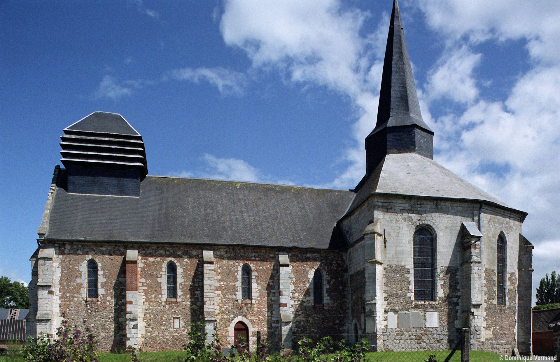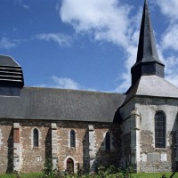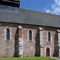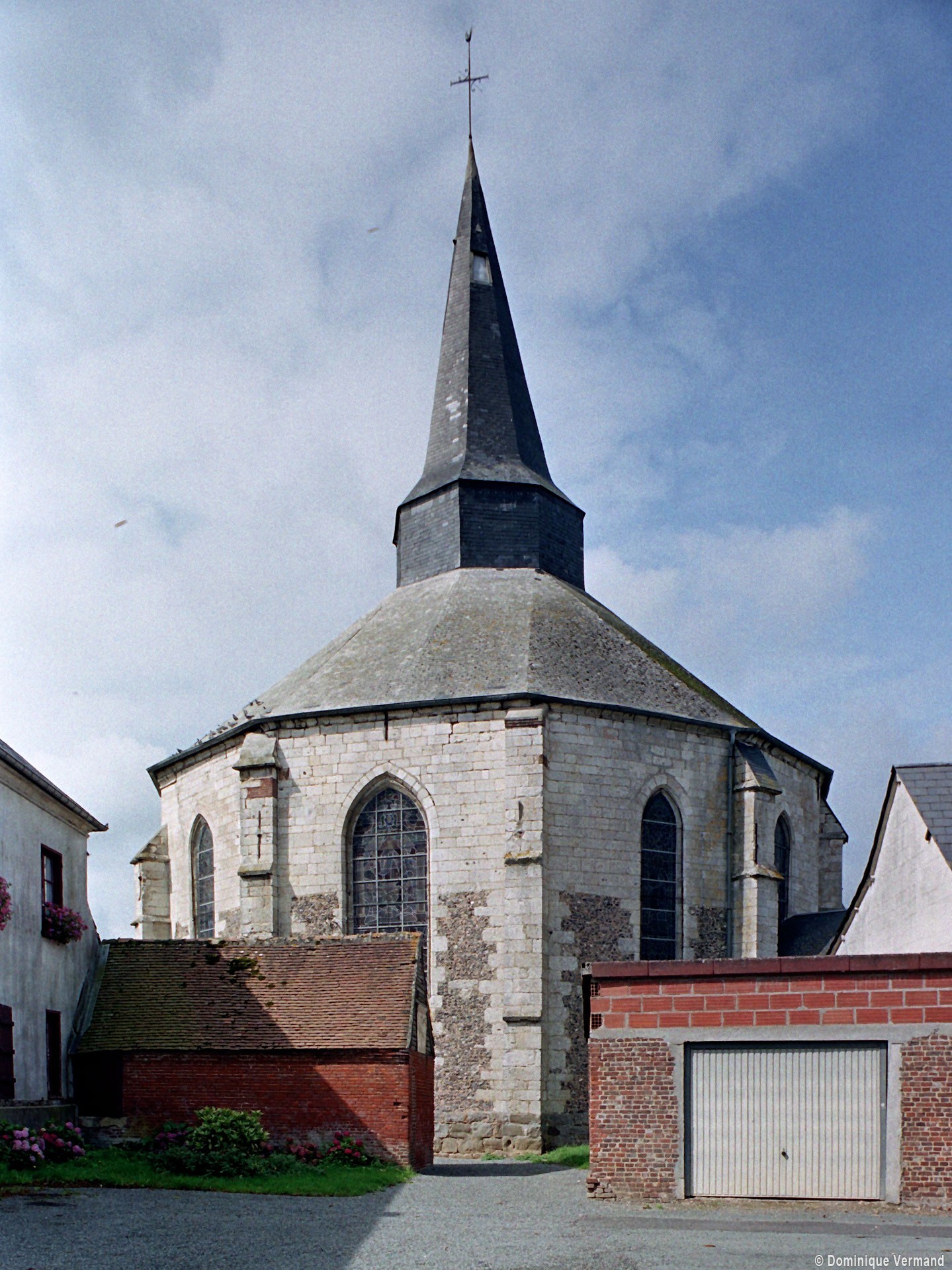 Mais c’est, bien sûr, le choeur et sa curieuse silhouette qui retiennent l’attention. A l’extérieur, les sept pans coupés qui le constituent donnent l’impression d’un édifice autonome à plan centré qui aurait été amputé de sa partie occidentale. Il n’en est rien et le raccord avec la nef s’effectue par des murs perpendiculaires à celle-ci et qui sont d’origine. L’ensemble, que domine une flèche en charpente et ardoises beaucoup plus tardive, est très austère. Assis sur un soubassement de grès, les murs sont d’abord en silex puis en pierres bien appareillées. Des contreforts à l’aspect monolithique épaulent les angles. Hautes et de largeurs inégales, les fenêtres sont dénuées de tout décor. Deux sont en plein cintre et l’accent est mis sur la fenêtre axiale, plus large que les autres.