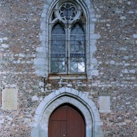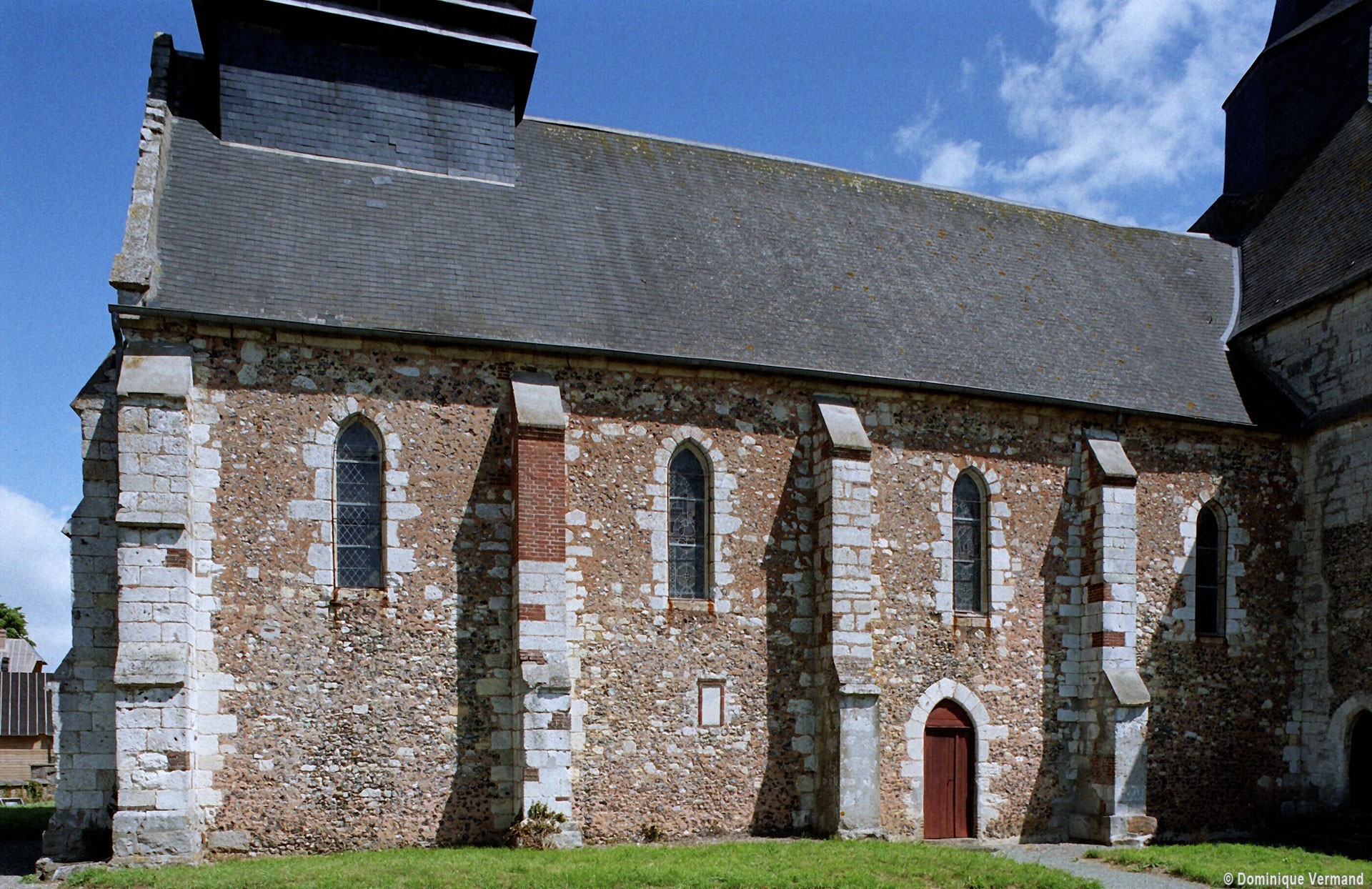 Moins soignée que le choeur, comme souvent, la nef est construite en moellons mélangés à du silex, la pierre étant réservée aux contreforts – certains ont été réparés ou refaits en briques – et aux ouvertures. La façade, très bien conservée avec ses contreforts et son mur pignon intacts, est percée d’un petit portail à ressauts aux arêtes simplement moulurées. Au-dessus s’ouvre une fenêtre à deux lancettes que surmonte une rose à six lobes.