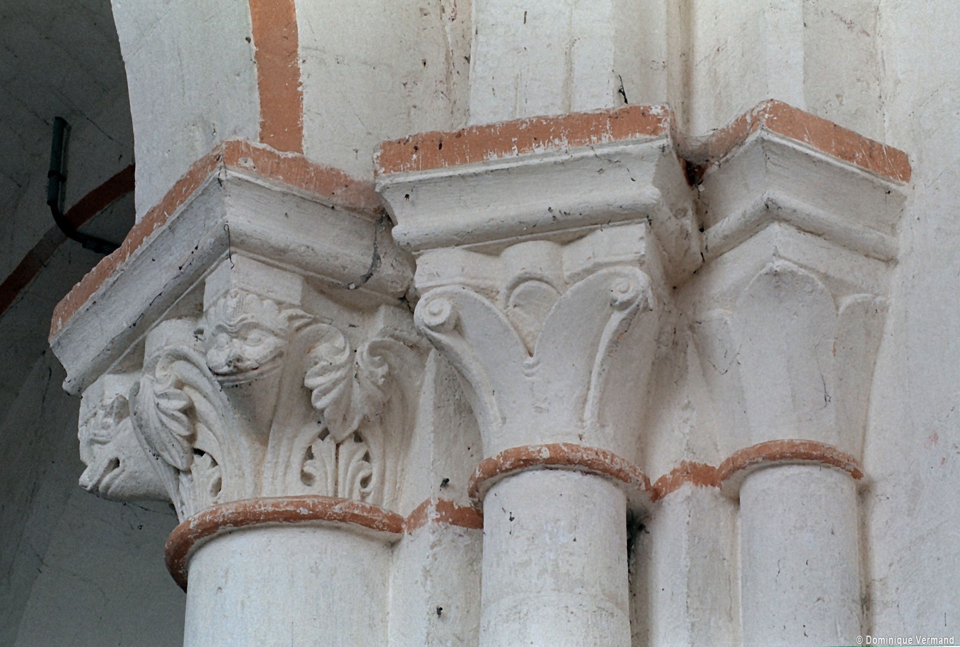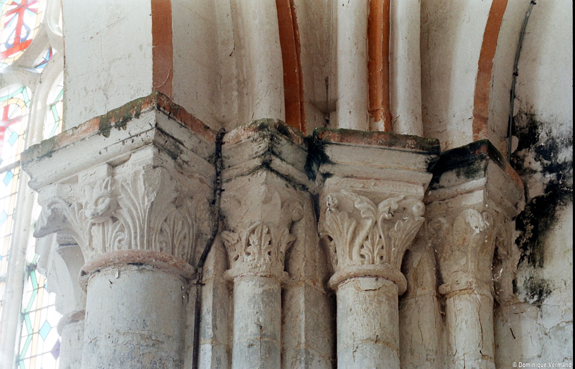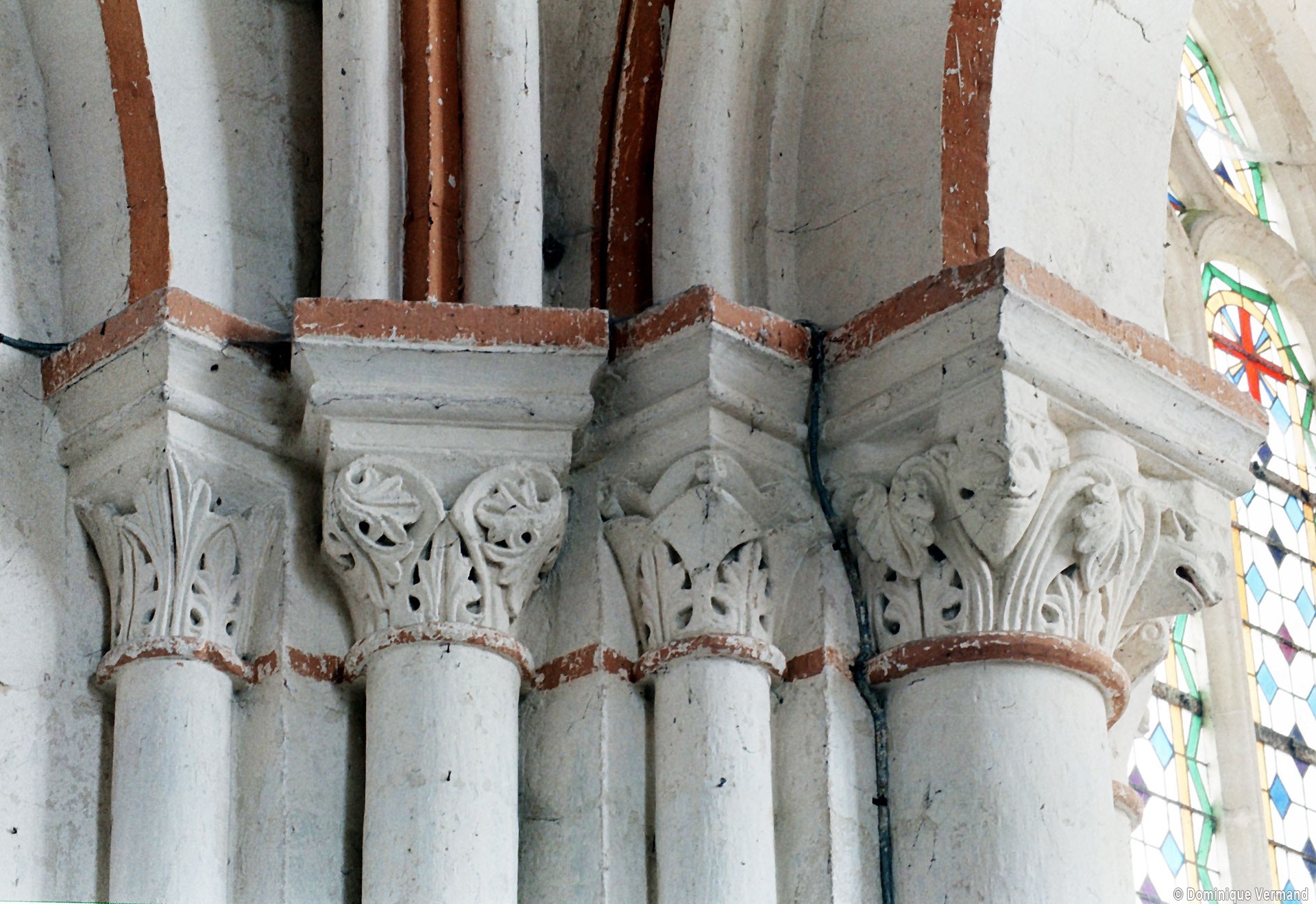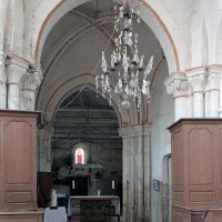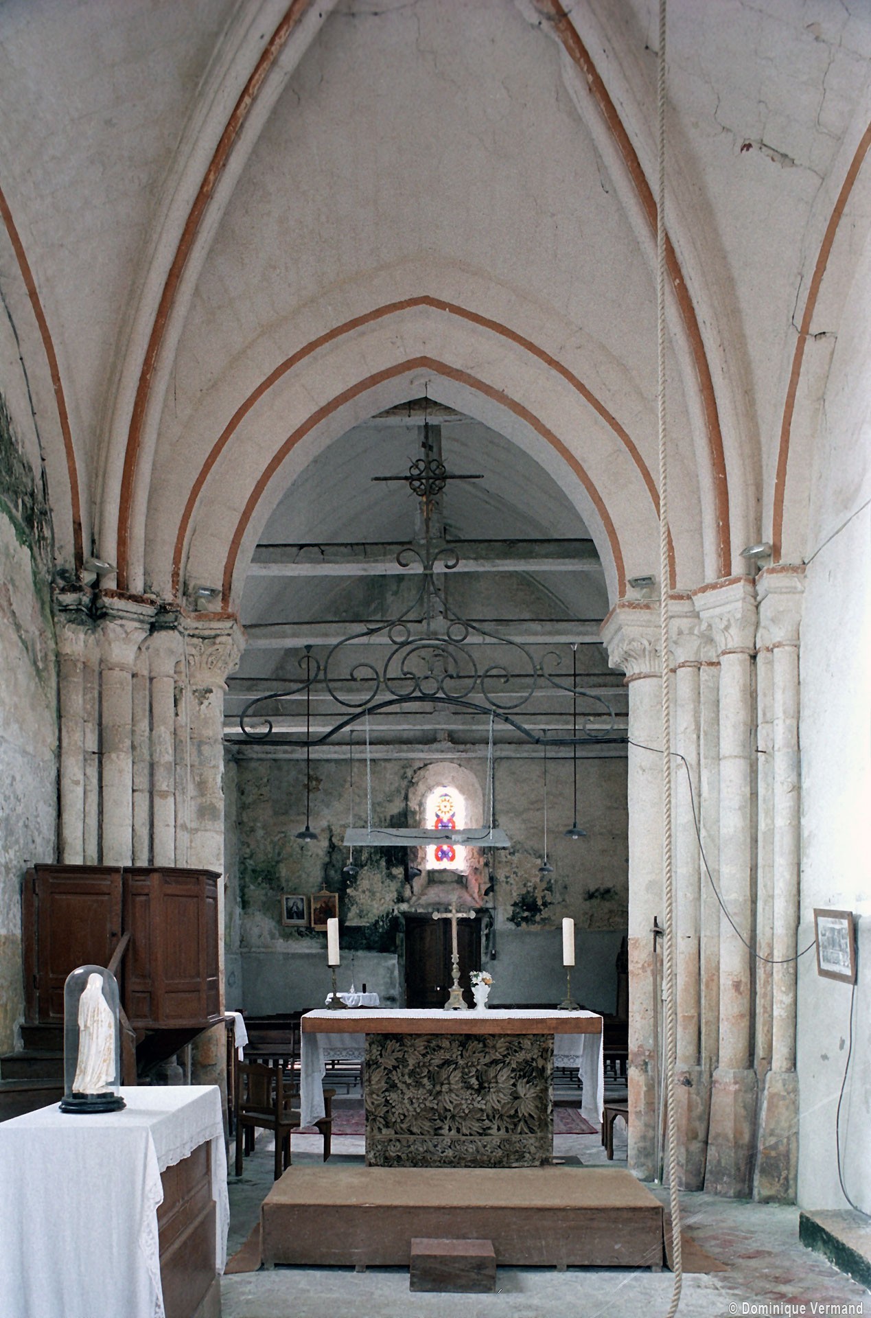 Peu avant le milieu du 12ème siècle, la petite église romane primitive est dotée d’un nouveau chœur. Long à l’origine de deux travées, il ne reste plus aujourd’hui que la première, celle qui porte le clocher. Elle est d’une qualité remarquable. Doubleaux, ogives et formerets retombent sur les demi colonnes et colonnettes par l’intermédiaire de chapiteaux dont les plus intéressants mélangent avec bonheur feuilles d’acanthe et masques.