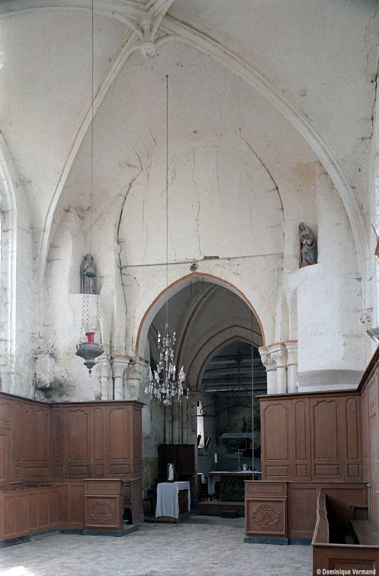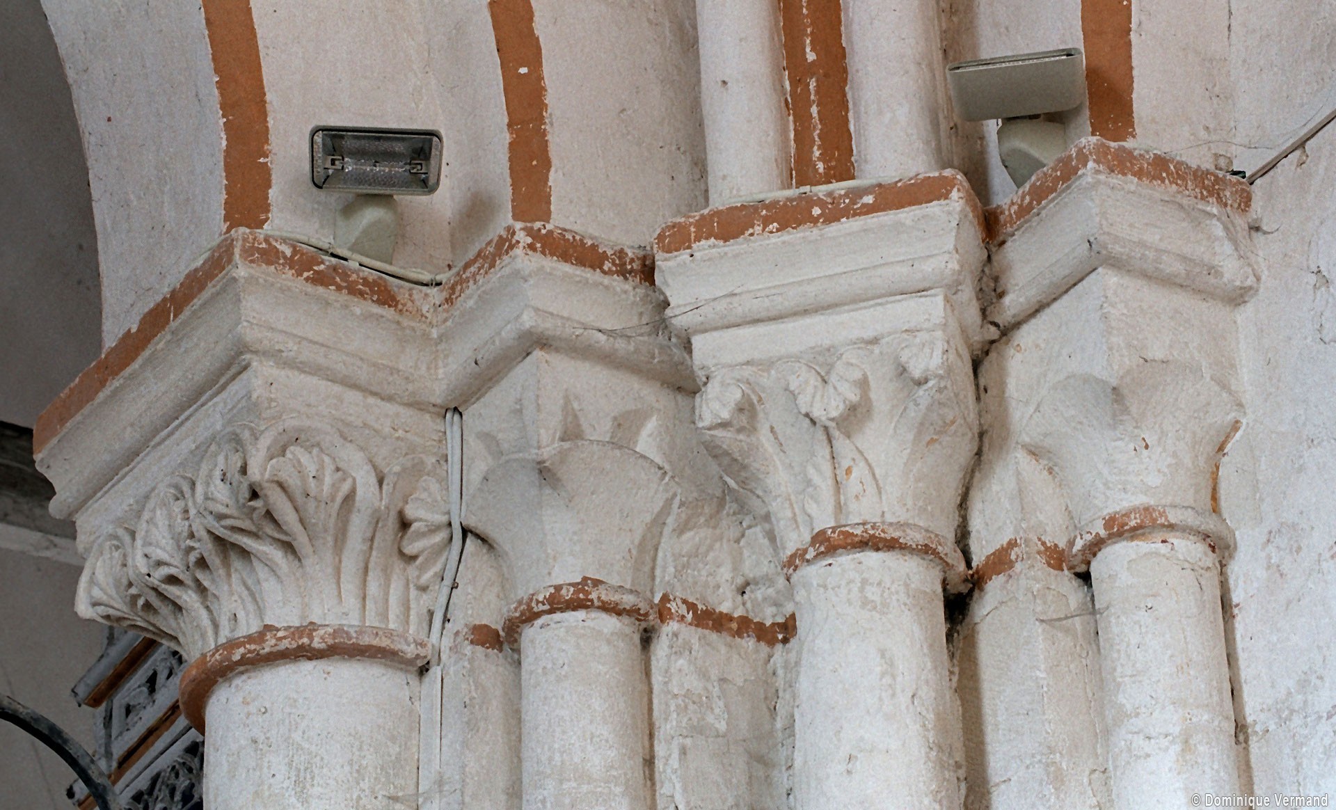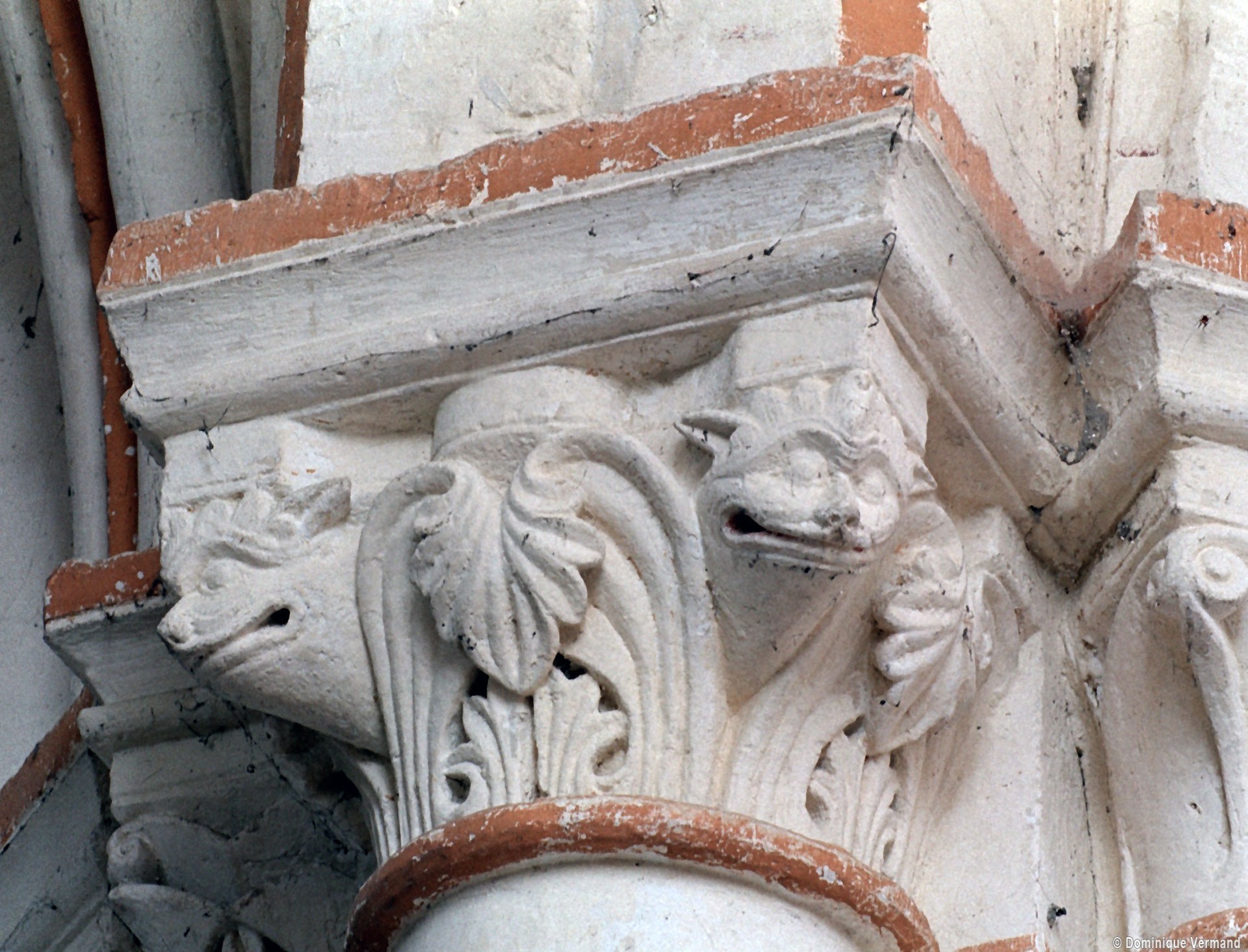 Peu avant le milieu du 12ème siècle, la petite église romane primitive est dotée d’un nouveau chœur. Long à l’origine de deux travées, il ne reste plus aujourd’hui que la première, celle qui porte le clocher. Elle est d’une qualité remarquable. Doubleaux, ogives et formerets retombent sur les demi colonnes et colonnettes par l’intermédiaire de chapiteaux dont les plus intéressants mélangent avec bonheur feuilles d’acanthe et masques.
