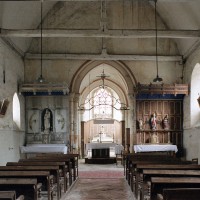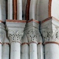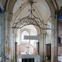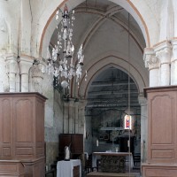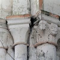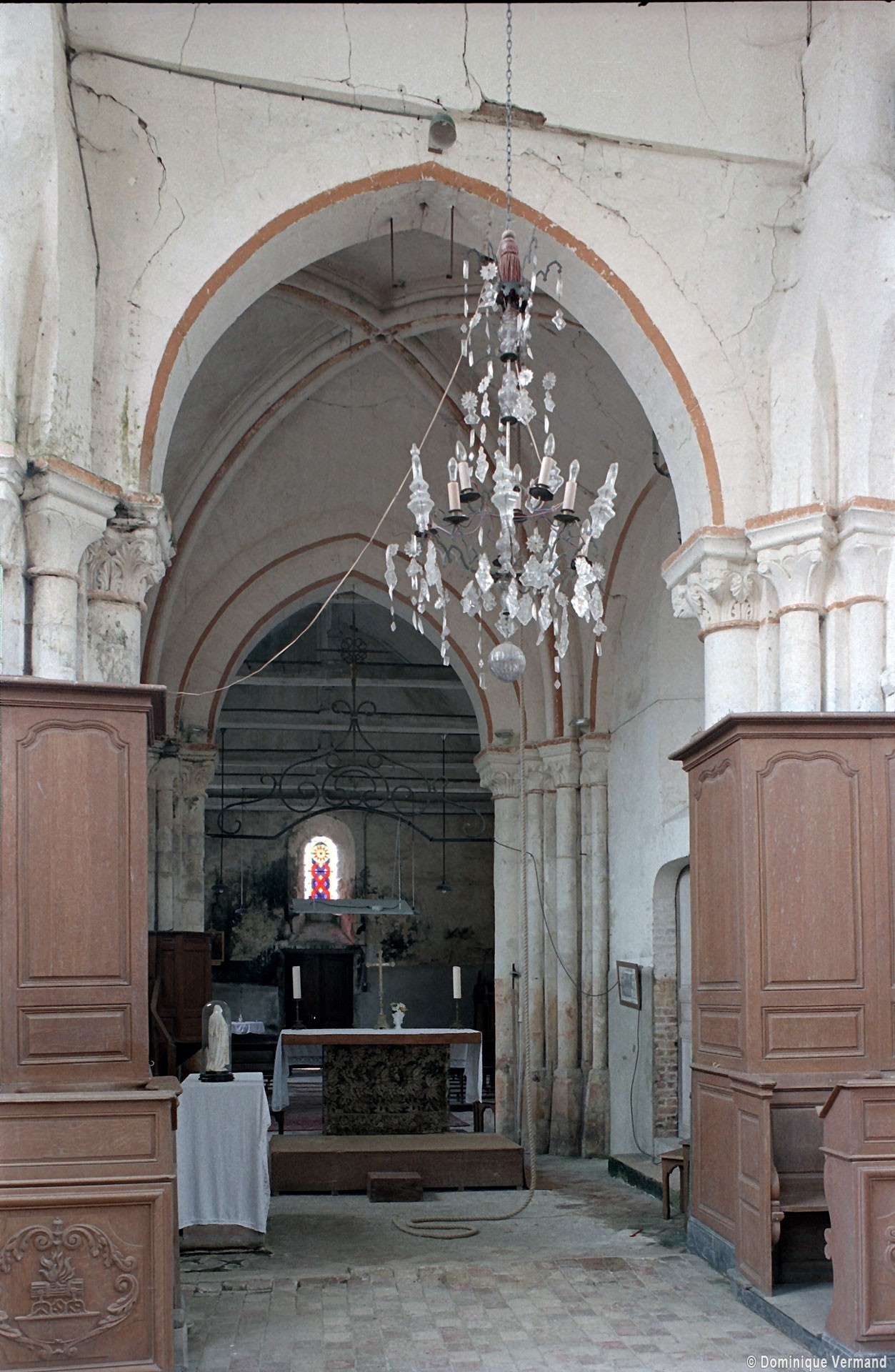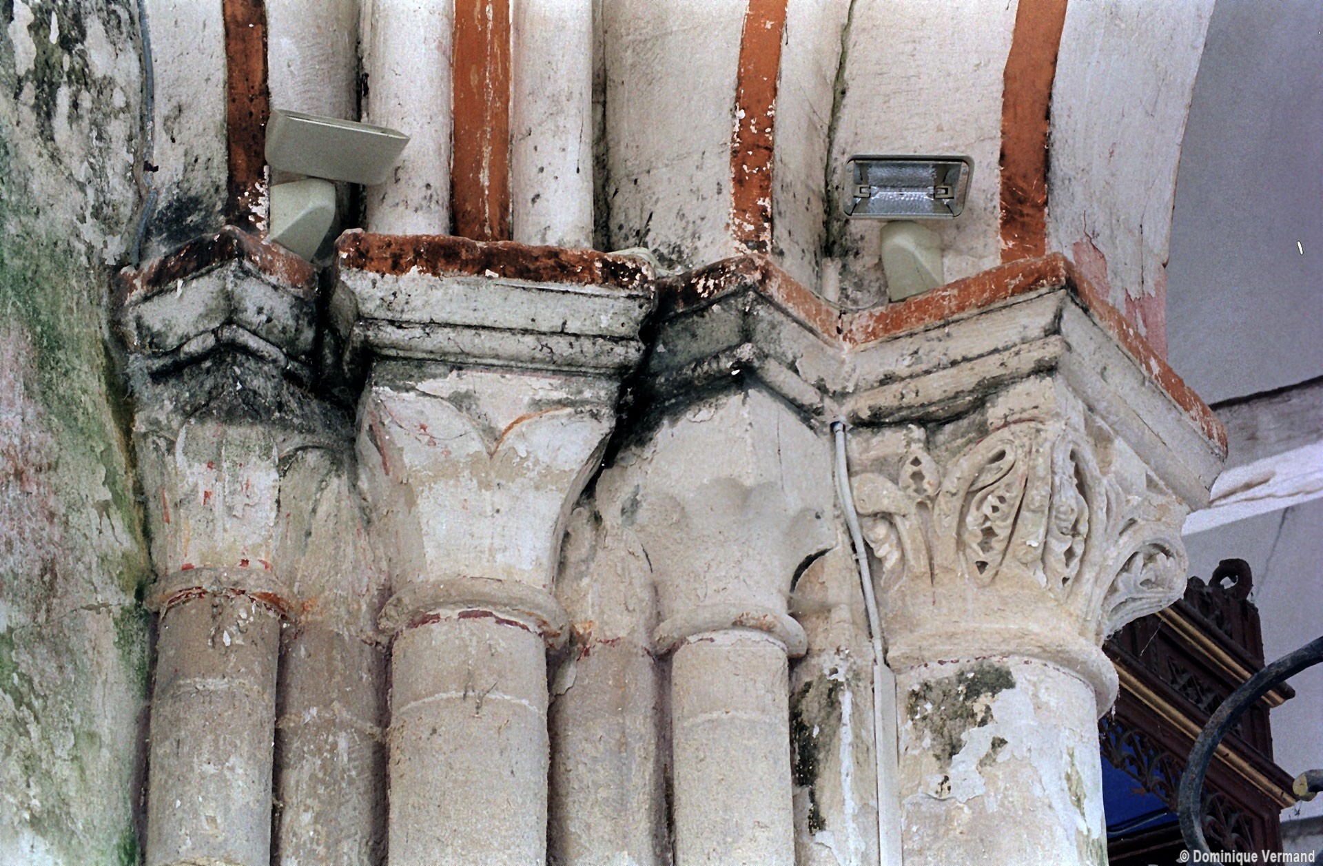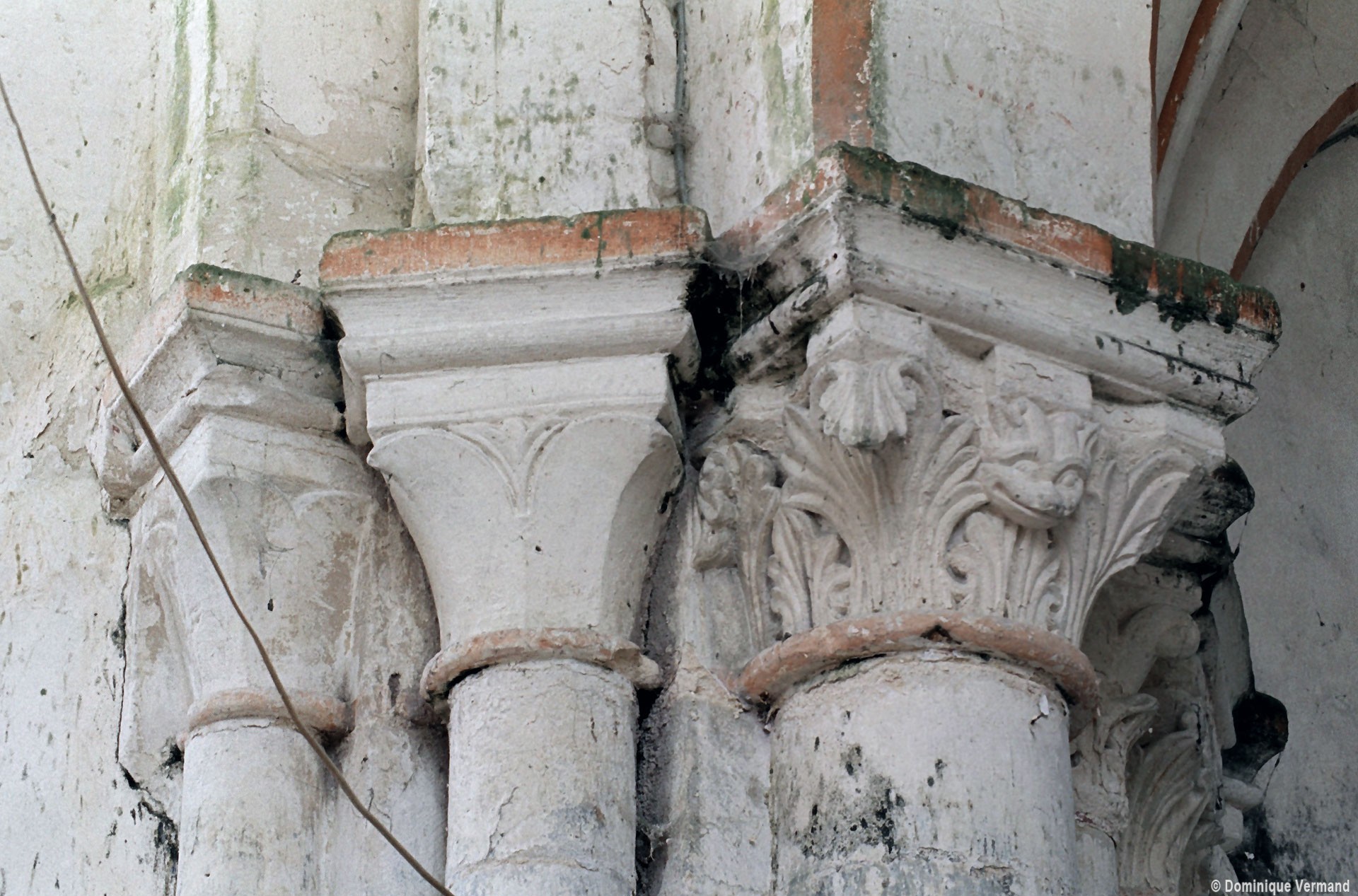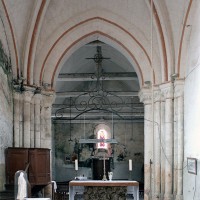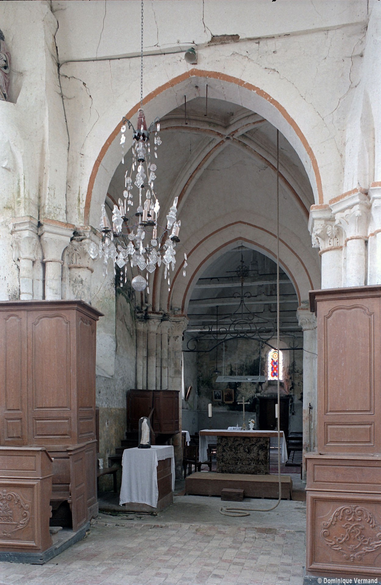 Peu avant le milieu du 12ème siècle, la petite église romane primitive est dotée d’un nouveau chœur. Long à l’origine de deux travées, il ne reste plus aujourd’hui que la première, celle qui porte le clocher. Elle est d’une qualité remarquable. Doubleaux, ogives et formerets retombent sur les demi colonnes et colonnettes par l’intermédiaire de chapiteaux dont les plus intéressants mélangent avec bonheur feuilles d’acanthe et masques.