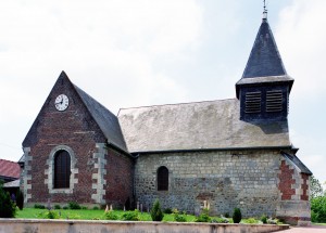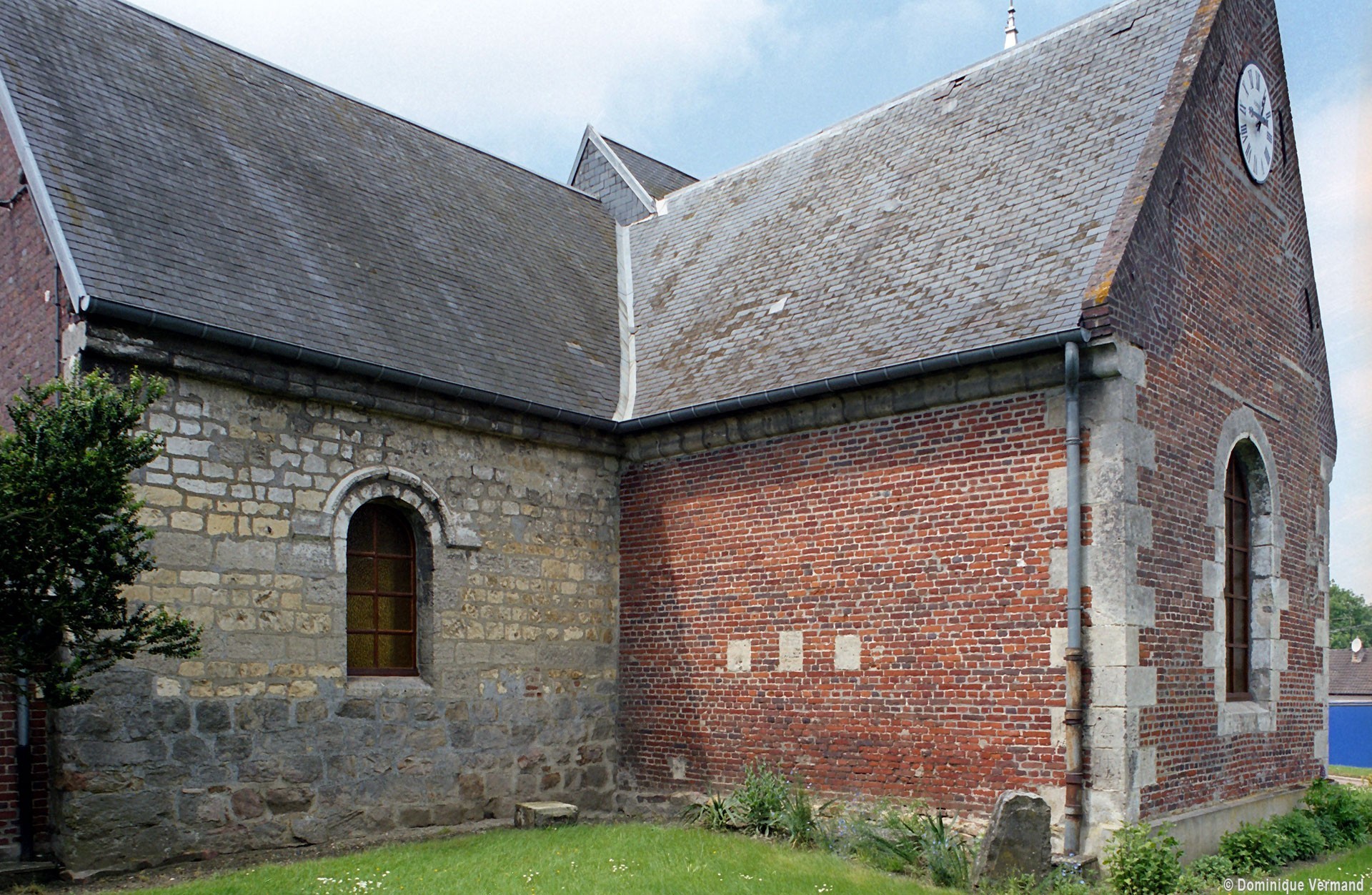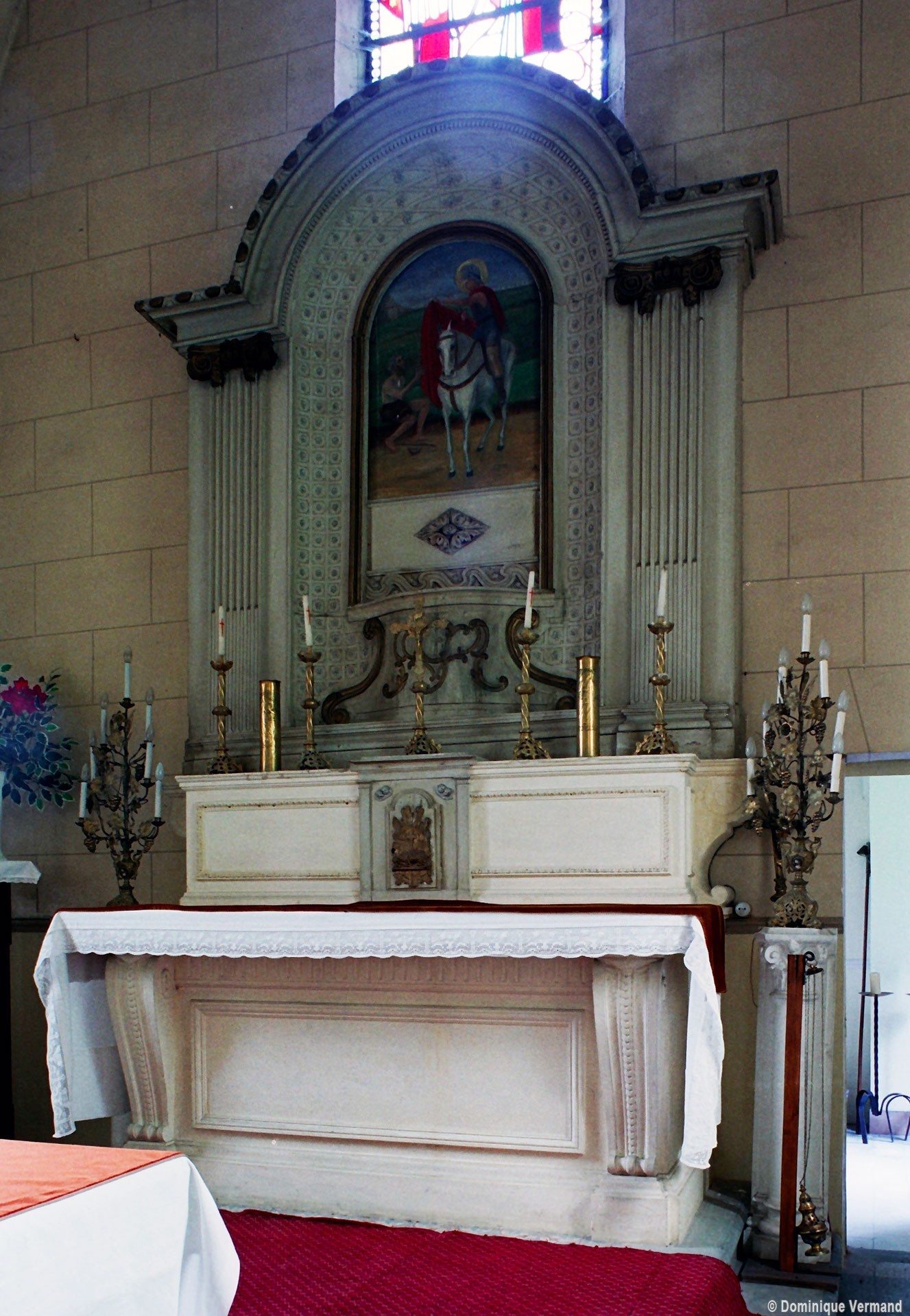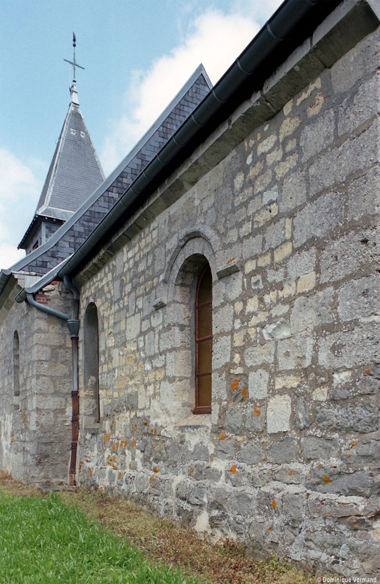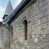 Bâtie sur un tertre au milieu du village, Saint-Martin est une petite église remontant, pour l’essentiel, au milieu du 12ème siècle. Modifiée par la suite, elle comprenait alors, selon un plan très fréquent pour les petites églises de campagne, une nef unique suivie d’un choeur plus étroit. Reposant sur un haut soubassement en grés, les murs sont construits en moyen appareil avec joints épais et irréguliers. L’attribution au 12ème siècle est attestée par trois fenêtres en plein cintre – une à la nef et deux au choeur – dont l’archivolte est soulignée par une moulure biseautée qui marque un petit retour horizontal à la base de celle-ci, un type très courant à l’époque.
