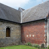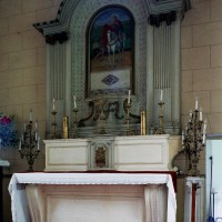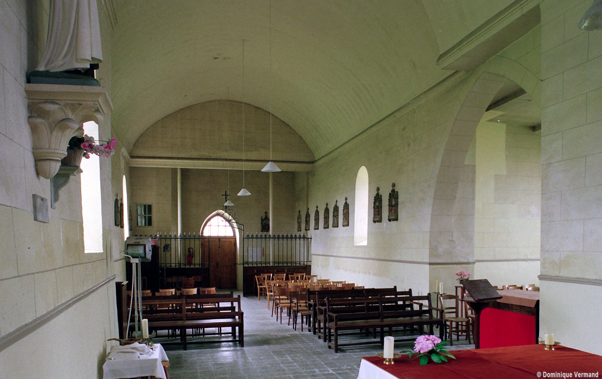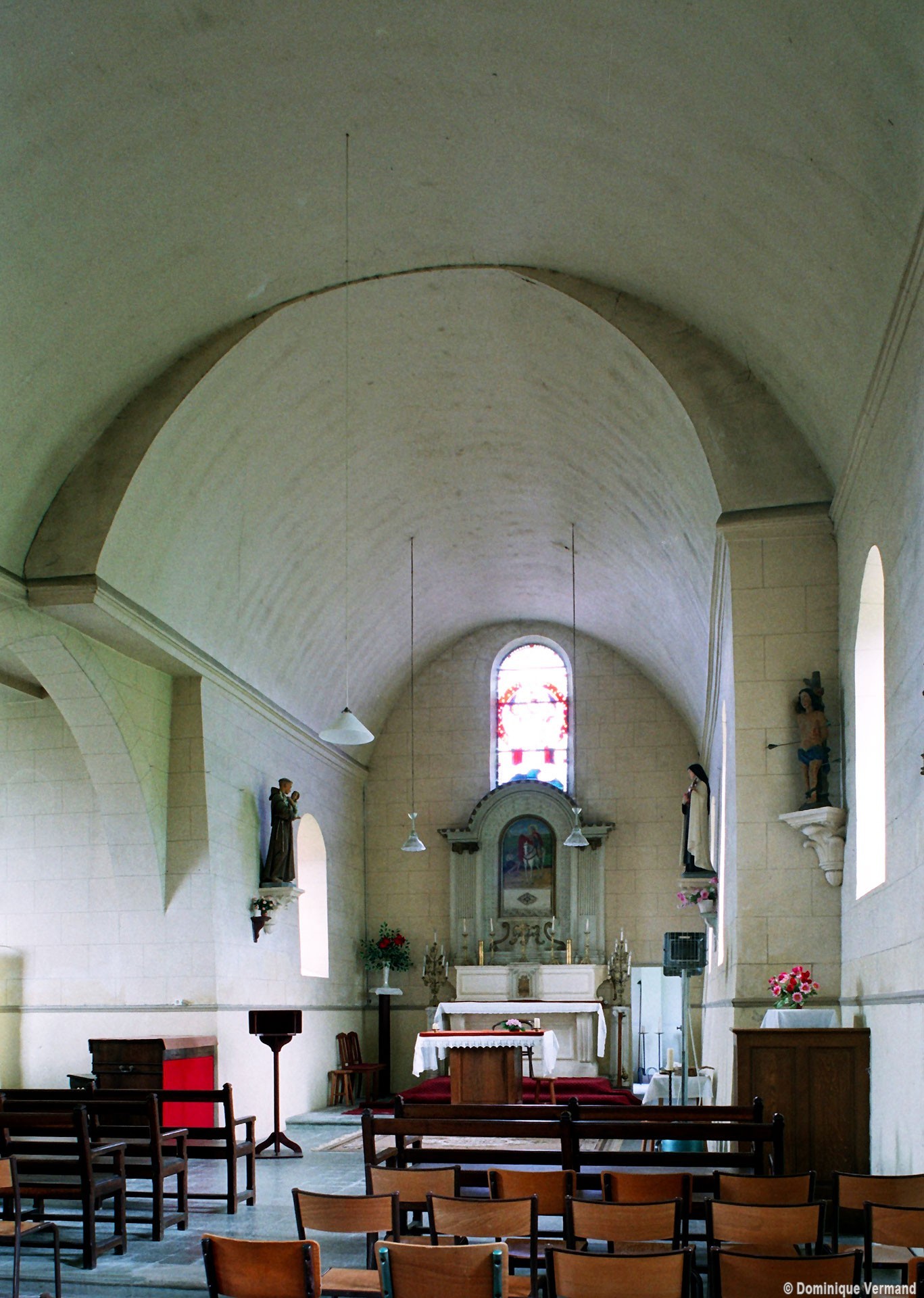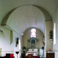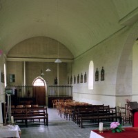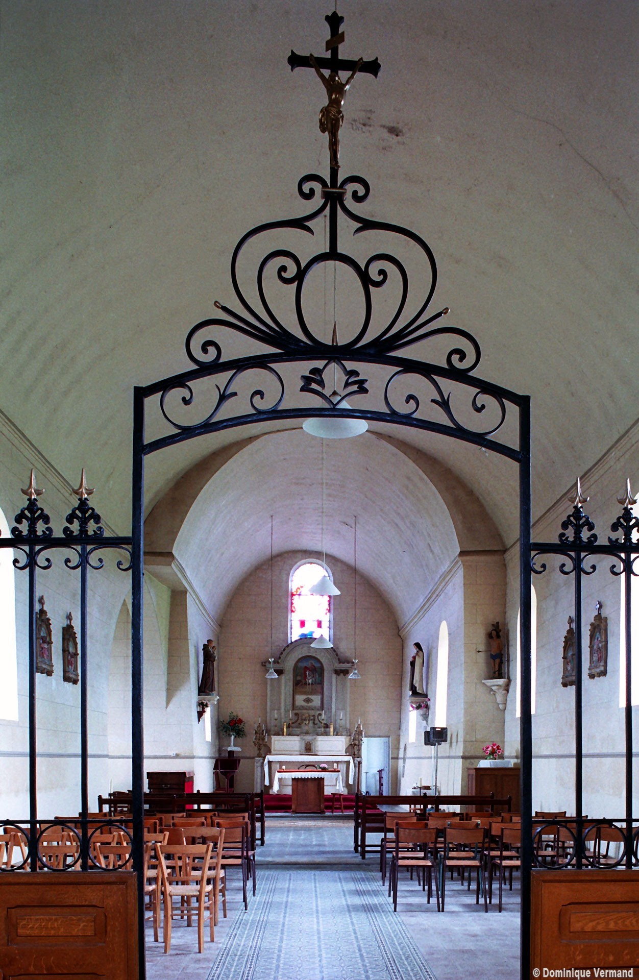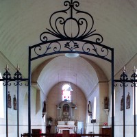 L’intérieur, totalement uniformisé par un enduit à faux joints au 19ème siècle, n’a malheureusement aucun caractère. L’édifice n’a cependant jamais dû posséder de voûte en pierre. C’est au 18ème siècle (un graffiti porte la date de 1764) qu’une chapelle est greffée au nord, à la jonction de la nef et du choeur. Construite en briques, ses angles et l’unique fenêtre sont en pierres appareillées en carreaux et boutisses (le sens des assises est alterné). C’est aussi le cas des deux contreforts de la façade, en partie refaite au 19ème siècle comme le mur de chevet. L’édifice conserve sa belle grille de choeur en fer forgé, remontée à l’entrée de la nef, et un sobre autel retable du 18ème siècle (2008).
