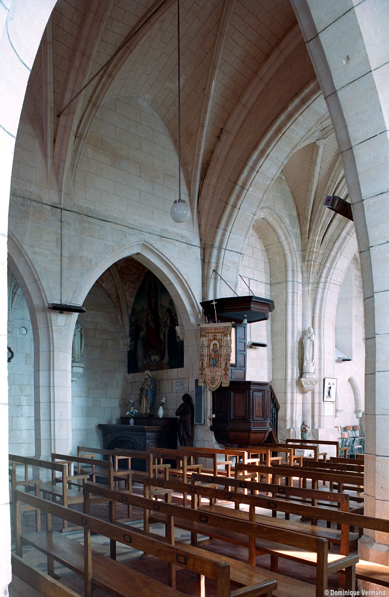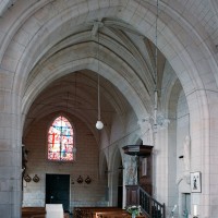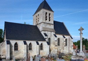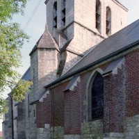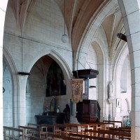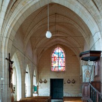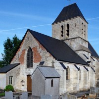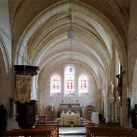 La façade a été fortement restaurée en 1774, une date gravée sous la fenêtre du pignon. La nef est aveugle et communique avec les bas-côtés par trois arcades brisées dont la mouluration se continue sur les piles qui les reçoivent. Elle est voûtée d’ogives, comme les bas-côtés. Très étroite, la travée du clocher comporte une voûte avec liernes et tiercerons (nervures secondaires) dont les clefs comportent des blasons. Une importante tourelle d’escalier polygonale, intacte, la flanque au nord. Le choeur a été totalement refait après la Guerre.