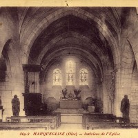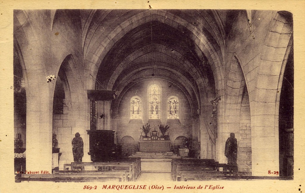 Saint-Pierre a été largement reconstruite à l’identique en 1922-23 après avoir été durement touchée le 9 juin 1918. Seuls la façade et le flanc nord de l’édifice étaient restés intacts. Formé d’une nef de trois travées avec bas-côtés et d’un choeur à chevet plat, de trois travées également, avec clocher sur la première travée, sa construction remontait au début du 16ème siècle. Elle était due à Claude de Villers Saint-Paul, seigneur de Marquéglise, dont le blason figure sur une ancienne clef de voûte du choeur, conservée après sa destruction.
