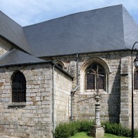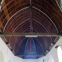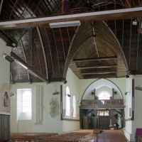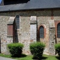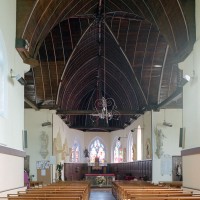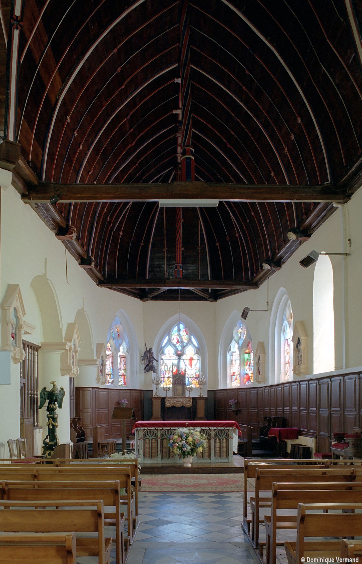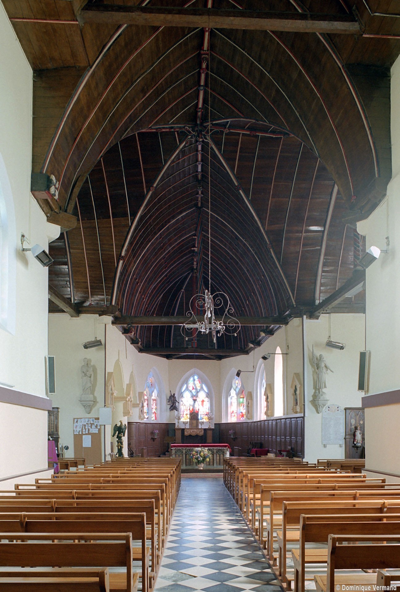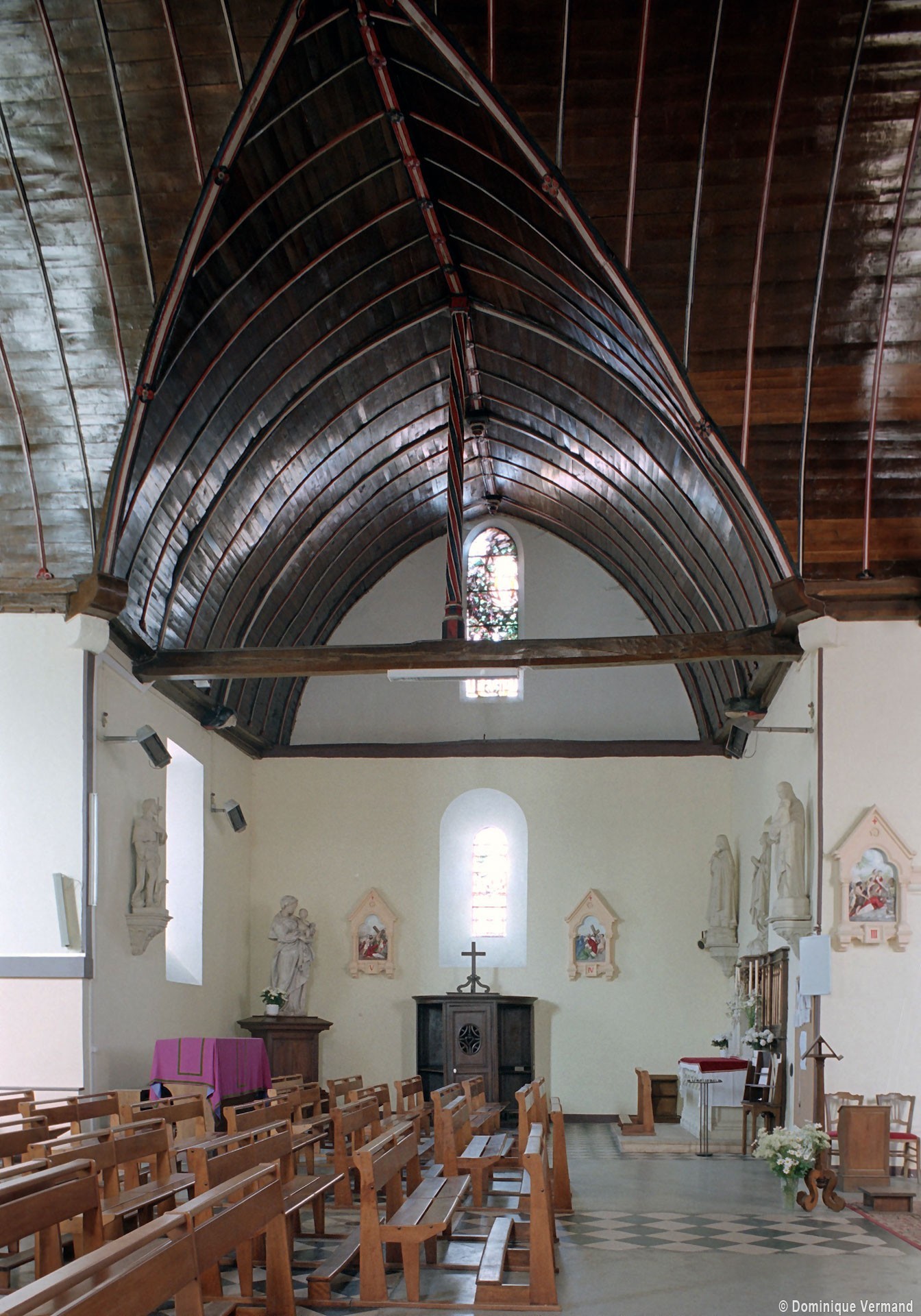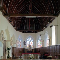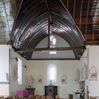Partie la plus soignée, le choeur est percé de fenêtres à réseau flamboyant. Mais le principal intérêt de l’église est la magnifique charpente du 16ème siècle qui couvre le transept et le choeur et qui compte parmi les plus belles d’une région pourtant si riche à cet égard. En forme de carène renversée, elle est pourvue d’entraits (poutres horizontales) et de poinçons (poutres verticales), ces derniers sculptés en forme de torsade. Les sablières (poutres surmontant les murs) comportent des blochets sculptés et la clef des berceaux est décorée de petites fleurs. La polychromie rouge et bleue, d’origine, a été simplement rafraîchie.