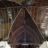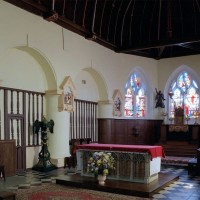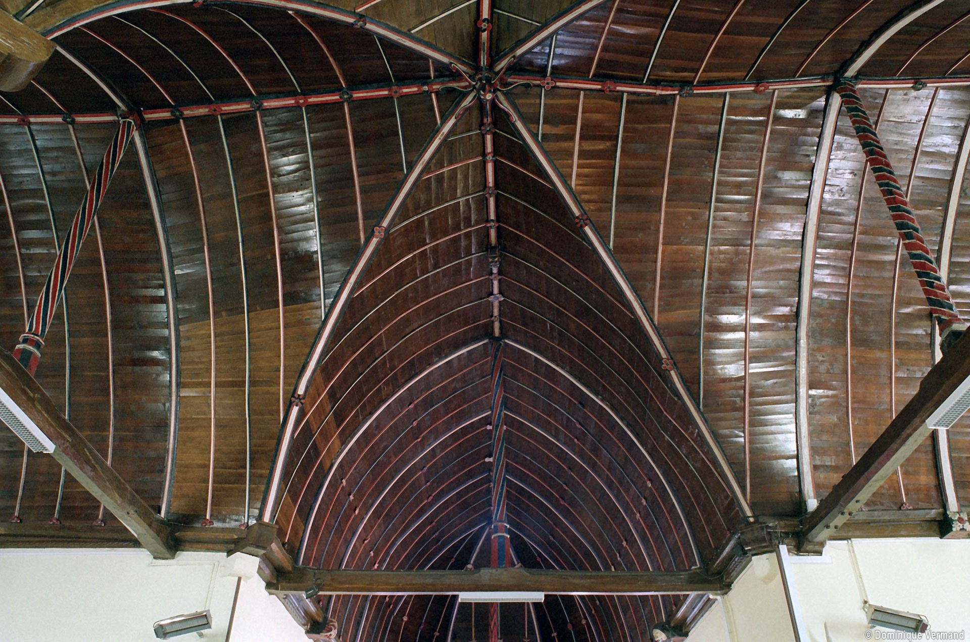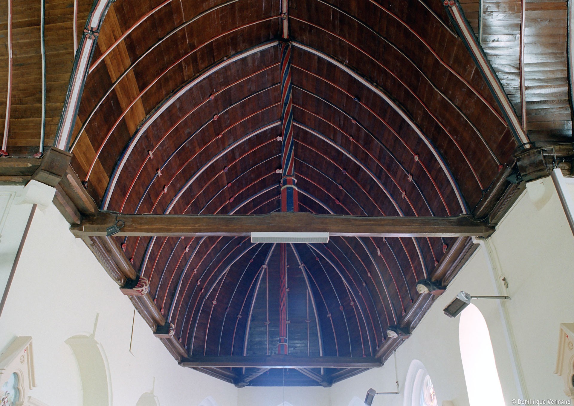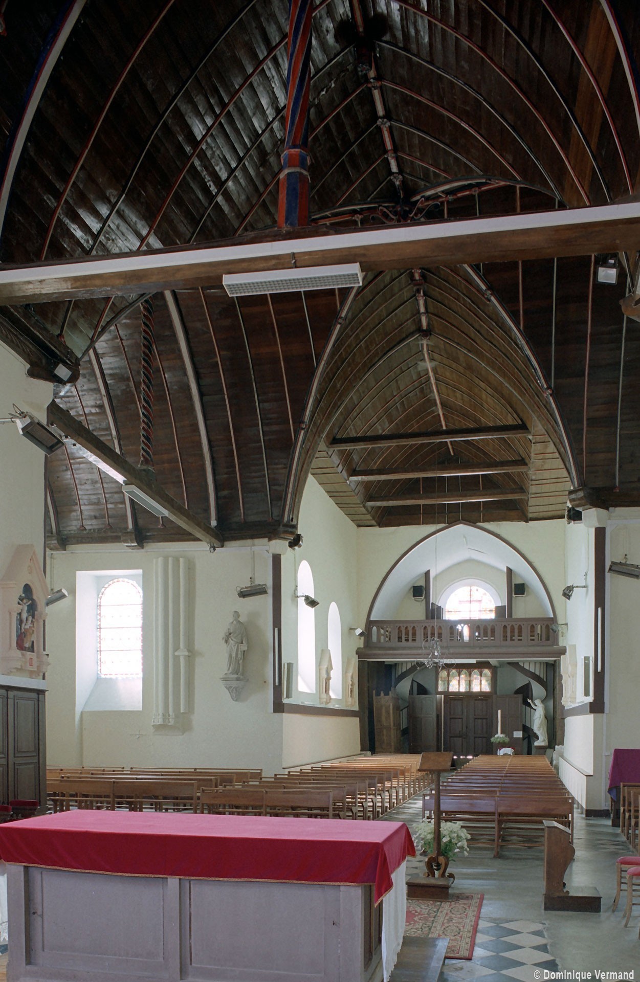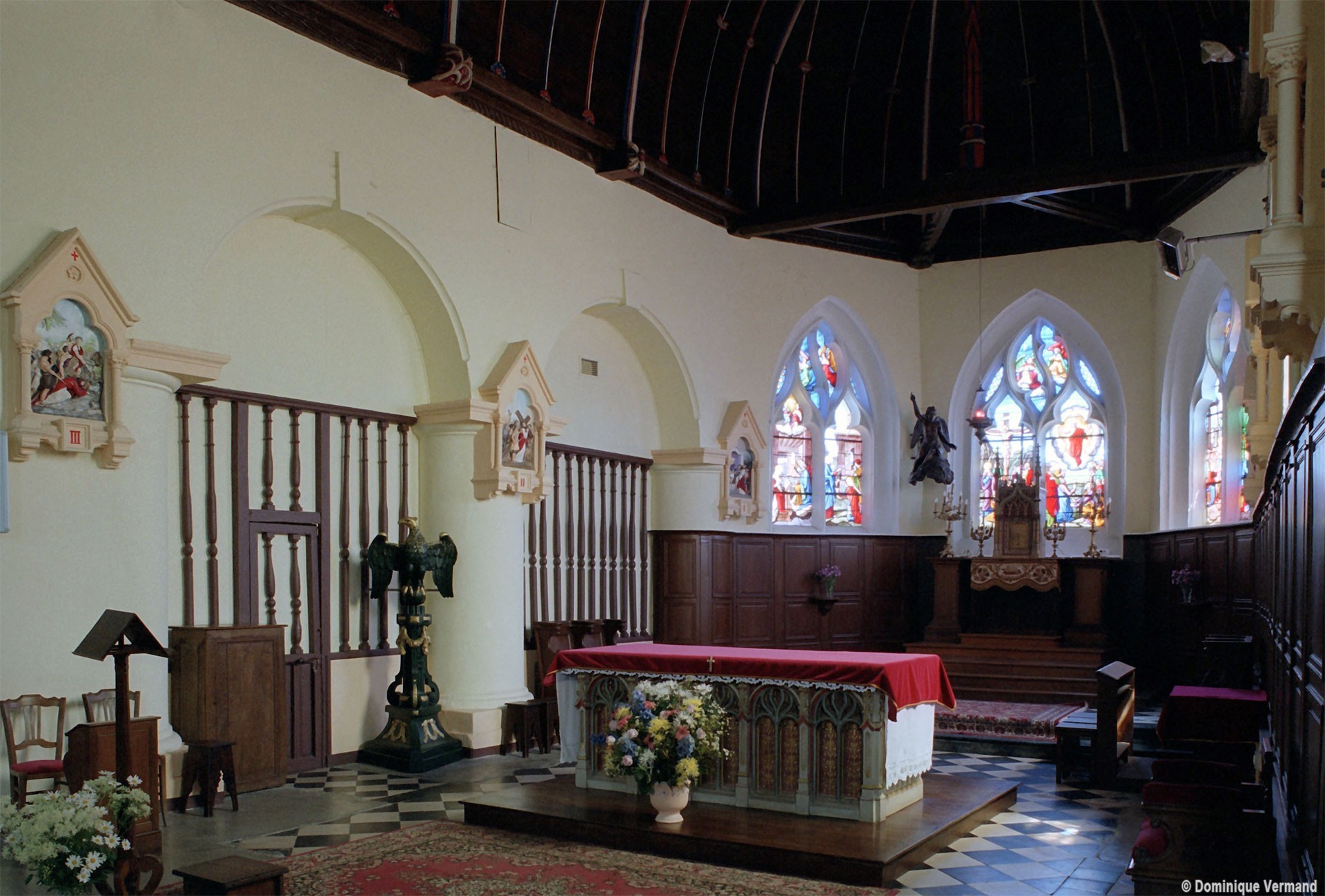 Partie la plus soignée, le choeur est percé de fenêtres à réseau flamboyant. Mais le principal intérêt de l’église est la magnifique charpente du 16ème siècle qui couvre le transept et le choeur et qui compte parmi les plus belles d’une région pourtant si riche à cet égard. En forme de carène renversée, elle est pourvue d’entraits (poutres horizontales) et de poinçons (poutres verticales), ces derniers sculptés en forme de torsade. Les sablières (poutres surmontant les murs) comportent des blochets sculptés et la clef des berceaux est décorée de petites fleurs. La polychromie rouge et bleue, d’origine, a été simplement rafraîchie.