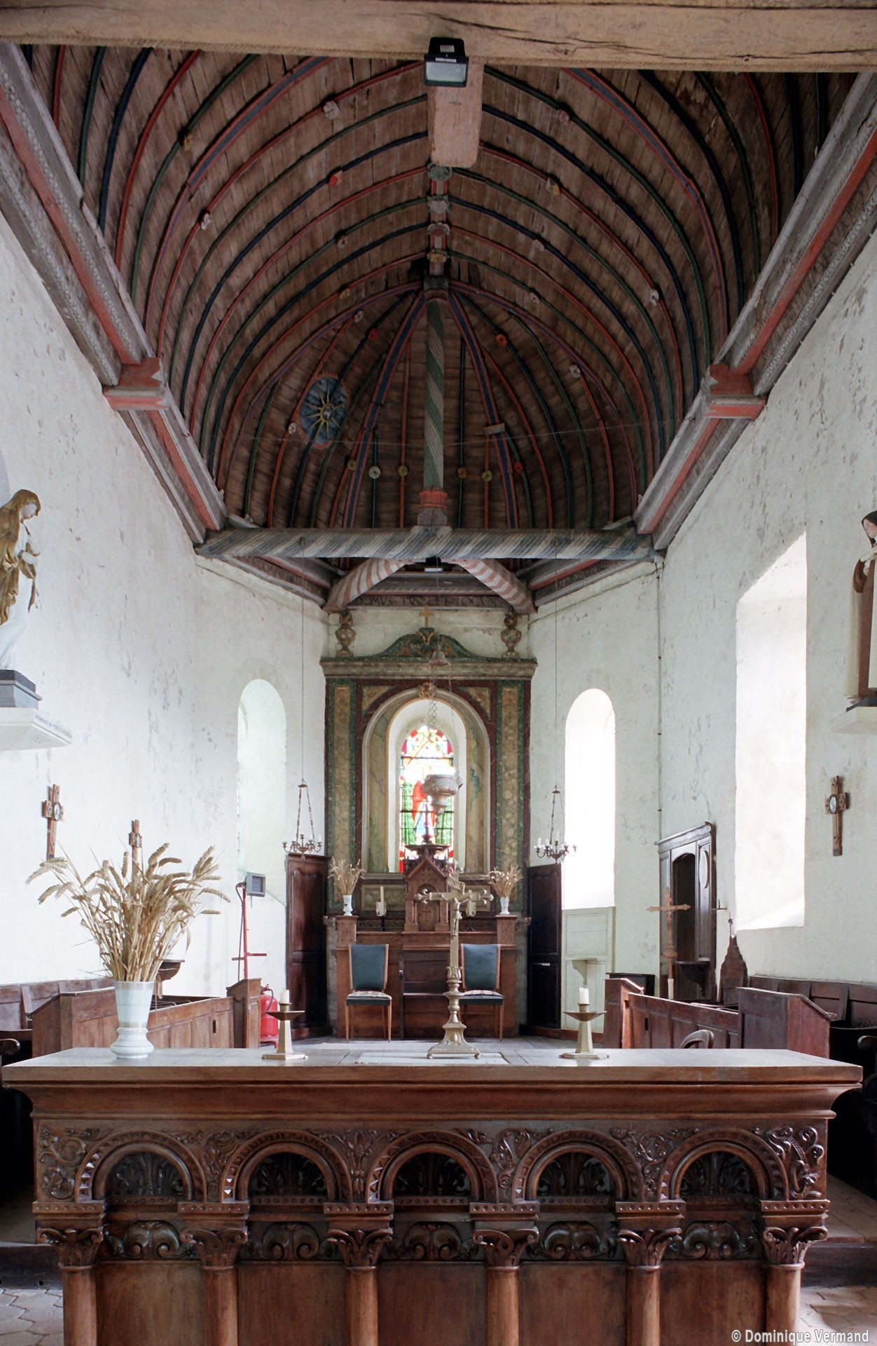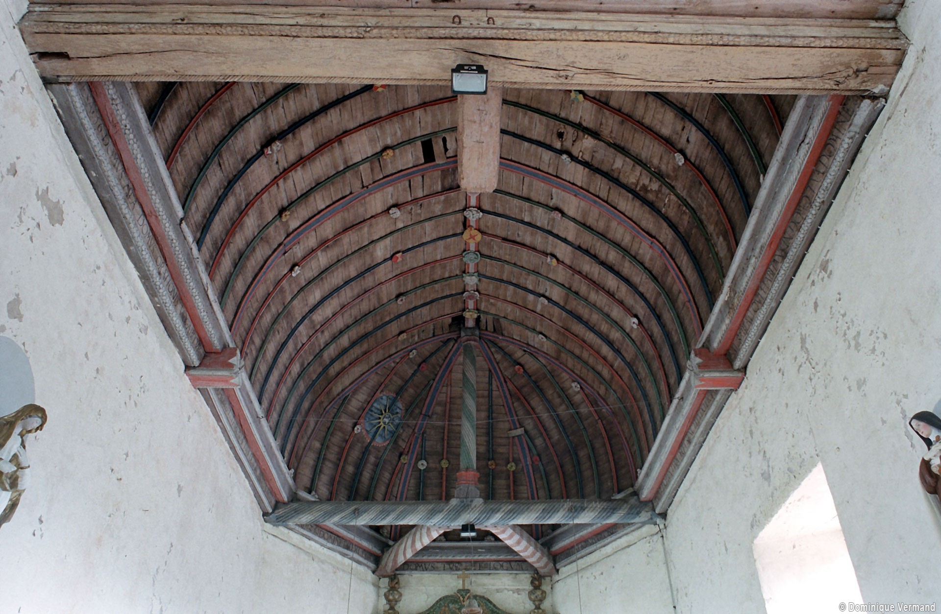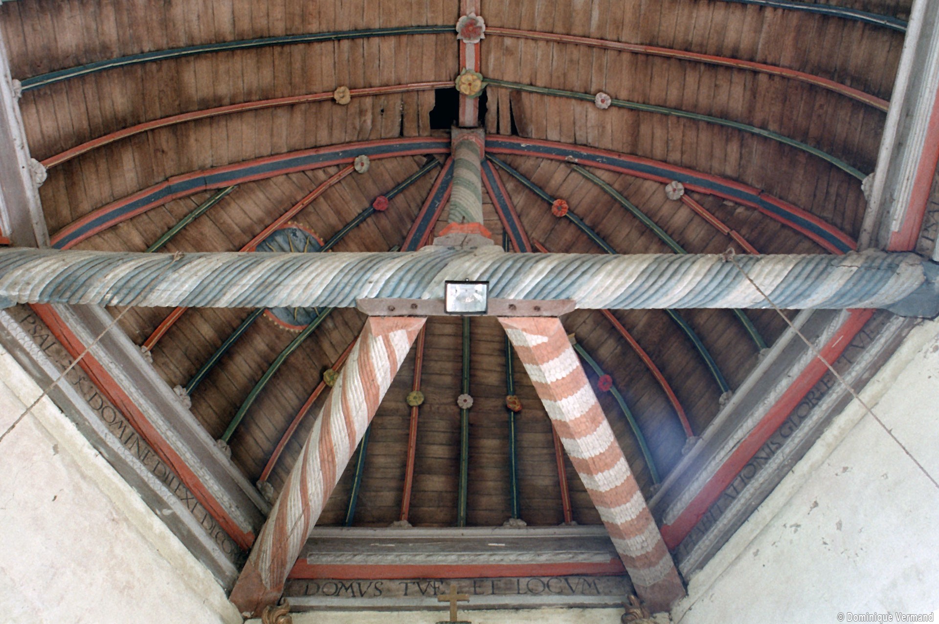 Le véritable trésor de Saint-Martin est l’exceptionnelle charpente du choeur, également du 16ème siècle. Son berceau en forme de carène renversée repose sur une sablière où court, tout du long, une inscription en latin. Les chevrons et la clef sont décorés principalement de petites fleurs et d’un grand soleil. Un entrait et un poinçon torsadés marquent la limite de l’abside et la polychromie en vert, blanc et rouge évoque certainement les couleurs d’origine (2007).