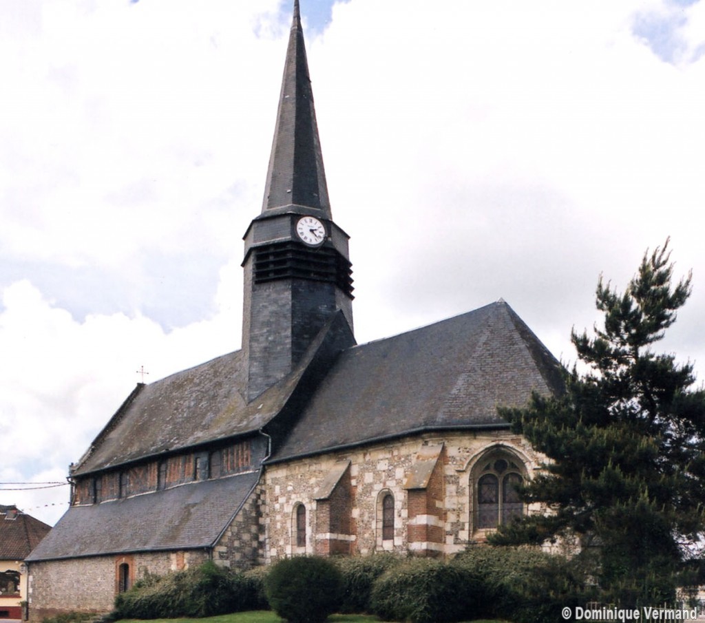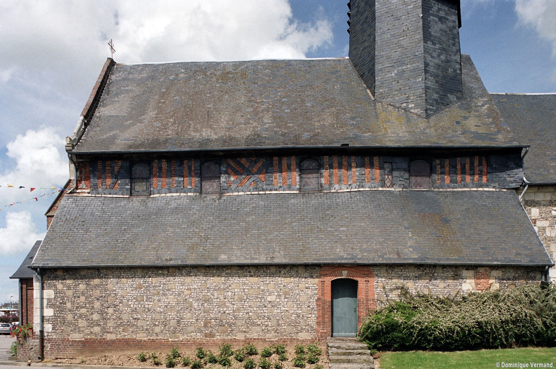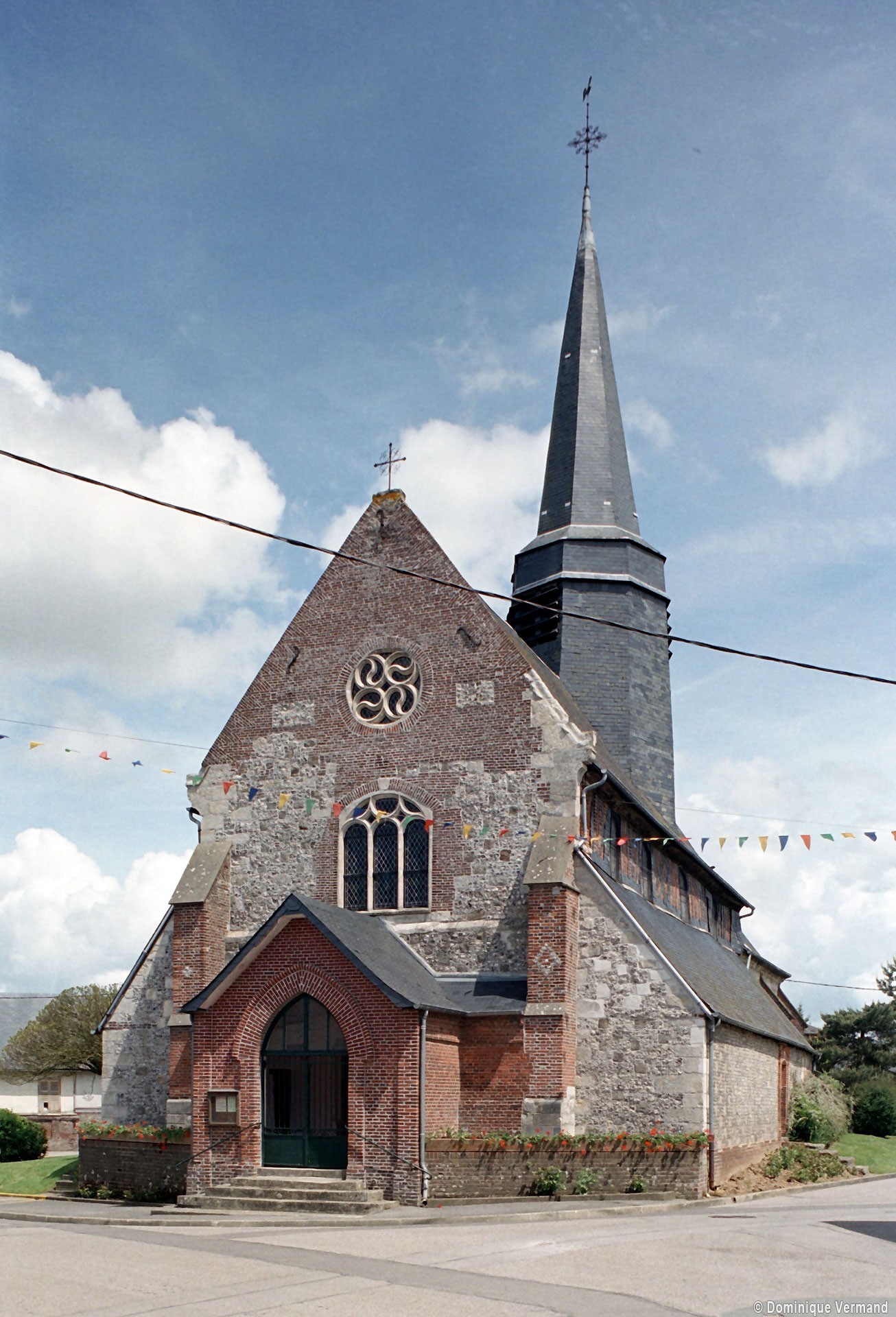 Les parties du 16ème siècle ont été construites, comme souvent dans la région, en appareil en damier mélangeant, selon les endroits, grès, pierre crayeuses, silex et petits moellons. Le choeur est percé de trois grandes fenêtres à l’abside (le remplage, de style renaissance, a été refait) et de quatre petites fenêtres en plein cintre dans la travée droite. En partie cachée par le porche, la façade est de la même époque, mais la grande fenêtre en cintre surbaissé et le pignon en briques avec sa rose sont du 19ème siècle. Les murs gouttereaux de la nef sont curieusement bâtis selon la technique du colombage, ici en briques et bois, ce dernier recouvert d’ardoises. Cette particularité résulte d’une reconstruction du vaisseau central de la nef effectuée au 17ème siècle. Sans doute, jusque-là, aligné sur le choeur, le vaisseau central sera alors élargi au détriment des bas-côtés.