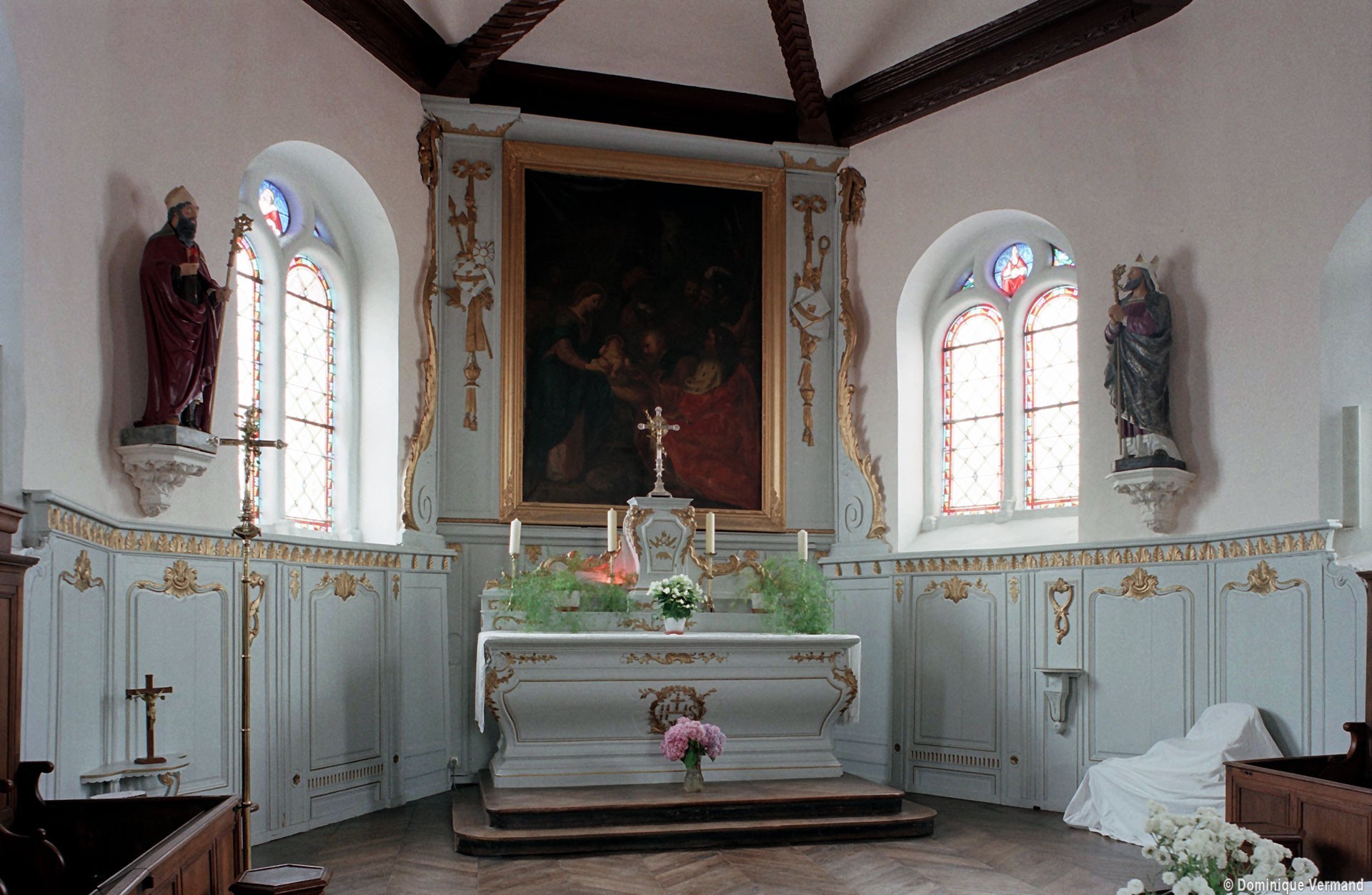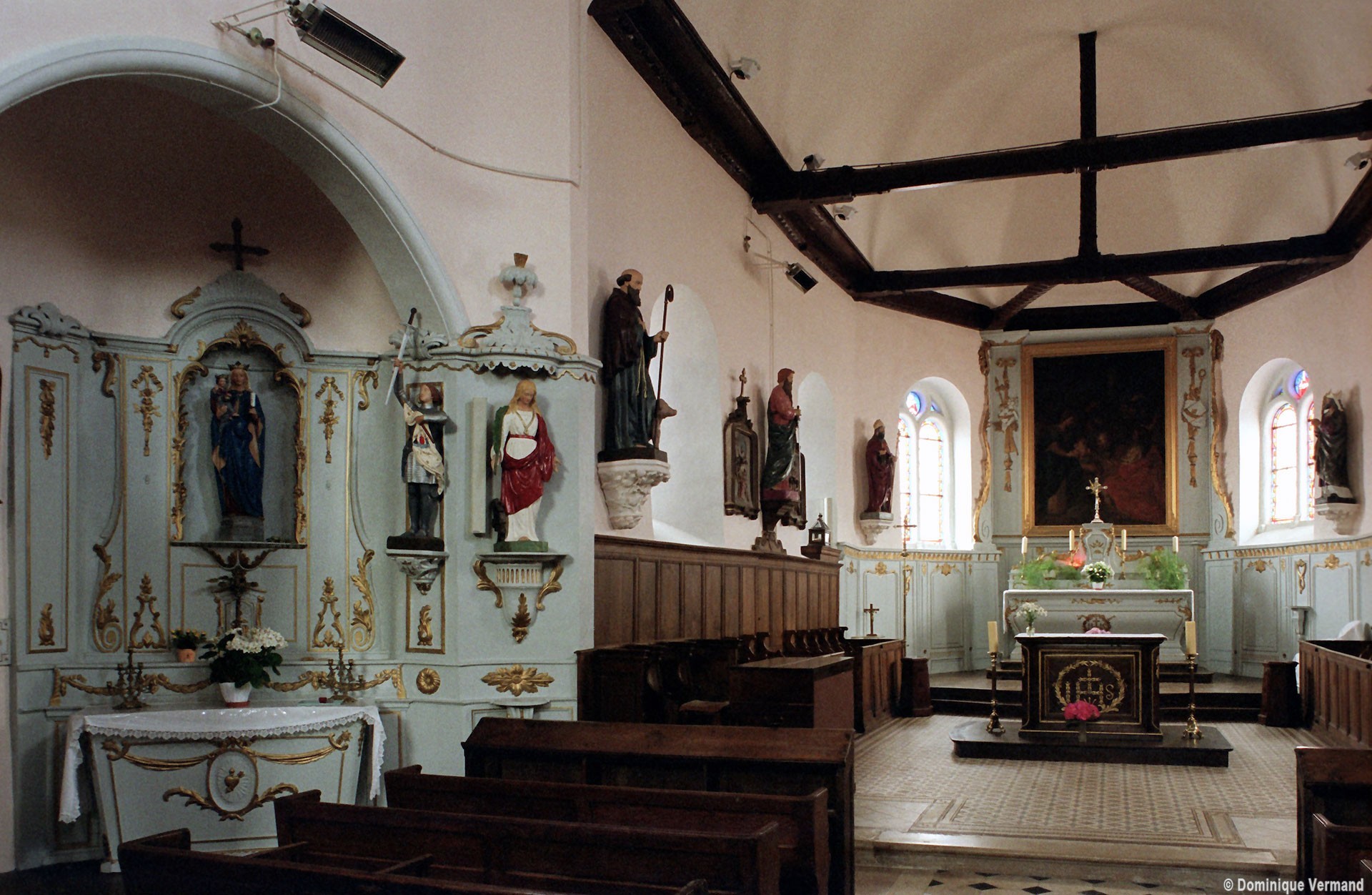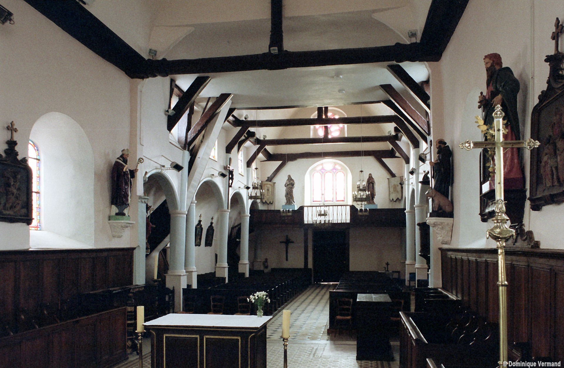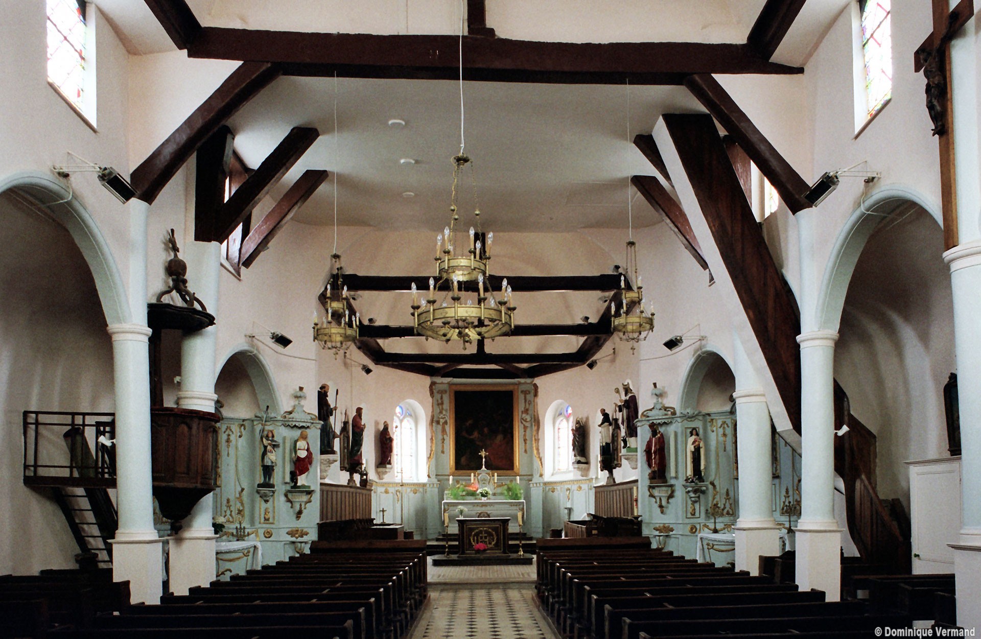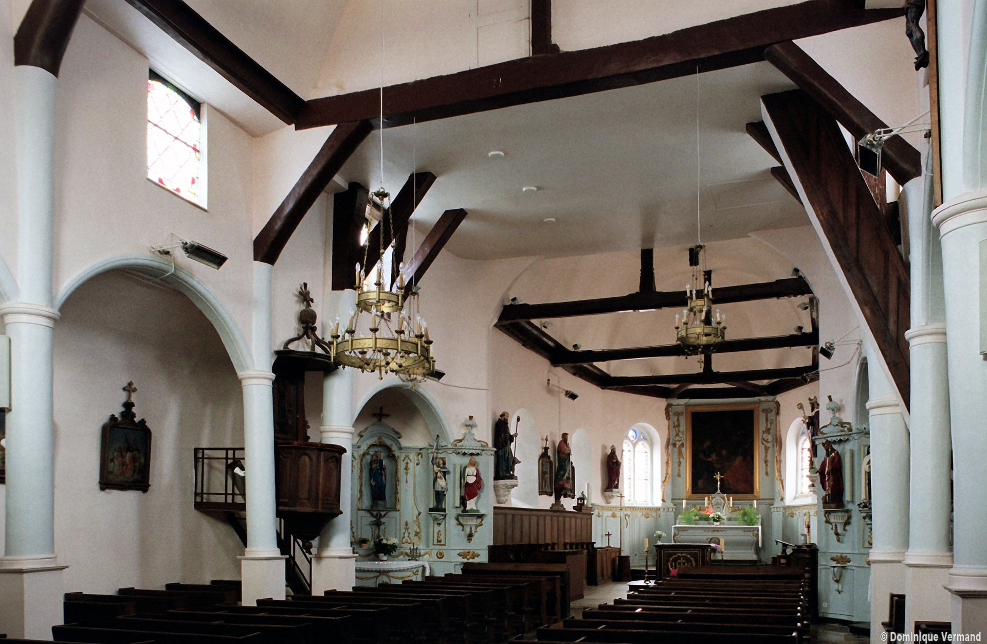 Deux des quatre travées qui le composent sont irrégulières : la troisième, très étroite, correspond au haut clocher octogonal en charpente et ardoises et la quatrième adopte un plan légèrement trapézoïdal permettant le raccord avec le choeur plus étroit. Les arcades, en bois, sont composées d’un cintre surbaissé et de minces colonnes. Réalisée pourtant avec des moyens économiques, la nef ainsi modifiée atteint à un réel effet monumental en annexant, visuellement, le choeur grâce à la forme de sa dernière travée. Cet effet est renforcé par les boiseries Louis XVI avec autel secondaire qui, de chaque côté, habillent cette travée et composent avec celles de l’abside un ensemble cohérent d’une qualité tout à fait remarquable. Datant du 16ème siècle et donc contemporaine de celui-ci, la charpente du choeur mérite l’attention tandis que celle de la nef a été reprise lors des travaux d’élargissement (2007).