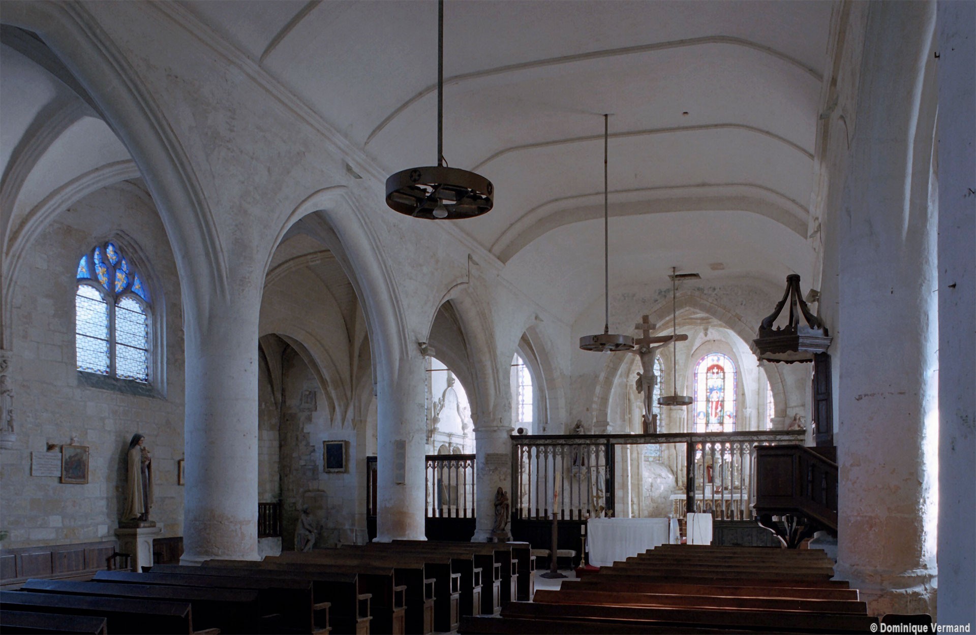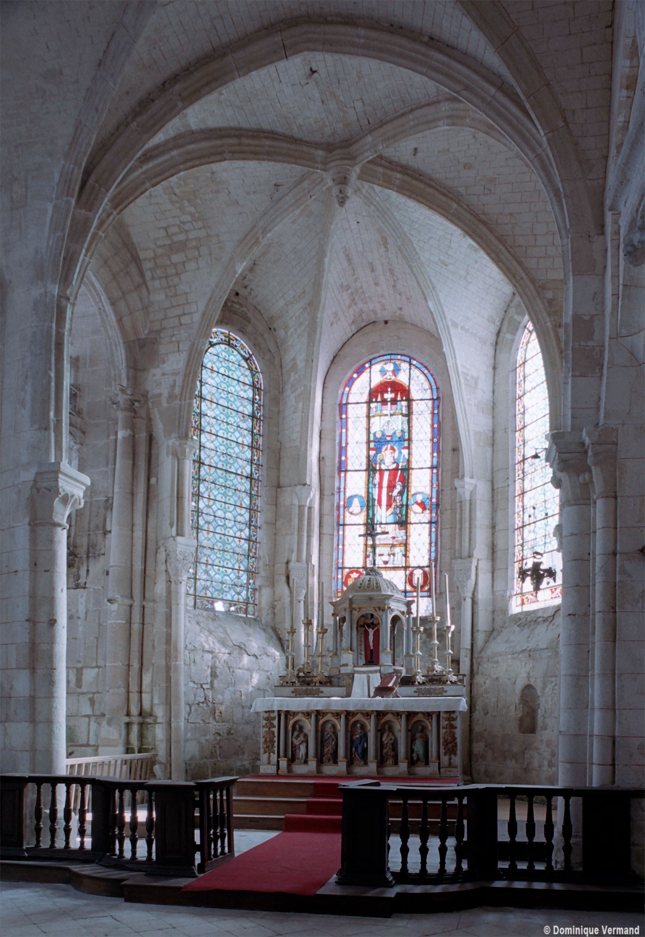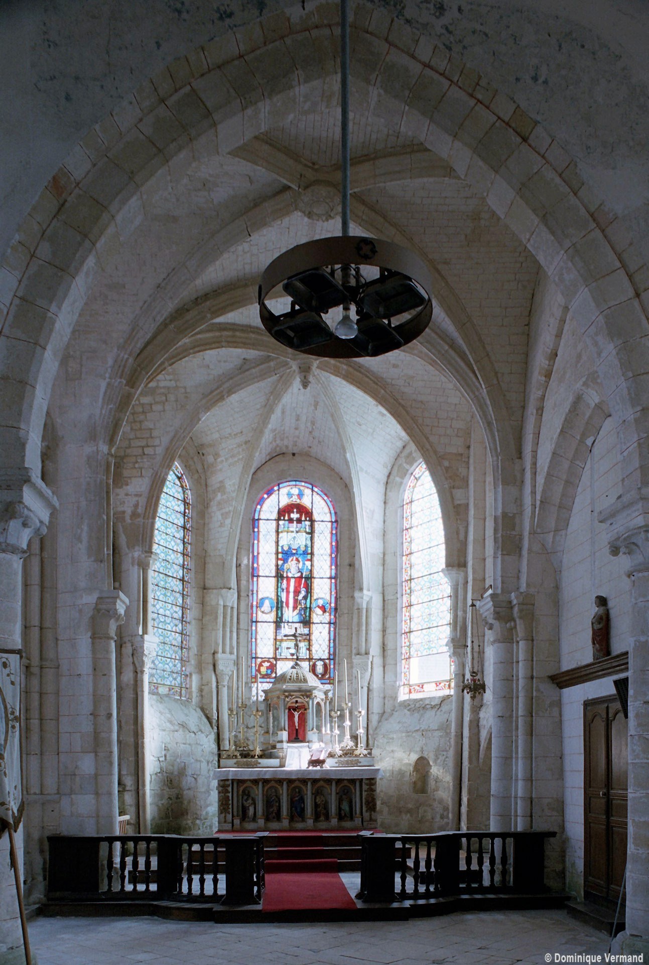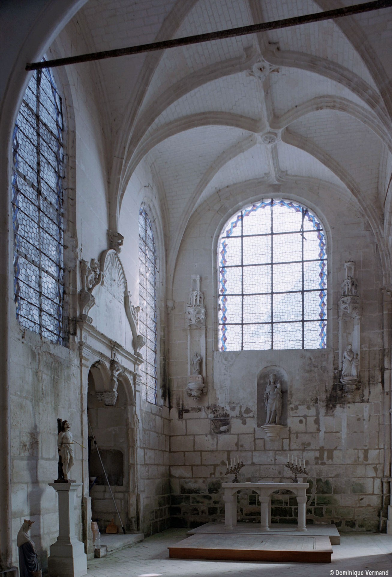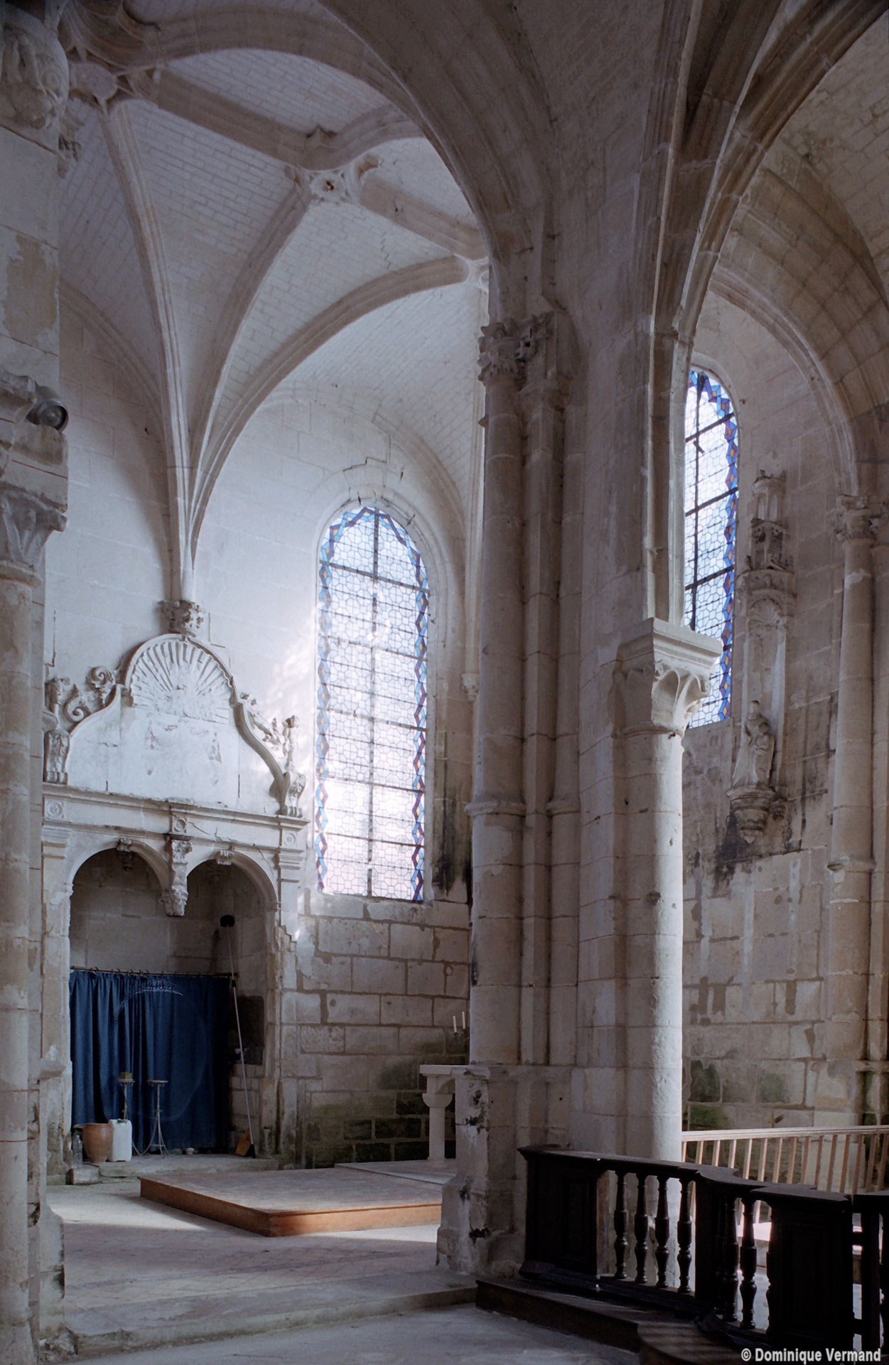Implanté en bordure du parc du château, Saint-Martin est un vaste édifice à l’histoire monumentale particulièrement tourmentée. La chronologie appelle d’abord le choeur, composé d’une travée droite et d’une abside à cinq pans, datable vers 1200 d’après les quelques chapiteaux authentiques conservés, notamment ceux associés à l’arc triomphal. Les voûtes, comme les fenêtres, ont été refaites au 16ème siècle, puis restaurées au 19ème.