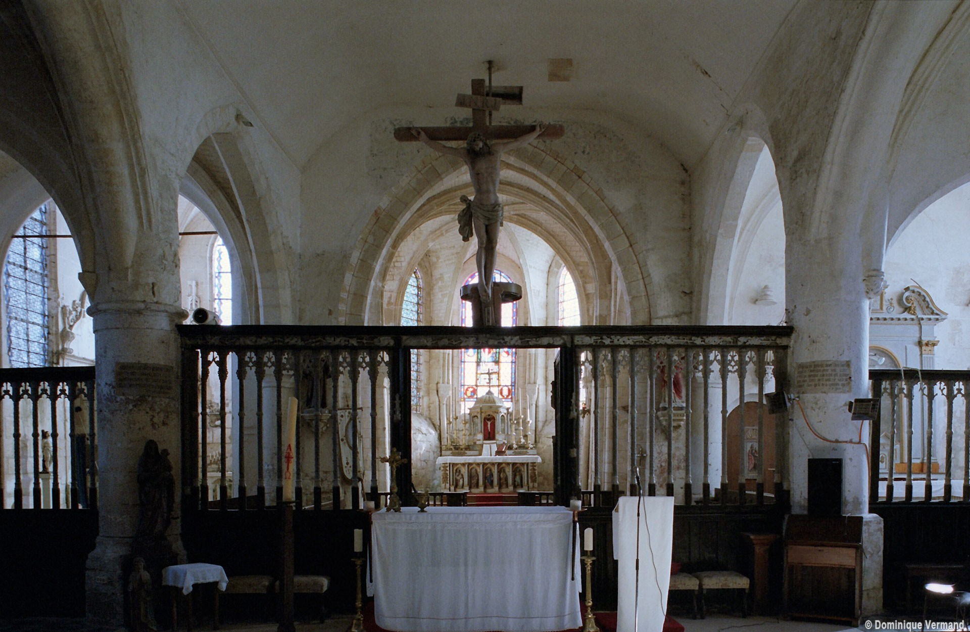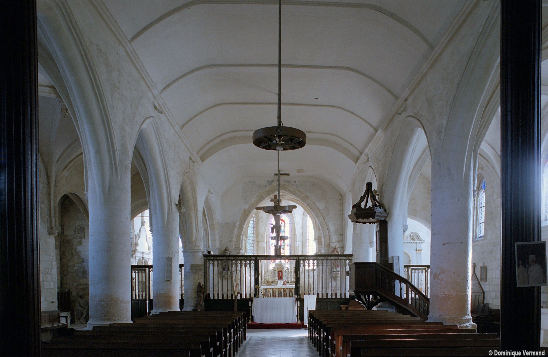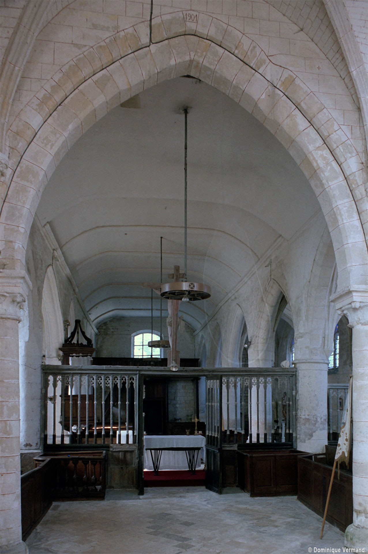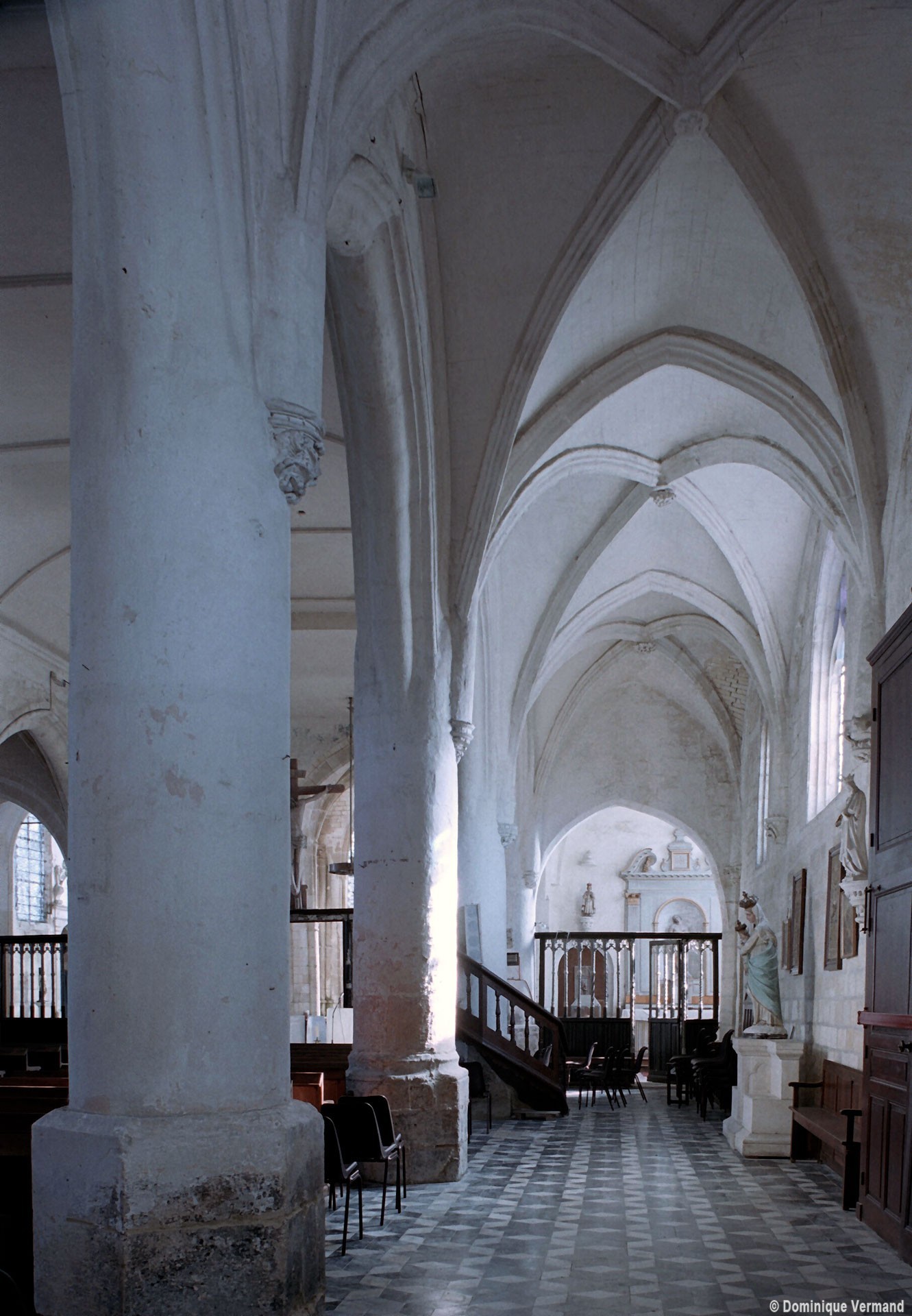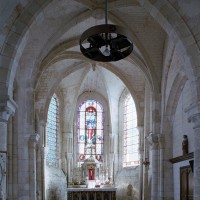 Implanté en bordure du parc du château, Saint-Martin est un vaste édifice à l’histoire monumentale particulièrement tourmentée. La chronologie appelle d’abord le choeur, composé d’une travée droite et d’une abside à cinq pans, datable vers 1200 d’après les quelques chapiteaux authentiques conservés, notamment ceux associés à l’arc triomphal. Les voûtes, comme les fenêtres, ont été refaites au 16ème siècle, puis restaurées au 19ème.