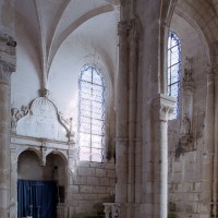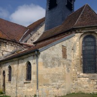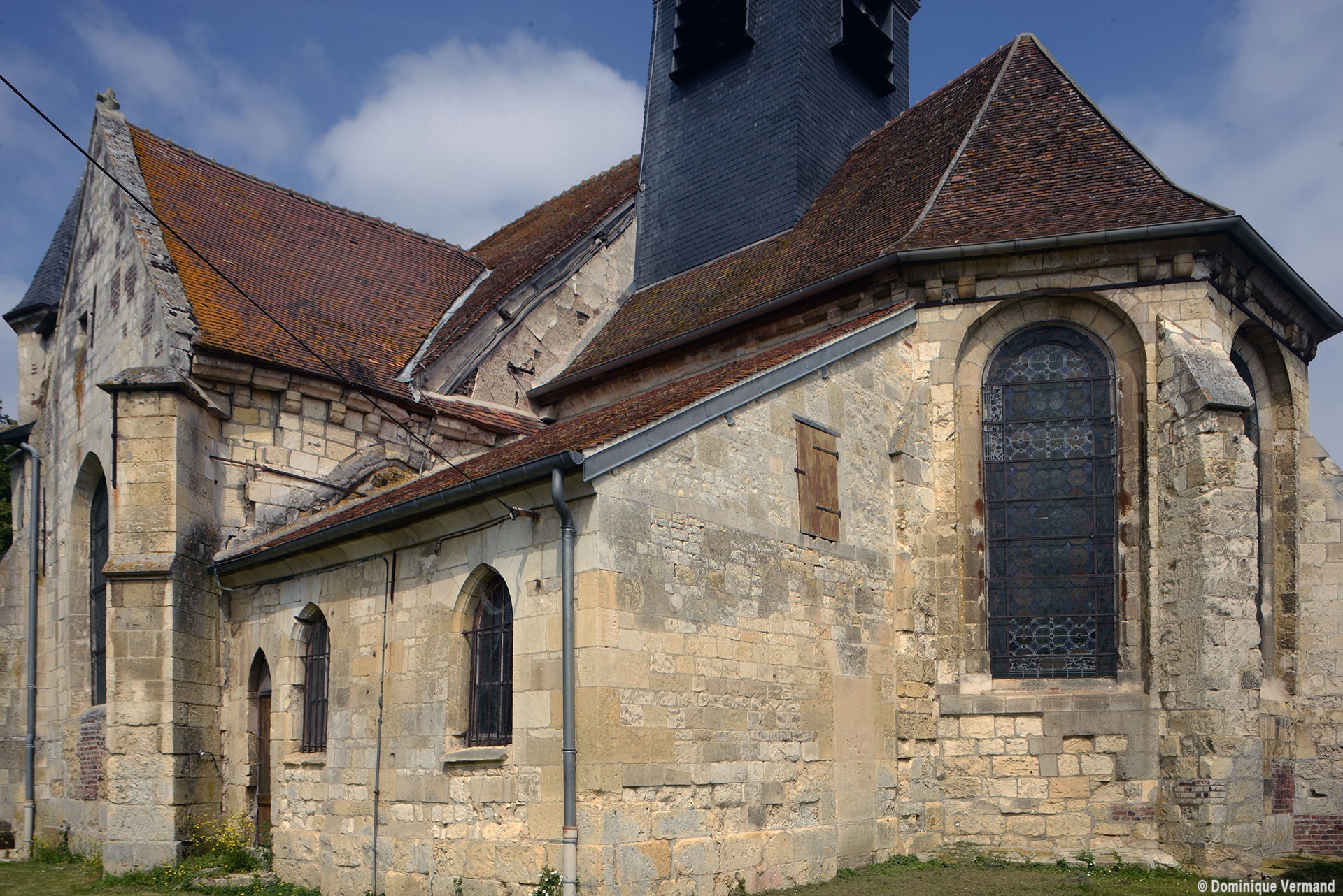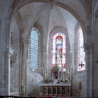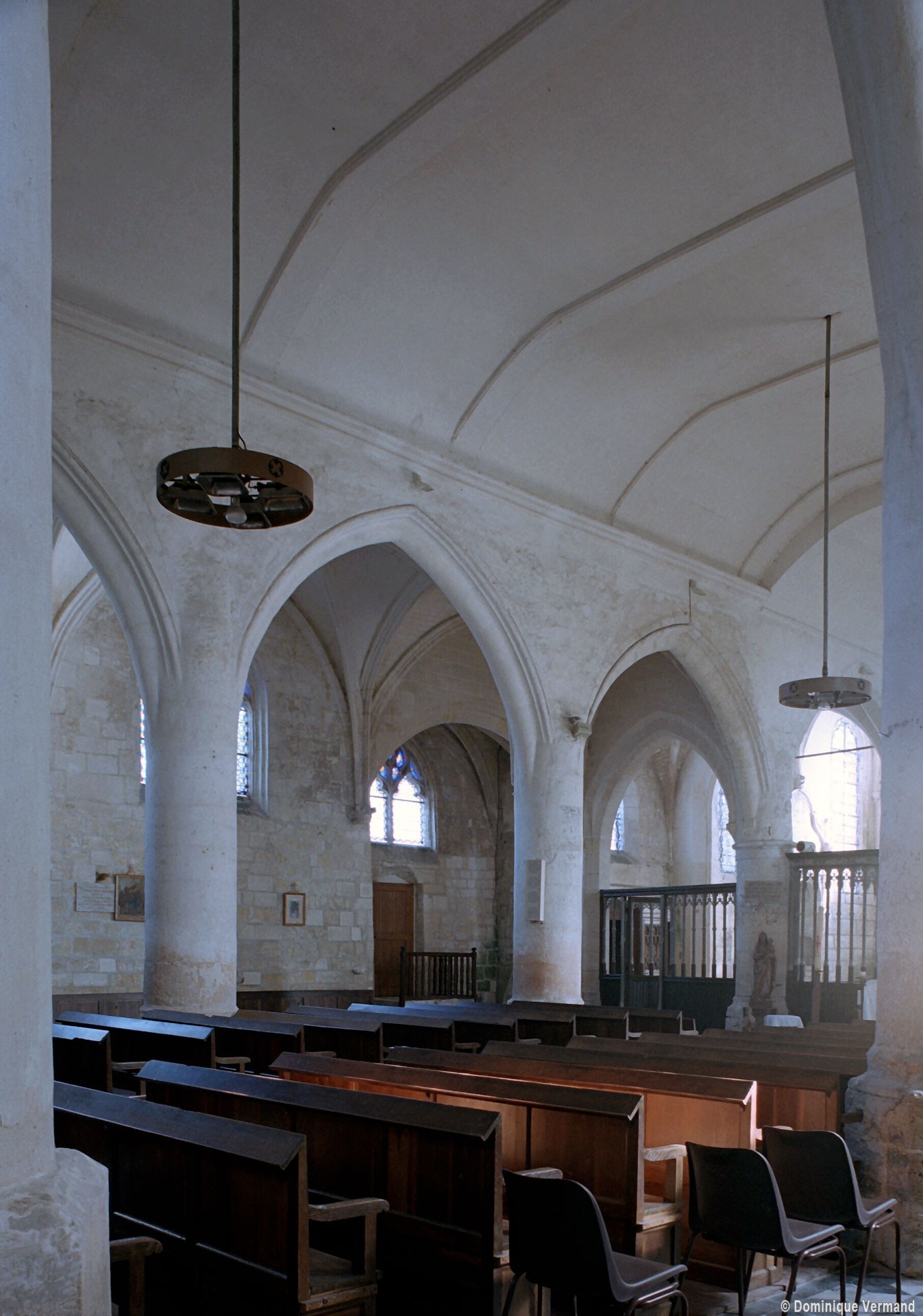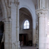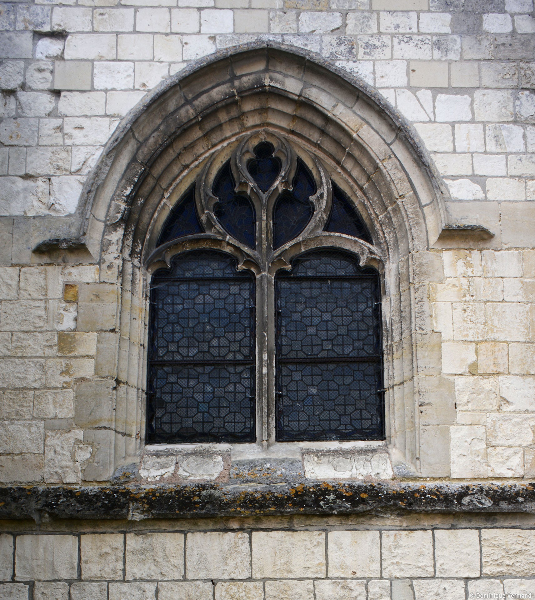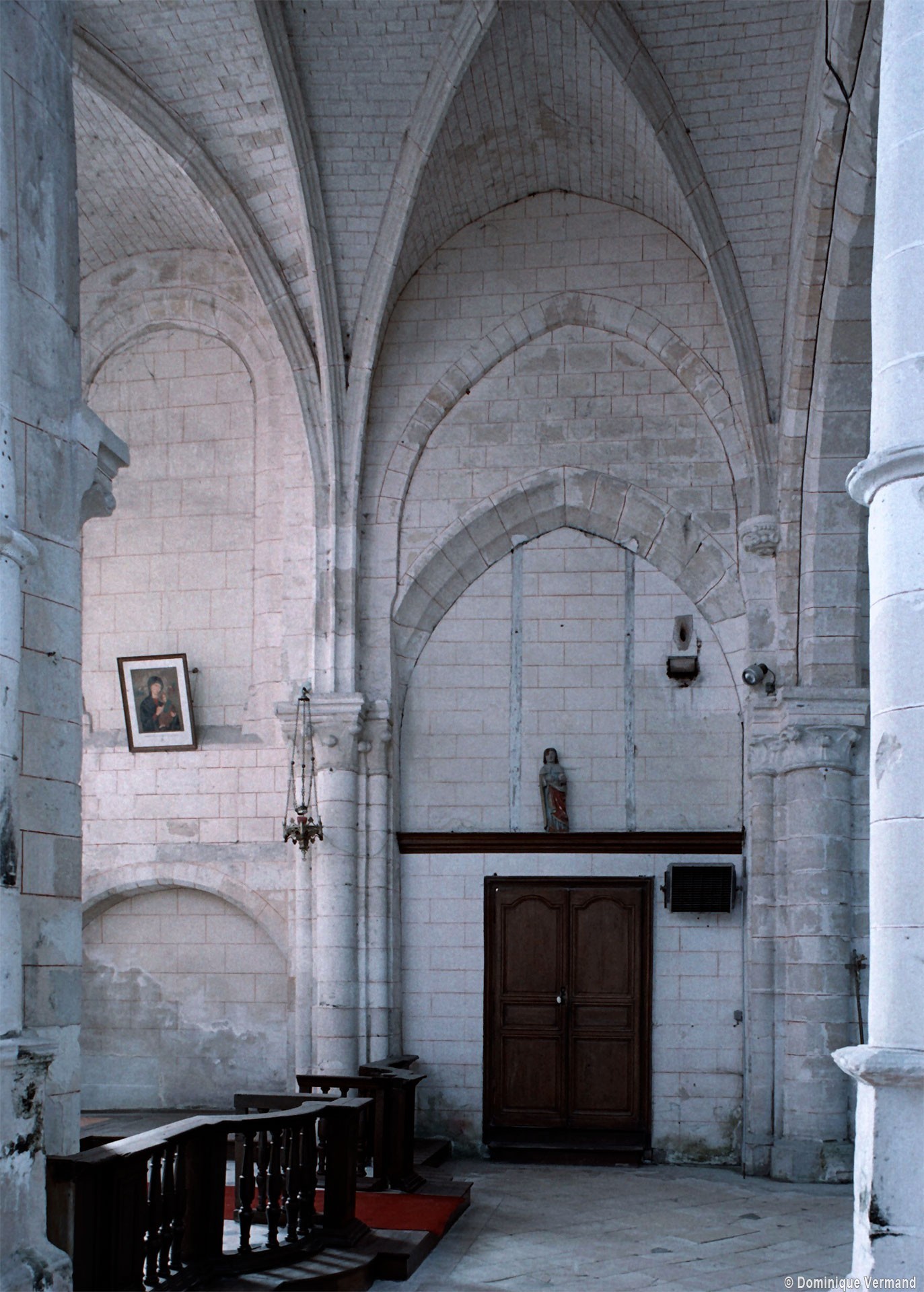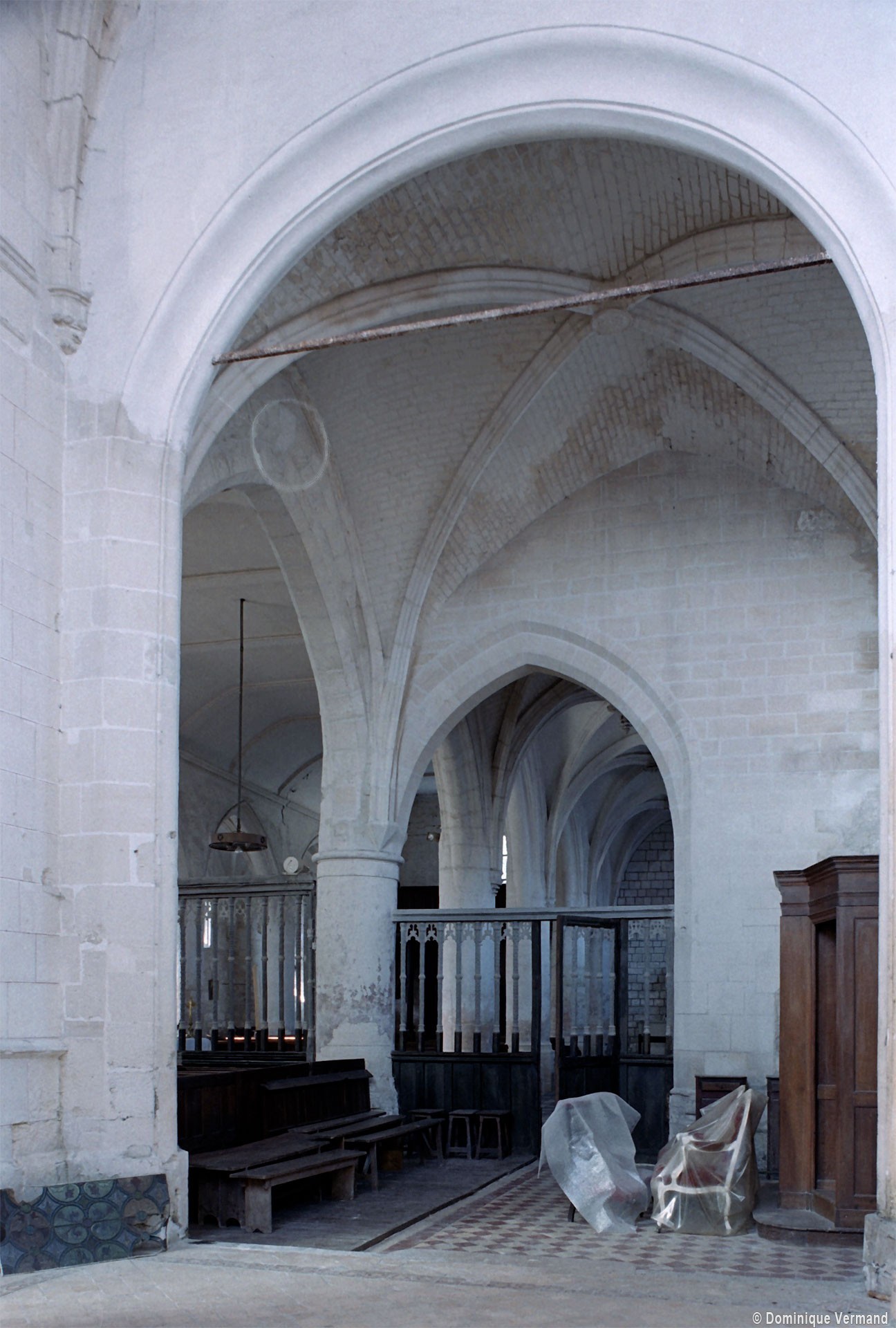 Implanté en bordure du parc du château, Saint-Martin est un vaste édifice à l’histoire monumentale particulièrement tourmentée. La chronologie appelle d’abord le choeur, composé d’une travée droite et d’une abside à cinq pans, datable vers 1200 d’après les quelques chapiteaux authentiques conservés, notamment ceux associés à l’arc triomphal. Les voûtes, comme les fenêtres, ont été refaites au 16ème siècle, puis restaurées au 19ème.