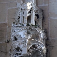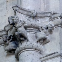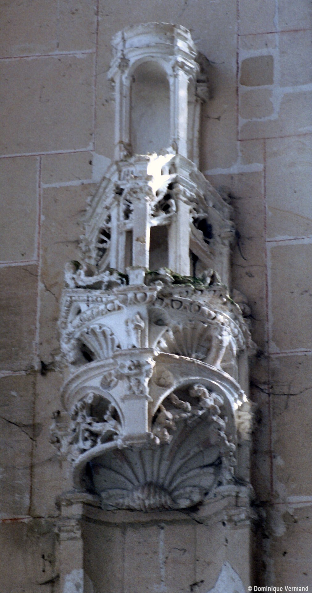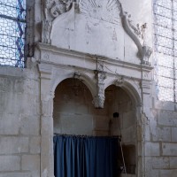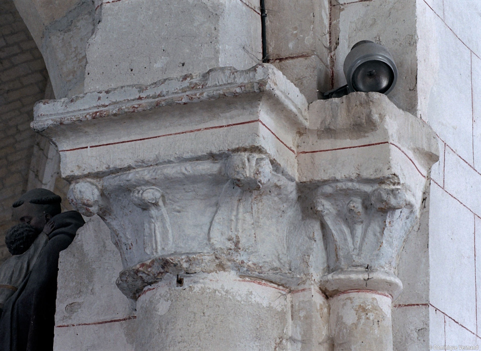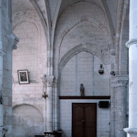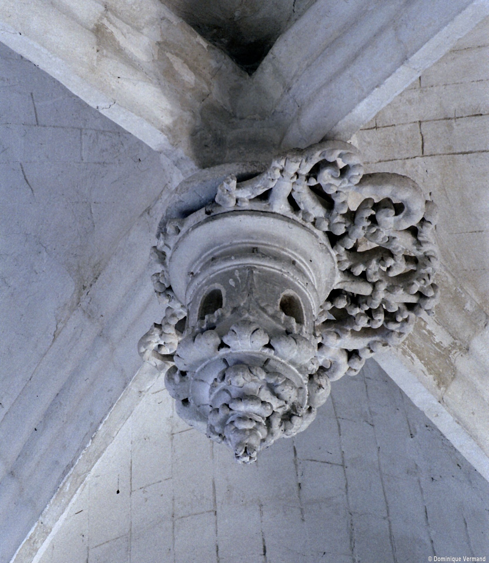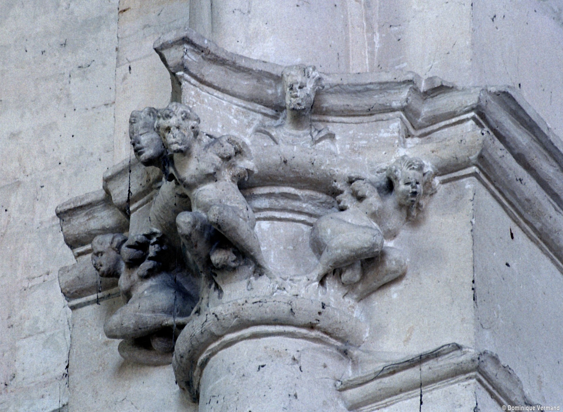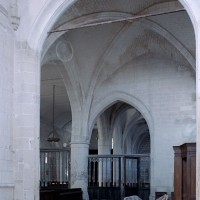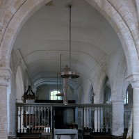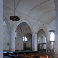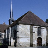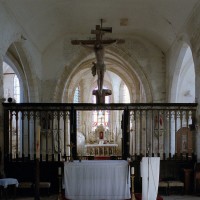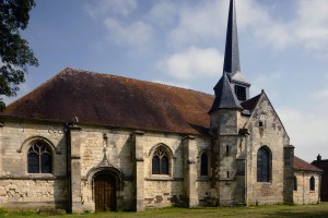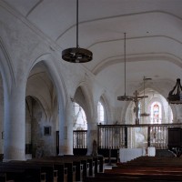 Implanté en bordure du parc du château, Saint-Martin est un vaste édifice à l’histoire monumentale particulièrement tourmentée. La chronologie appelle d’abord le choeur, composé d’une travée droite et d’une abside à cinq pans, datable vers 1200 d’après les quelques chapiteaux authentiques conservés, notamment ceux associés à l’arc triomphal. Les voûtes, comme les fenêtres, ont été refaites au 16ème siècle, puis restaurées au 19ème.