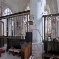 C’est tout ce qui reste de l’église médiévale (une interrogation subsiste pour le mur oriental du transept sud), largement reconstruite au 15ème siècle si l’on en croit Graves, qui date la belle porte latérale ouverte au sud de la nef de 1460 et évoque une dédicace en 1487. La nef et le transept appartiennent effectivement, par leur style, à la dernière période du gothique, dit flamboyant. Les quatre travées du vaisseau central – qui est aveugle et couvert d’un lambris – communiquent avec les bas-côtés par de grandes arcades retombant par pénétration dans des piles circulaires. Les bas-côtés comportent des voûtes d’ogives reçues sur des culs-de-lampe sculptés. Toutes les fenêtres ont un réseau flamboyant.