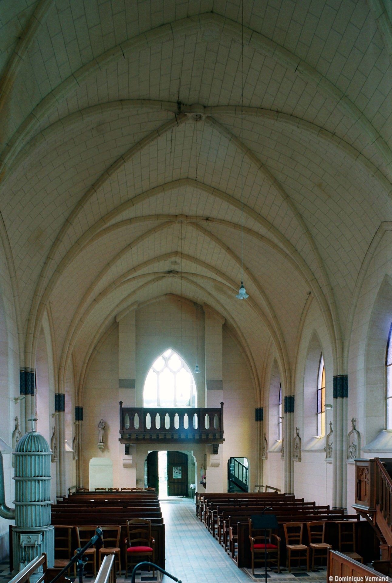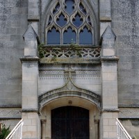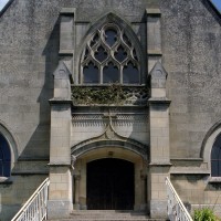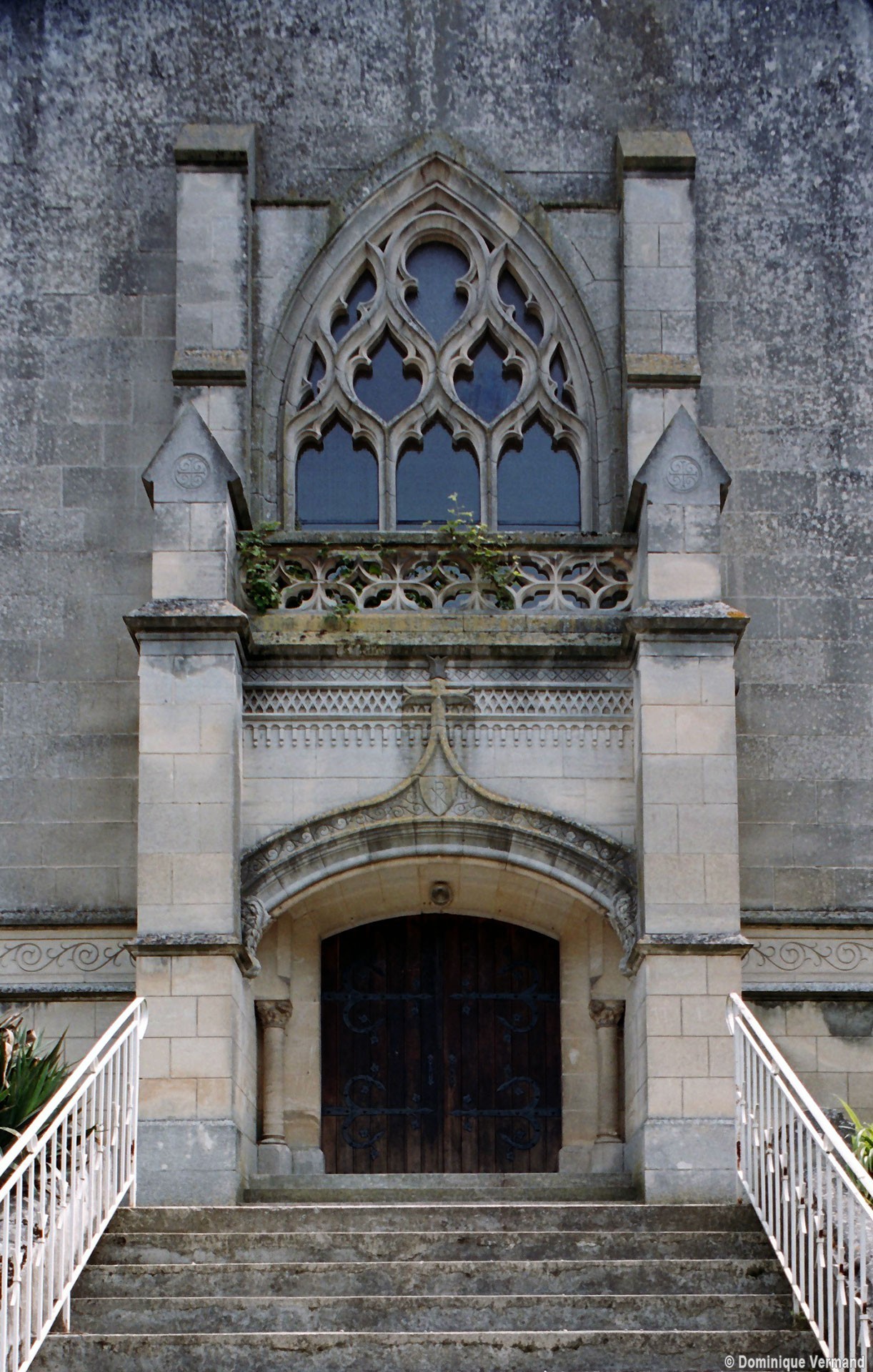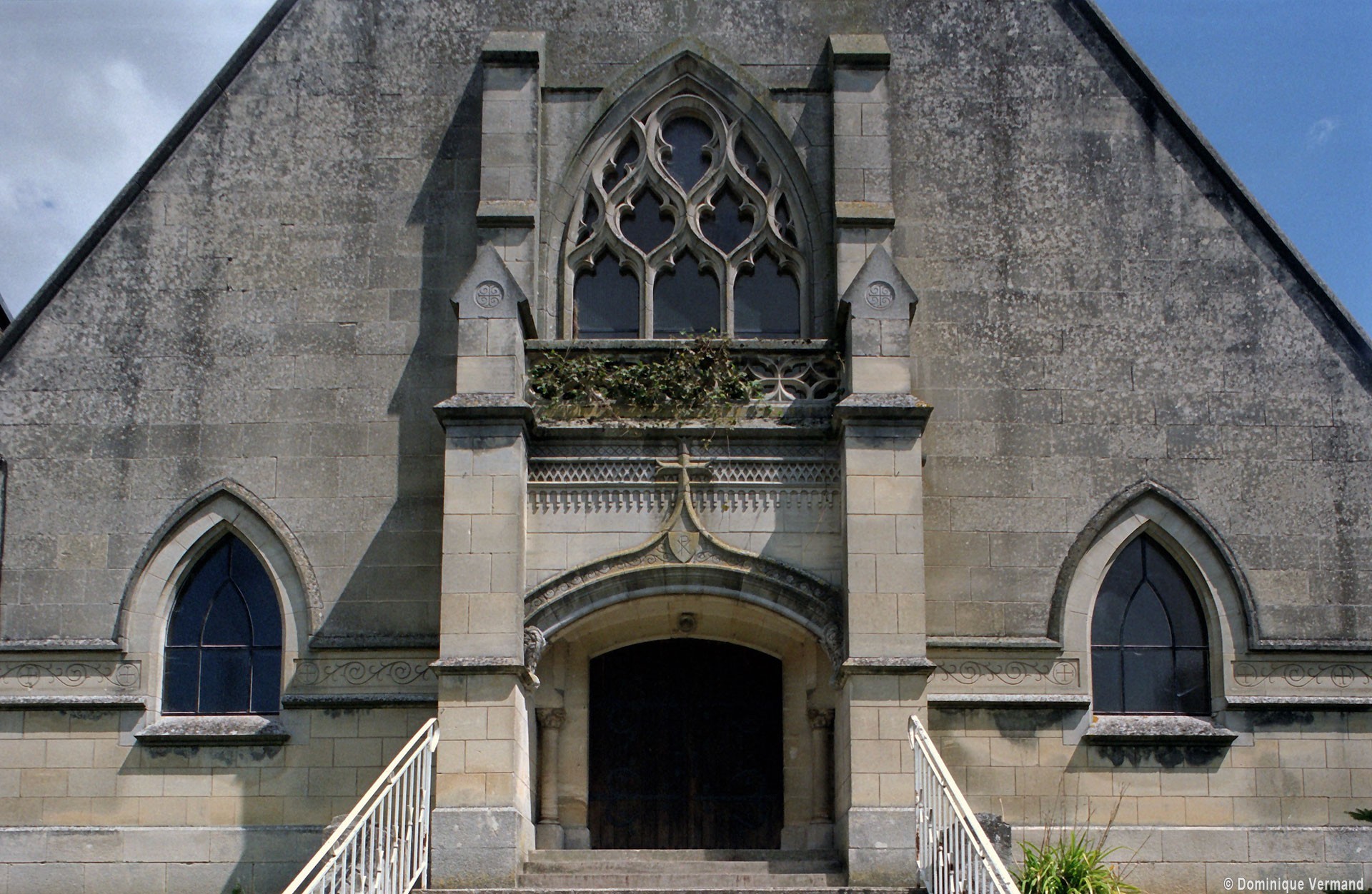 Formant un grand mur-pignon couronné d’un petit clocher octogonal, elle comporte une partie centrale à la riche composition de style gothique flamboyant qui ne doit pourtant rien au souvenir de l’édifice précédent. Au-dessus d’un portail en cintre surbaissé formant porche, une balustrade très ouvragée précède une grande fenêtre dont le réseau ne déparerait pas dans une église des 15ème ou 16ème siècles. Une tribune lui correspond à l’intérieur, où deux annexes abritent le baptistère et la cage d’escalier (2008)