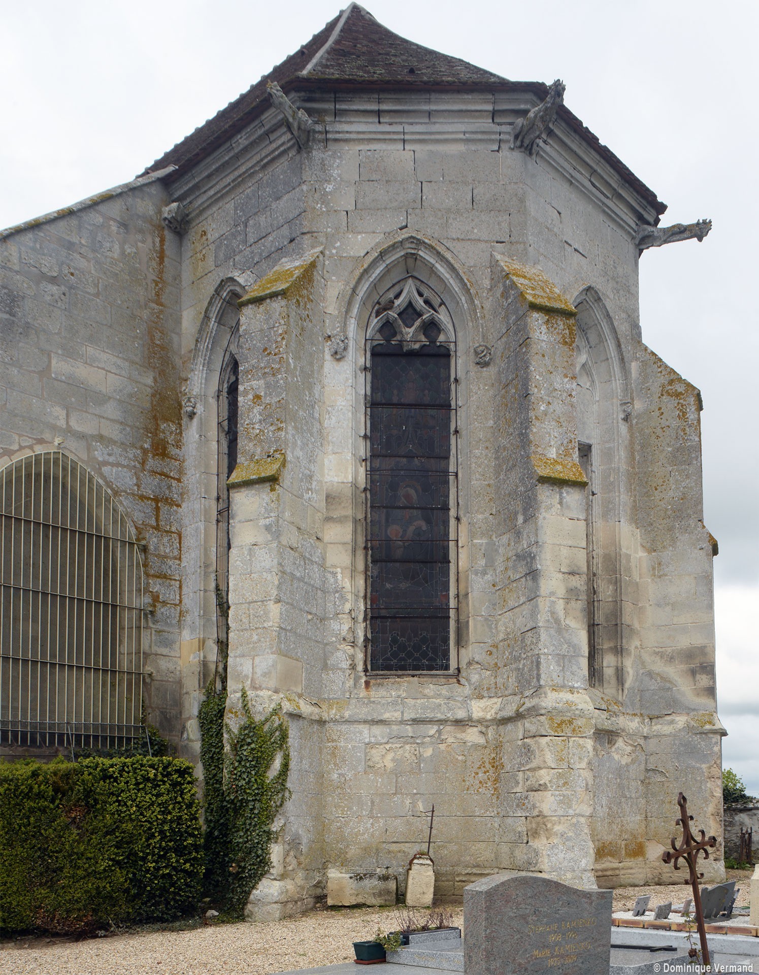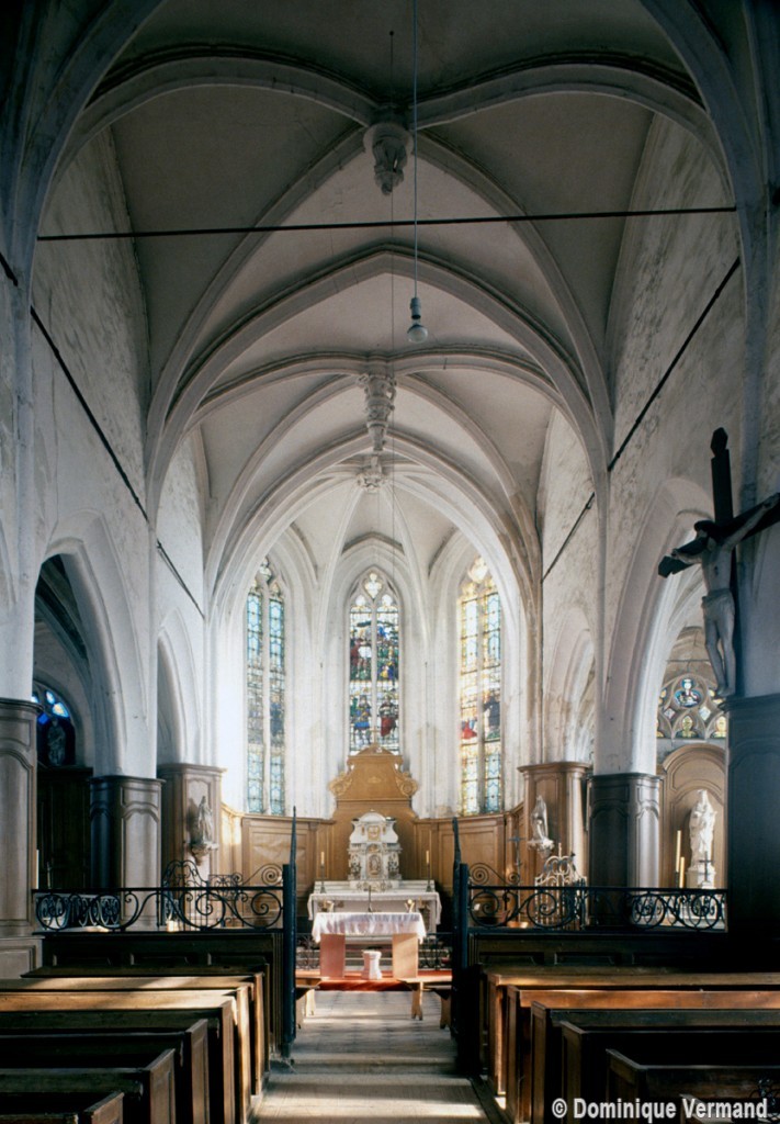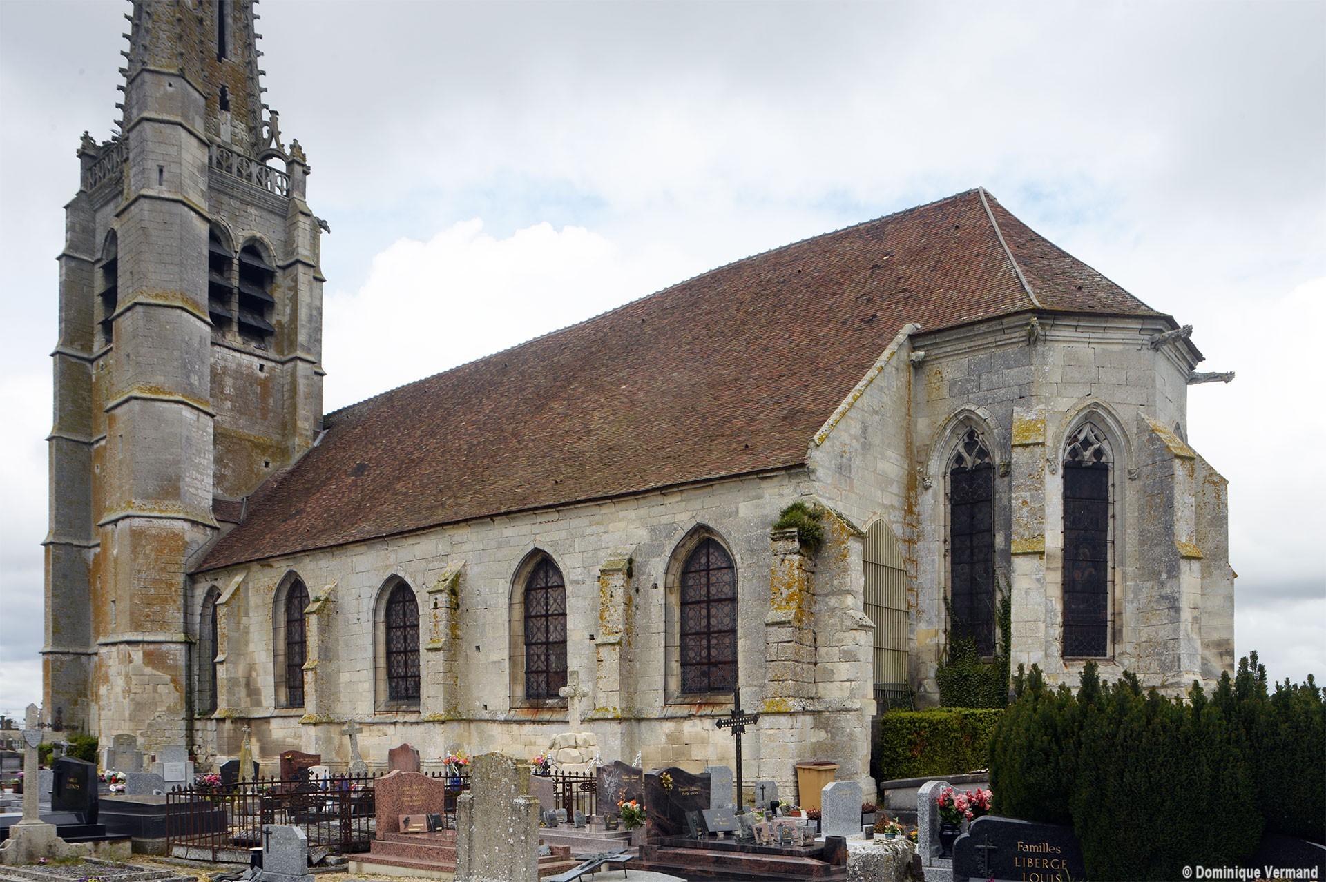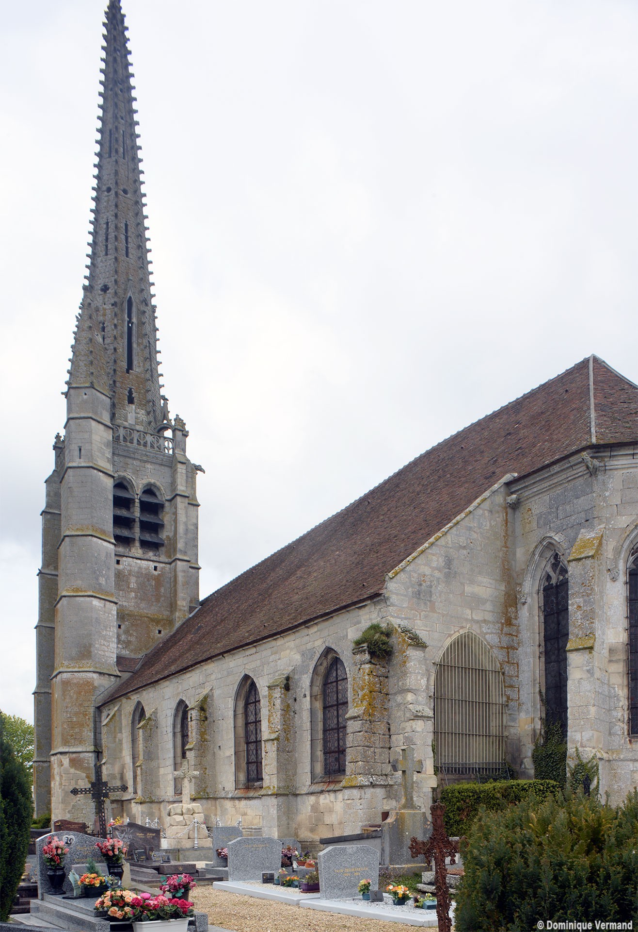 Pour le reste, l’église est du 16ème siècle : vers 1510-1520 pour l’essentiel de l’édifice et vers 1540-1550 pour le portail et le clocher. Son vaisseau central, long de six travées, comporte deux niveaux mais le second est aveugle et caractéristique de la structure dite en halle-basilique. La lumière n’est donc reçue que par les fenêtres des bas-côtés. Il se termine par une abside pentagonale éclairée de hautes fenêtres à remplage flamboyant tandis que le clocher est assis sur la première travée du bas-côté sud. Arcades et ogives des voûtes pénètrent directement dans les piles qui les reçoivent sans l’intermédiaire de chapiteaux. A quelques variantes près, les églises de Baron, Ognes et Versigny, pour ne citer que des exemples géographiquement proches, offrent les mêmes dispositions d’ensemble.