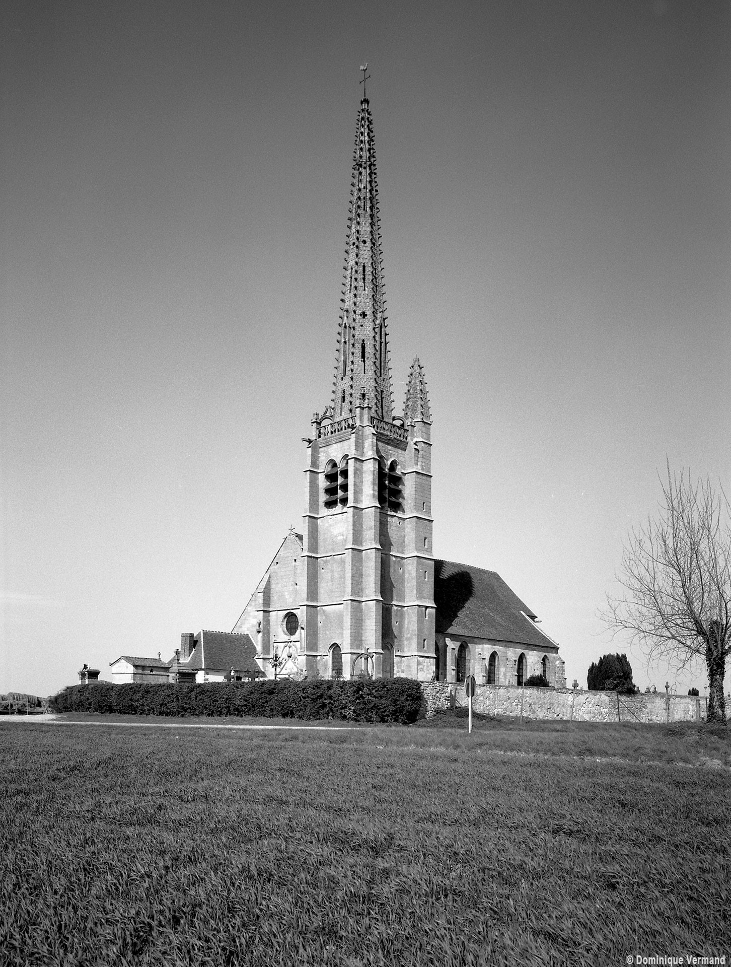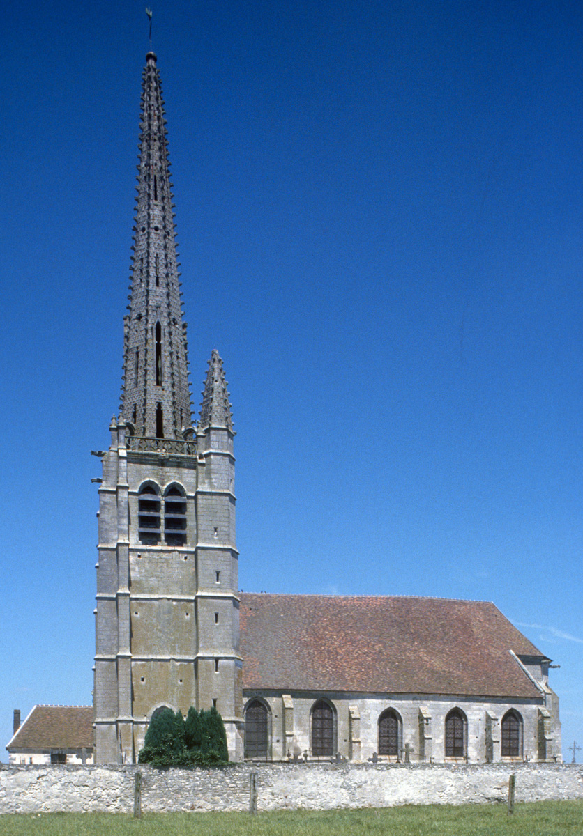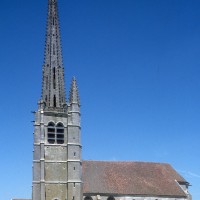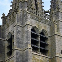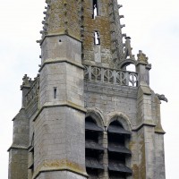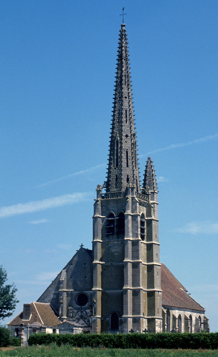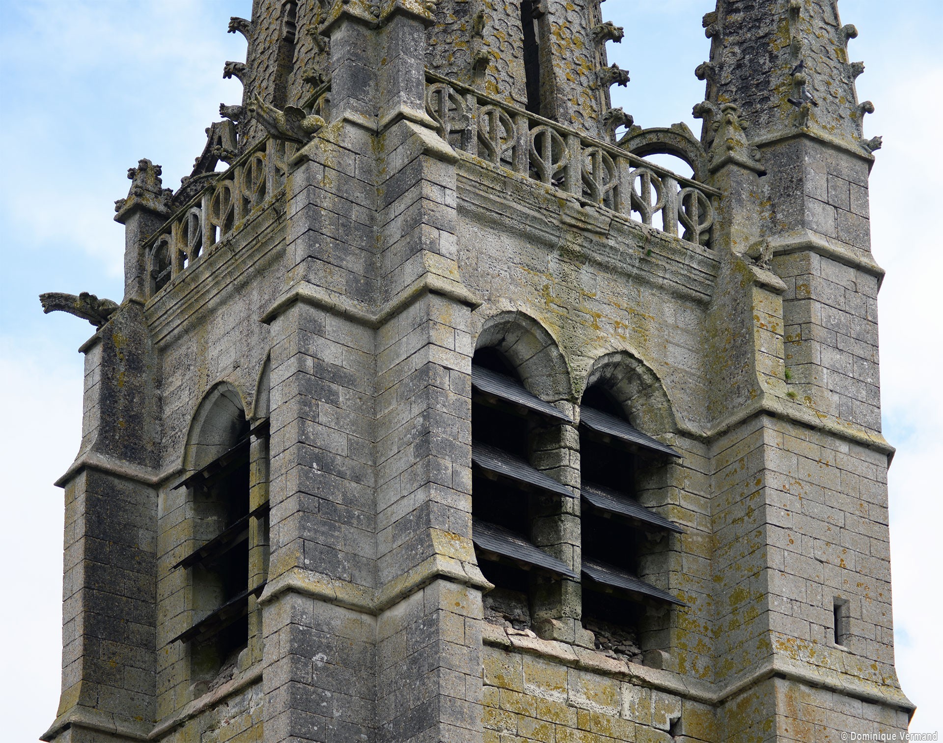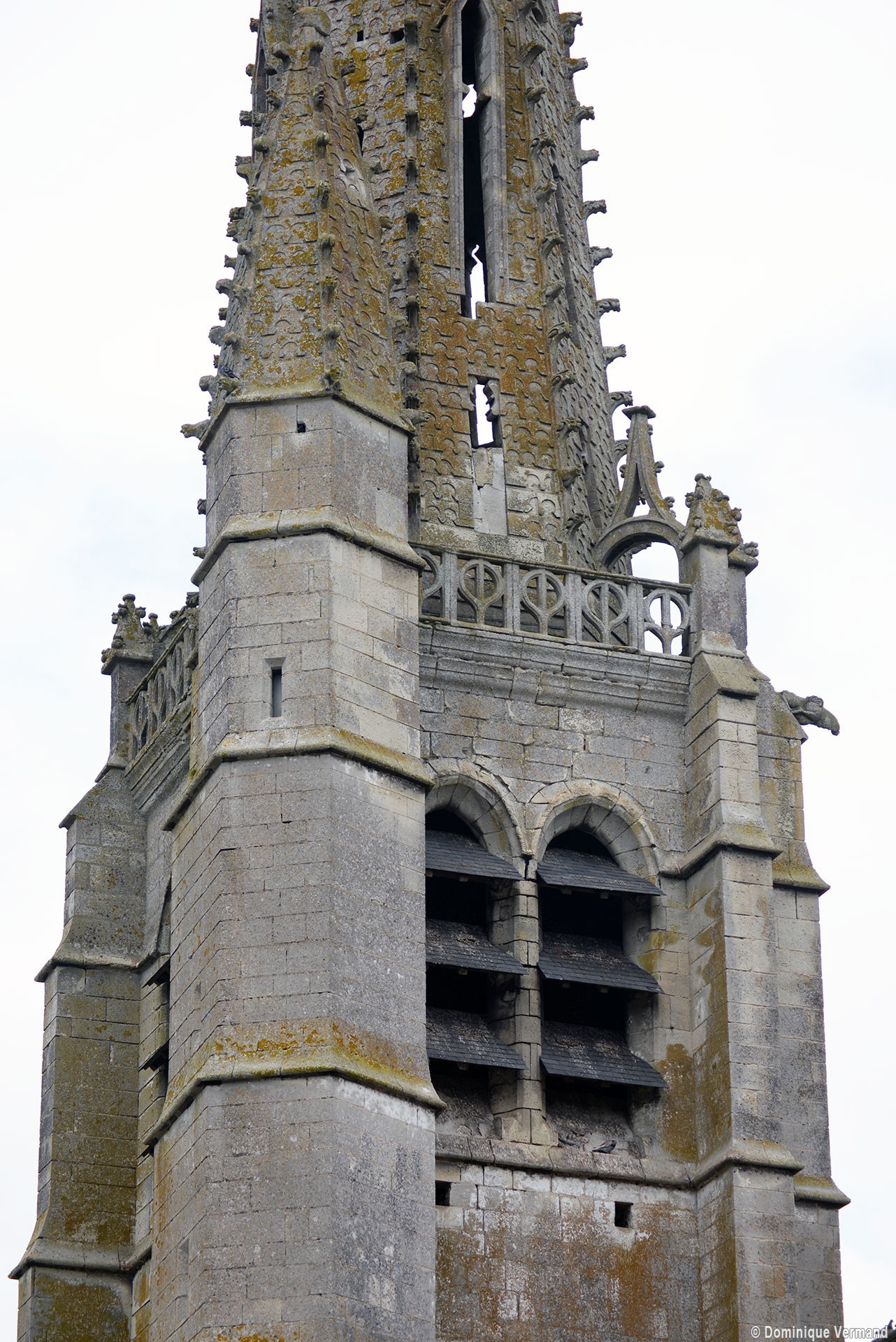 Homogène avec la façade percée d’un joli portail double de style Renaissance avec décor de fleurons et de dauphins, le clocher reste une oeuvre pleinement gothique à une époque où les deux styles cohabitent volontiers. La tour proprement dite, puissante et austère avec son seul étage de baies géminées, renforce le caractère gracile de la flèche dont la référence à celle de Senlis est évidente. Des crochets soulignent les arêtes de celle-ci tandis que de hautes et étroites baies, des quadrilobes et des oculi, ajourent ses faces et diminuent la prise au vent. Une balustrade ajourée court à la base, reliée à la flèche par de petits arcs-boutants plus décoratifs que fonctionnels. A l’angle sud-est, la tourelle d’escalier se termine, de même, par une flèche en pierre.