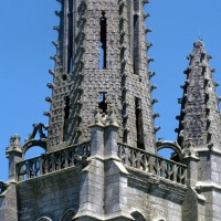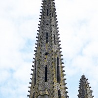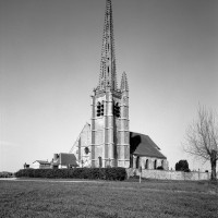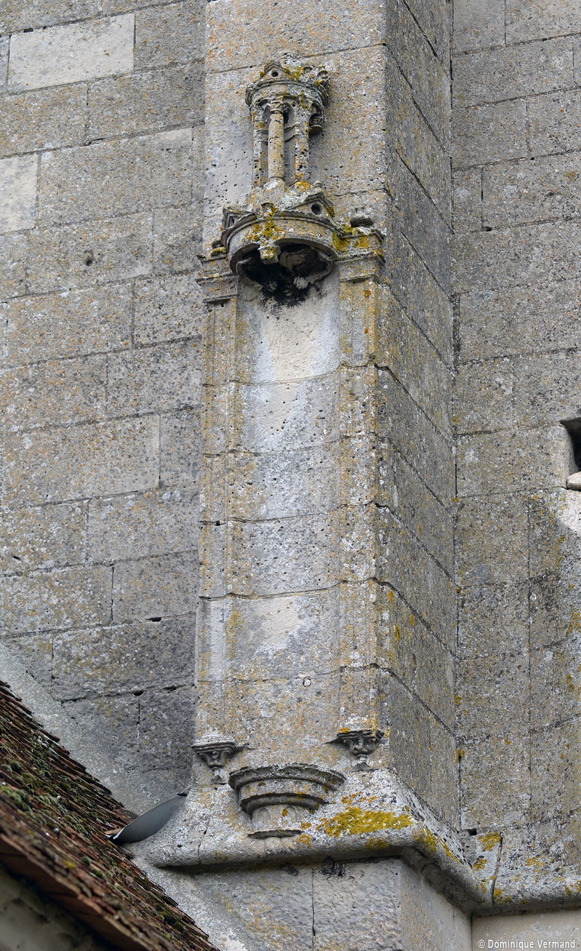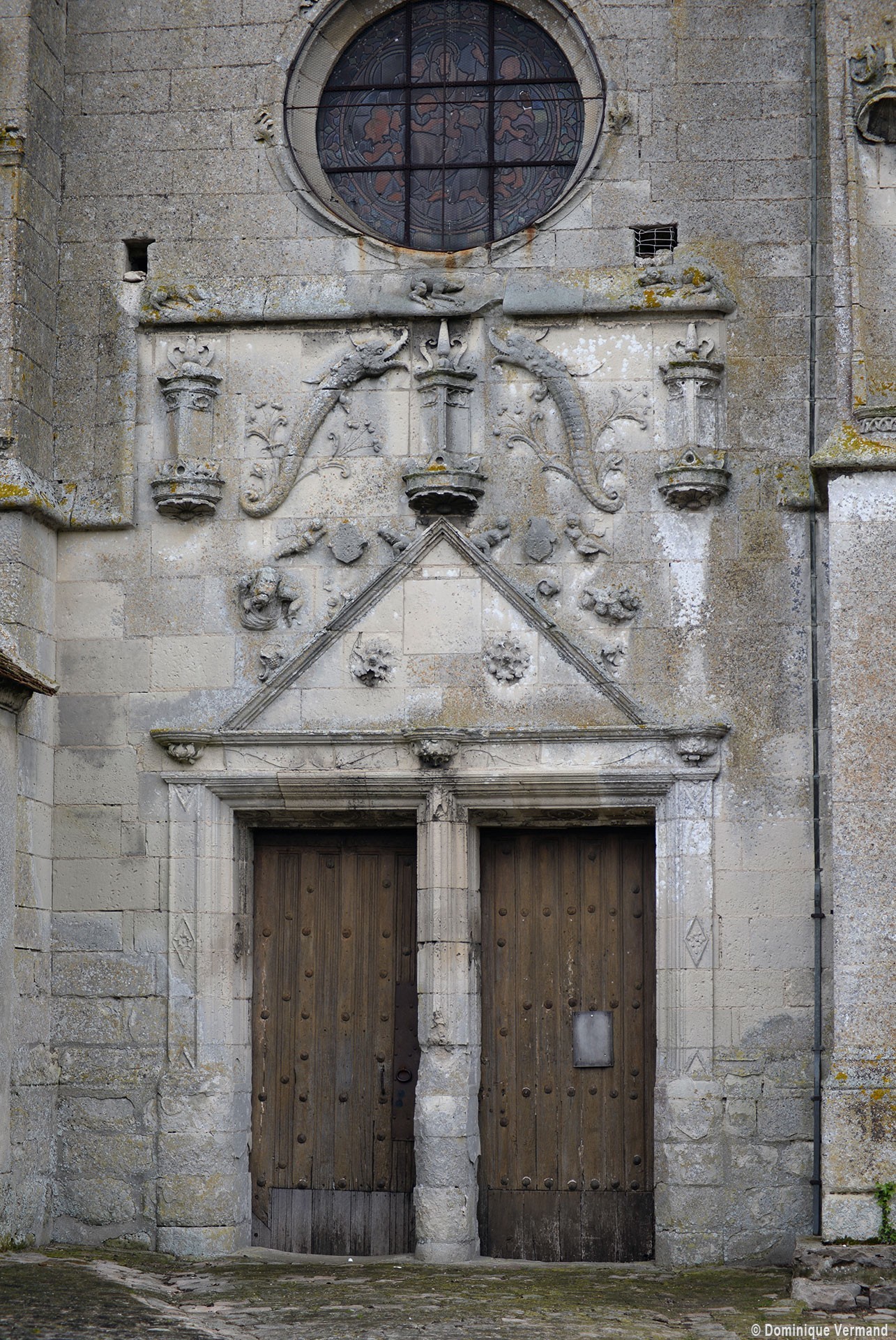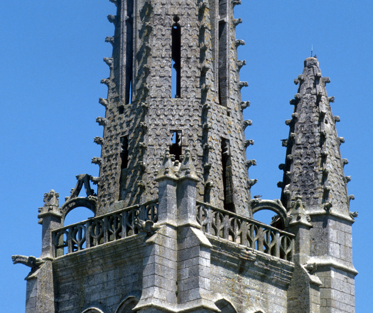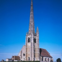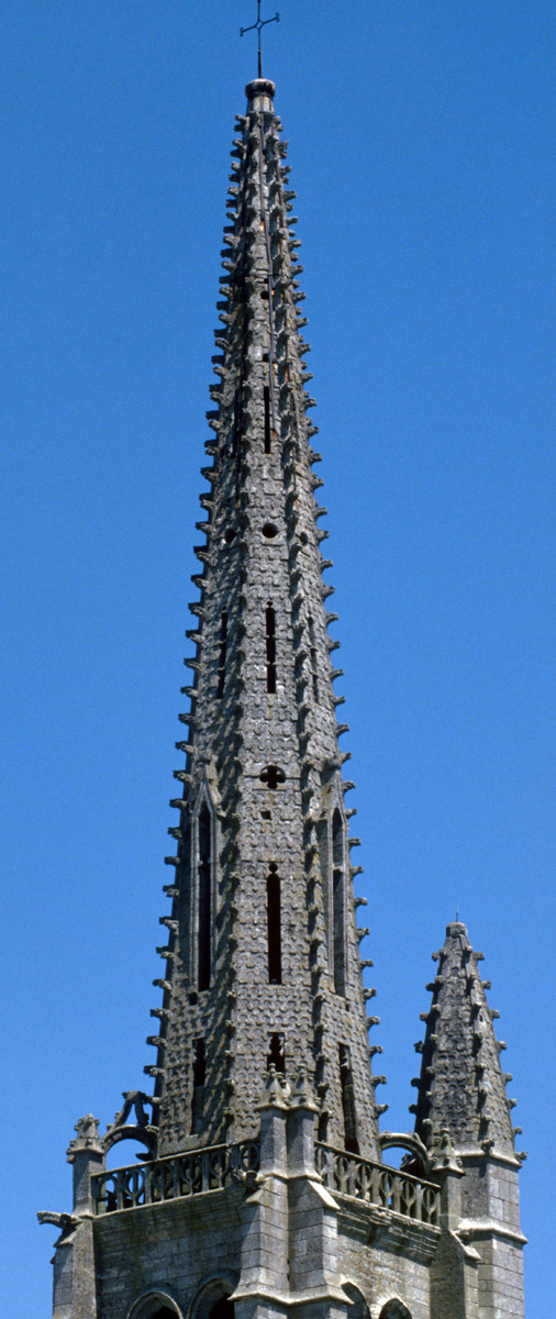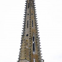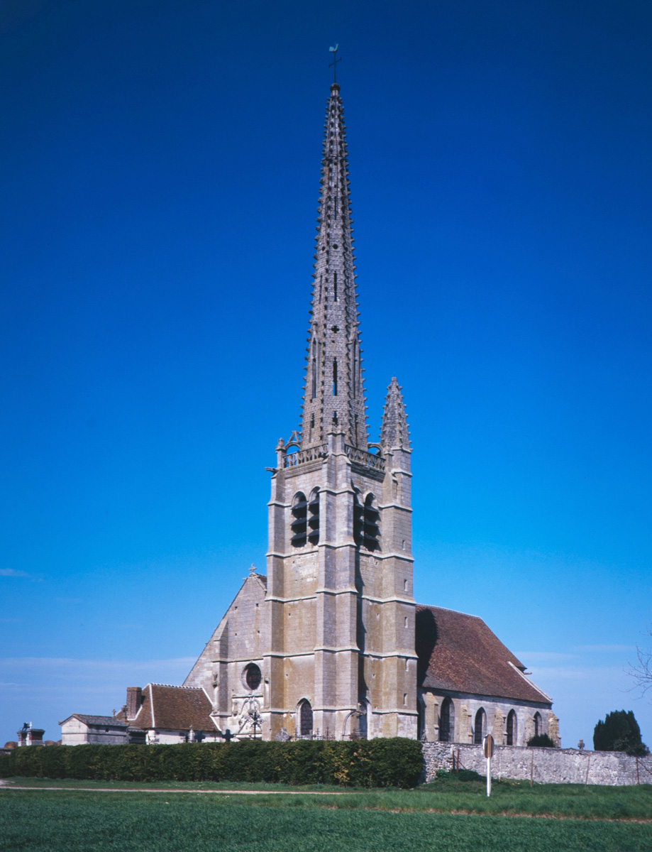 Homogène avec la façade percée d’un joli portail double de style Renaissance avec décor de fleurons et de dauphins, le clocher reste une oeuvre pleinement gothique à une époque où les deux styles cohabitent volontiers. La tour proprement dite, puissante et austère avec son seul étage de baies géminées, renforce le caractère gracile de la flèche dont la référence à celle de Senlis est évidente. Des crochets soulignent les arêtes de celle-ci tandis que de hautes et étroites baies, des quadrilobes et des oculi, ajourent ses faces et diminuent la prise au vent. Une balustrade ajourée court à la base, reliée à la flèche par de petits arcs-boutants plus décoratifs que fonctionnels. A l’angle sud-est, la tourelle d’escalier se termine, de même, par une flèche en pierre.