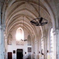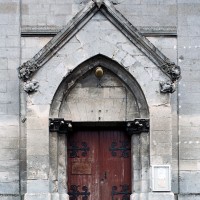 A l’extérieur, la façade superpose un portail et une rose. En saillie et surmonté d’un gâble, le portail reproduit un type très courant au Moyen-Age. On remarquera la disposition curieuse des contreforts de la nef et du choeur, qui se continuent au-delà de la retombée des toitures comme le feraient des culées d’arcs-boutants (2008).