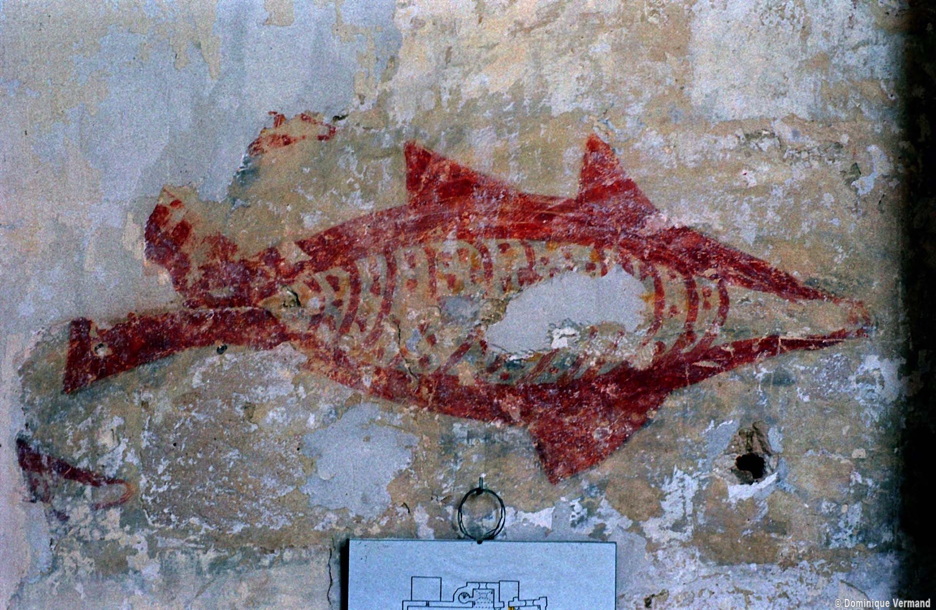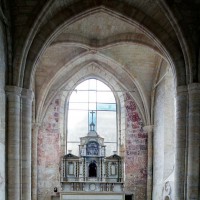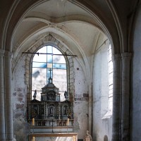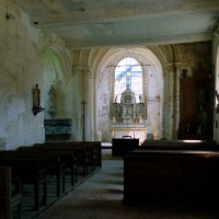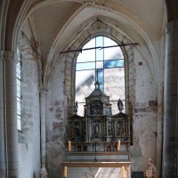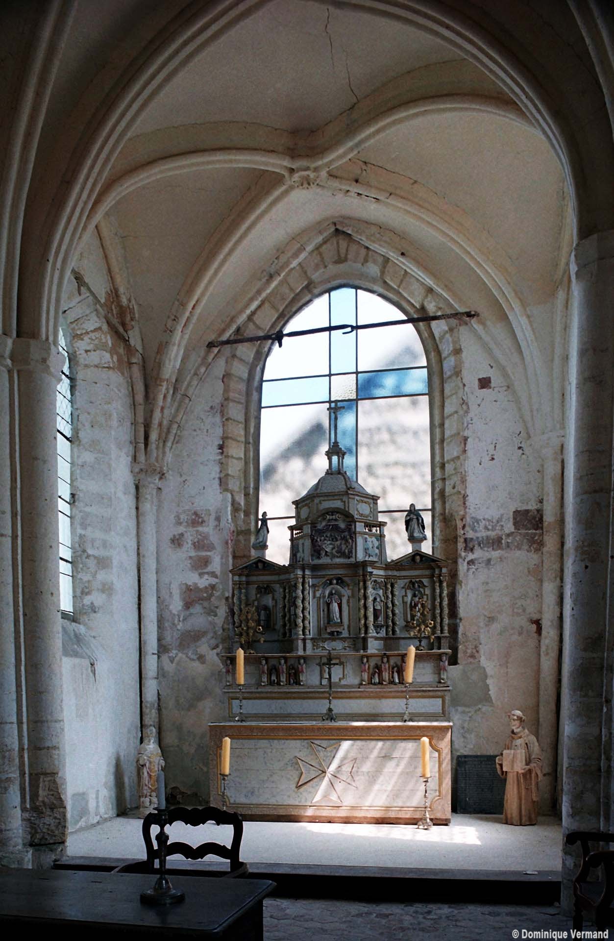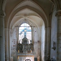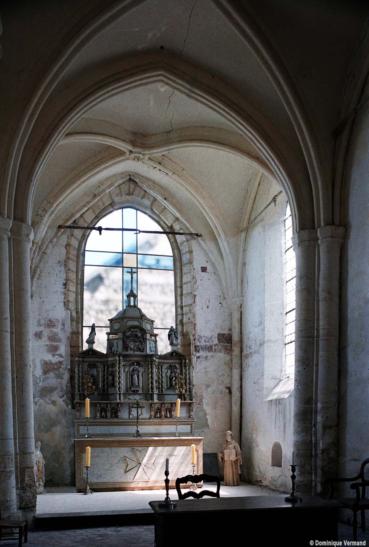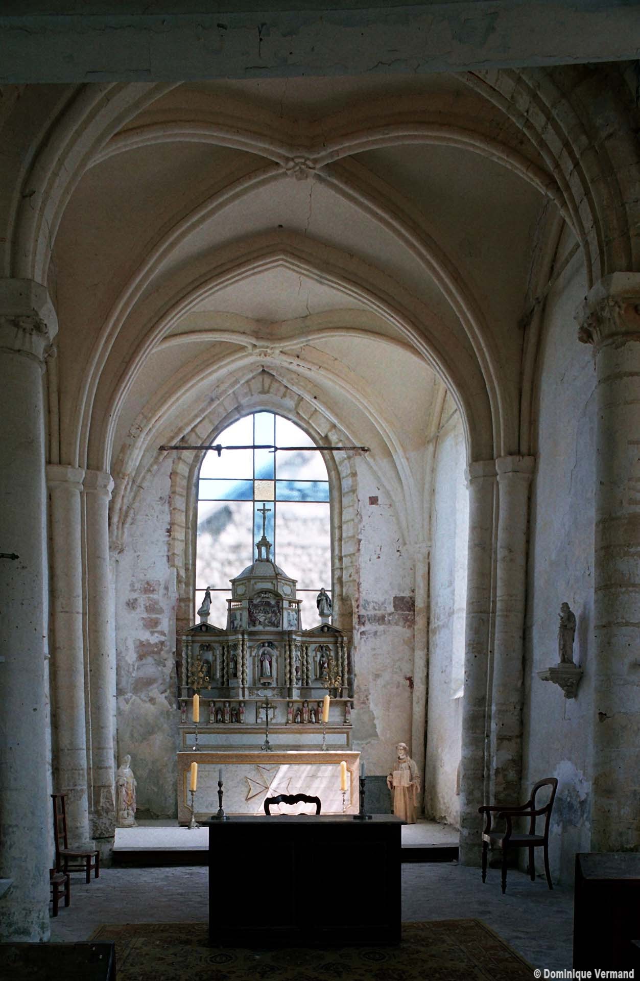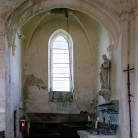 Rebâti dans la seconde moitié du 13ème siècle, le chœur est très élégant malgré sa simplicité. Ses deux travées (la première est plus courte) comportent des voûtes d’ogives dont les nervures, formerets et doubleaux retombent sur des groupes de trois demi colonnes. Les chapiteaux à crochets, avec leur corbeille trop courte et leur tailloir trop épais, sont en revanche d’une facture assez grossière. Il n’y a de fenêtres qu’à la seconde travée et celle du chevet – les deux autres sont de simples lancettes – a malheureusement perdu son remplage. Une rare représentation peinte d’un poisson, contemporaine de la construction, se voit sur le mur nord.