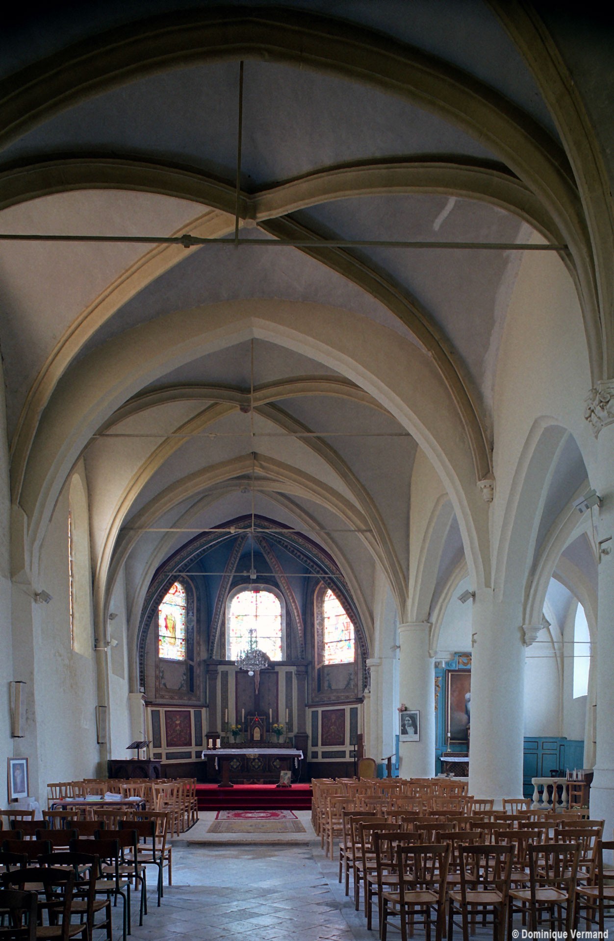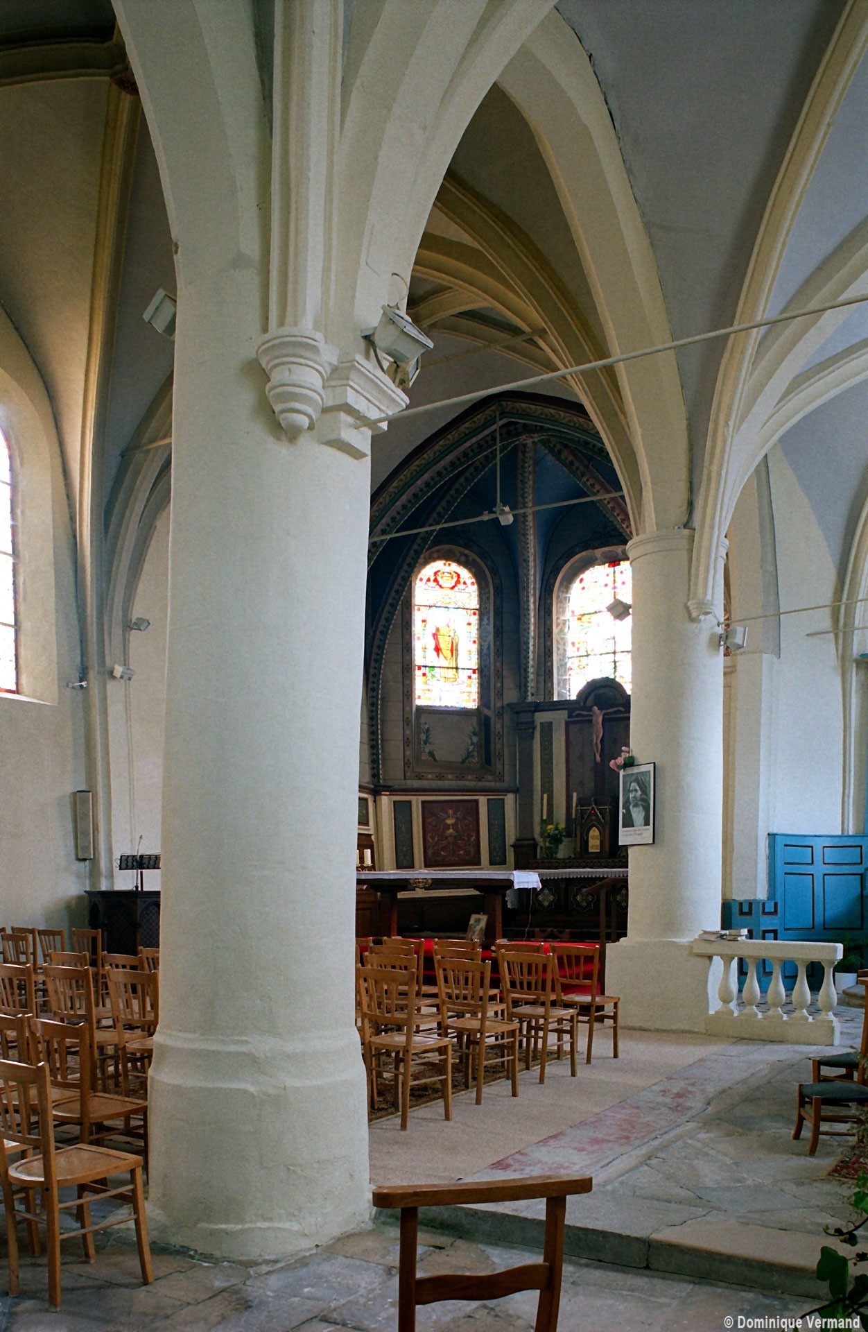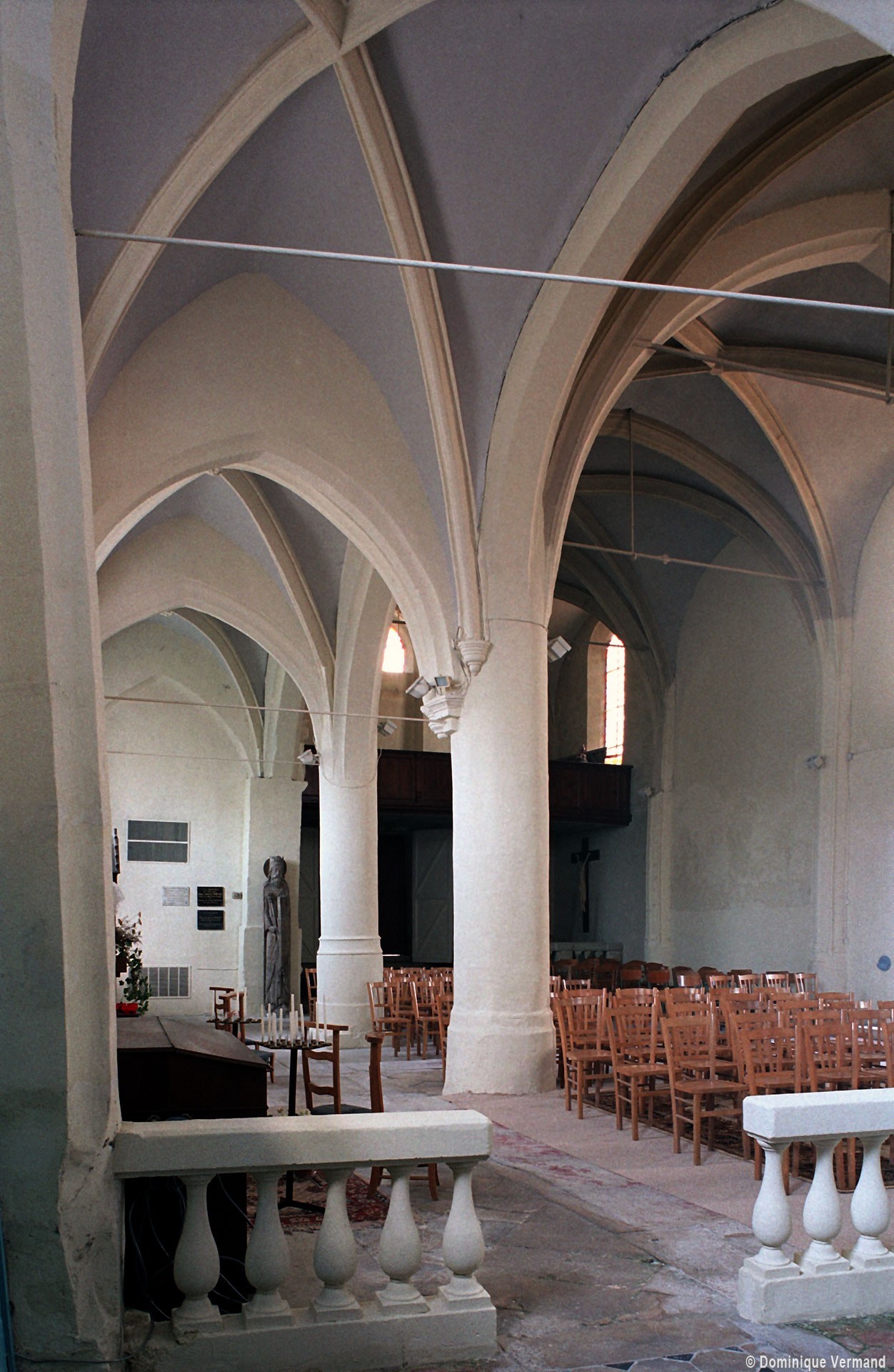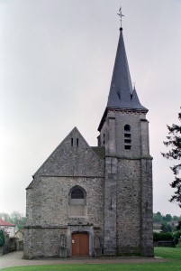 Reconstruit au 16ème siècle en moellons de grès, Saint-Barthélémy comprend une nef de cinq travées avec bas-côté au sud seulement et une abside à cinq pans. Le clocher s’élève sur la première travée du bas-côté. L’intérieur vaut mieux que ne le laisse supposer l’extérieur, vierge de toute décoration et à l’aspect bien pauvre. Des voûtes d’ogives recouvrent intégralement l’édifice et le style des culots qui en reçoivent certaines comme celui des deux chapiteaux visibles à la seconde travée accuse nettement l’époque de la Renaissance. Une Vierge à l’Enfant du début du 15ème siècle et un Saint-Denis encadrent la porte principale mais n’étaient certainement pas, à l’origine, destinés à cette église (2002).