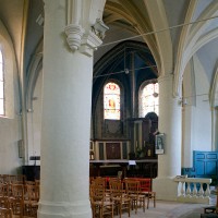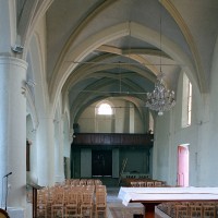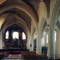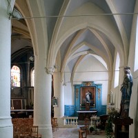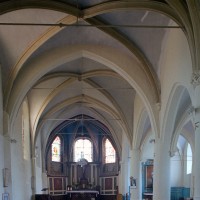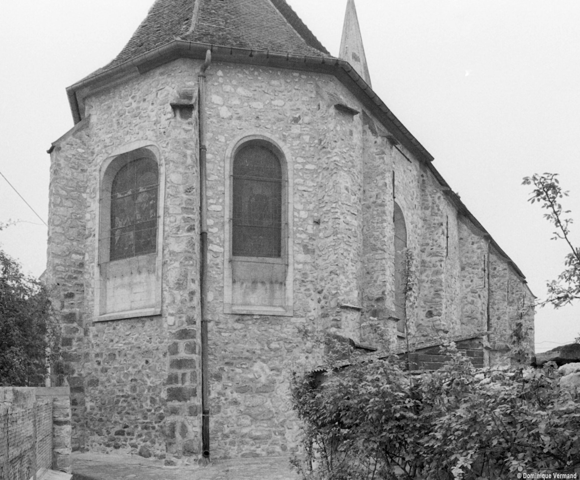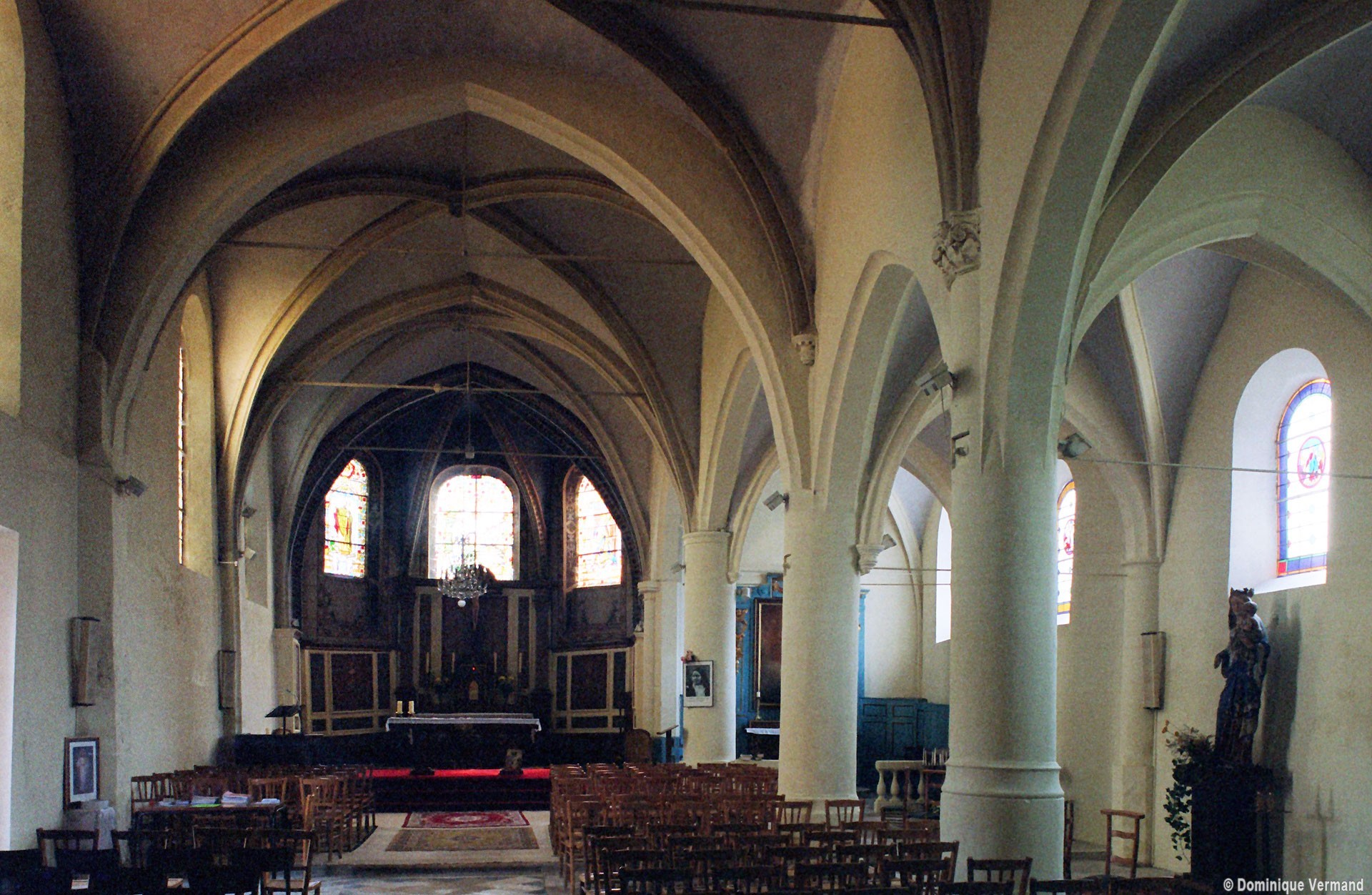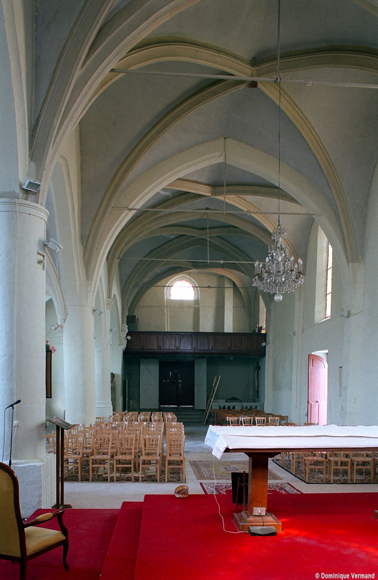 Reconstruit au 16ème siècle en moellons de grès, Saint-Barthélémy comprend une nef de cinq travées avec bas-côté au sud seulement et une abside à cinq pans. Le clocher s’élève sur la première travée du bas-côté. L’intérieur vaut mieux que ne le laisse supposer l’extérieur, vierge de toute décoration et à l’aspect bien pauvre. Des voûtes d’ogives recouvrent intégralement l’édifice et le style des culots qui en reçoivent certaines comme celui des deux chapiteaux visibles à la seconde travée accuse nettement l’époque de la Renaissance. Une Vierge à l’Enfant du début du 15ème siècle et un Saint-Denis encadrent la porte principale mais n’étaient certainement pas, à l’origine, destinés à cette église (2002).