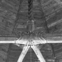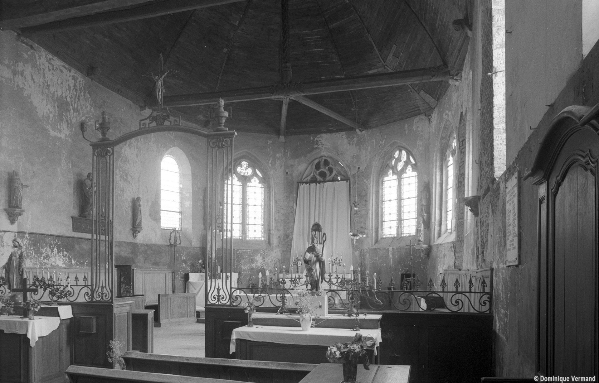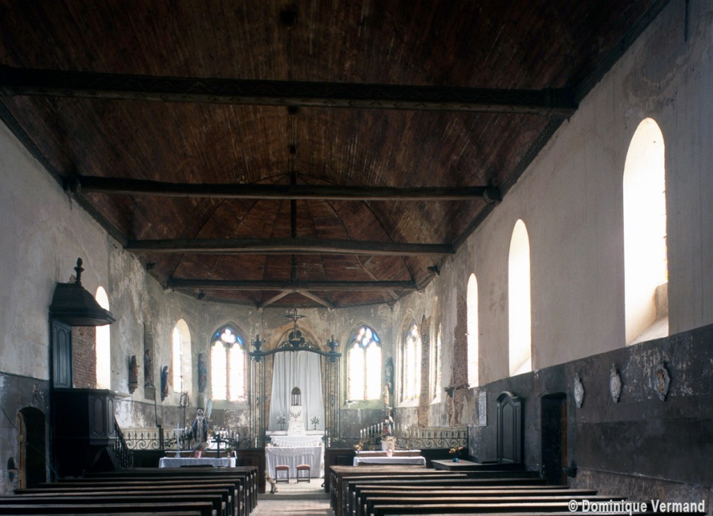 Très simple, son plan comprend une nef unique terminée par une abside pentagonale. La partie orientale, plus ancienne, remonte à la fin du 15ème ou au début du 16ème siècle. Ses larges fenêtres ont un remplage flamboyant dont les soufflets et les mouchettes (partie supérieure de la fenêtre), moins exposés que les lancettes du fait de leur petite surface, ont conservé des restes de vitraux de la même époque. La charpente, particulièrement à l’abside, est remarquable : le poinçon (élément vertical) à décor de chevrons est reçu sur l’entrait (élément horizontal) par deux engoulants opposés figurant une tête d’animal sauvage (lion ?).