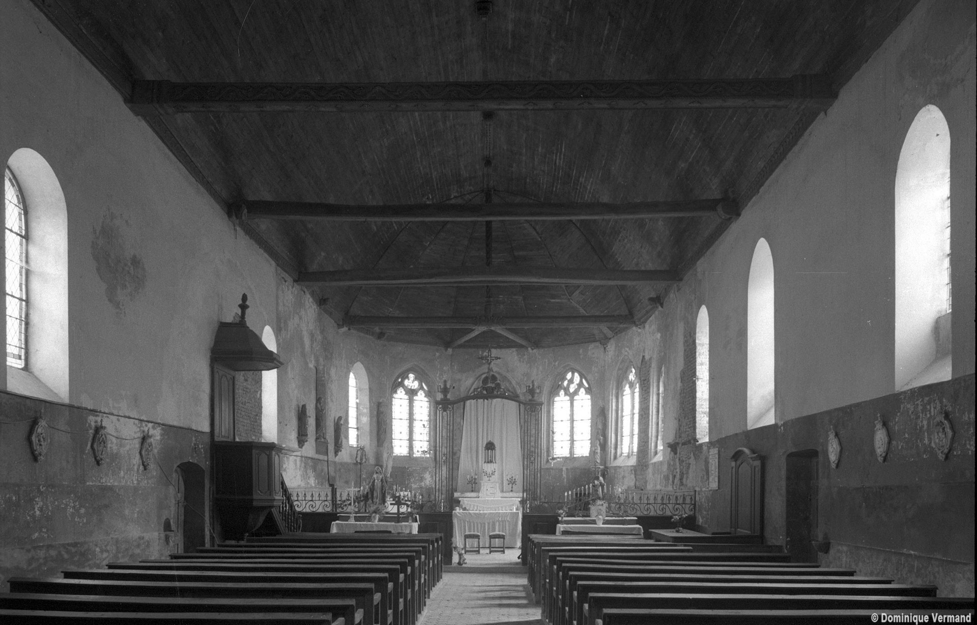 Notre-Dame attire d’abord l’attention par le jeu décoratif – damier de pierres et de silex au choeur; losanges de briques à la nef – des matériaux mis en oeuvre dans sa construction.