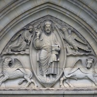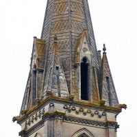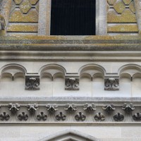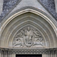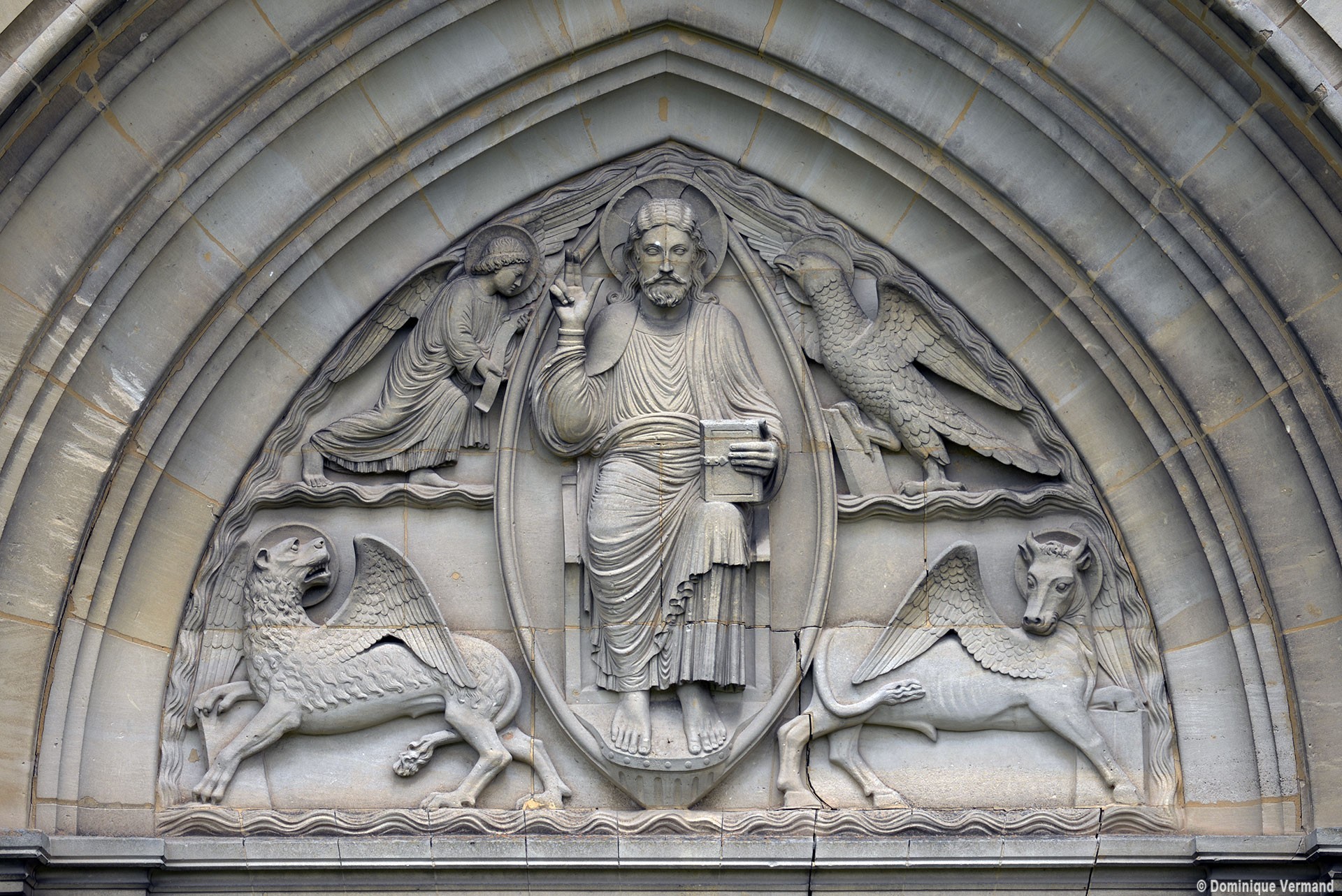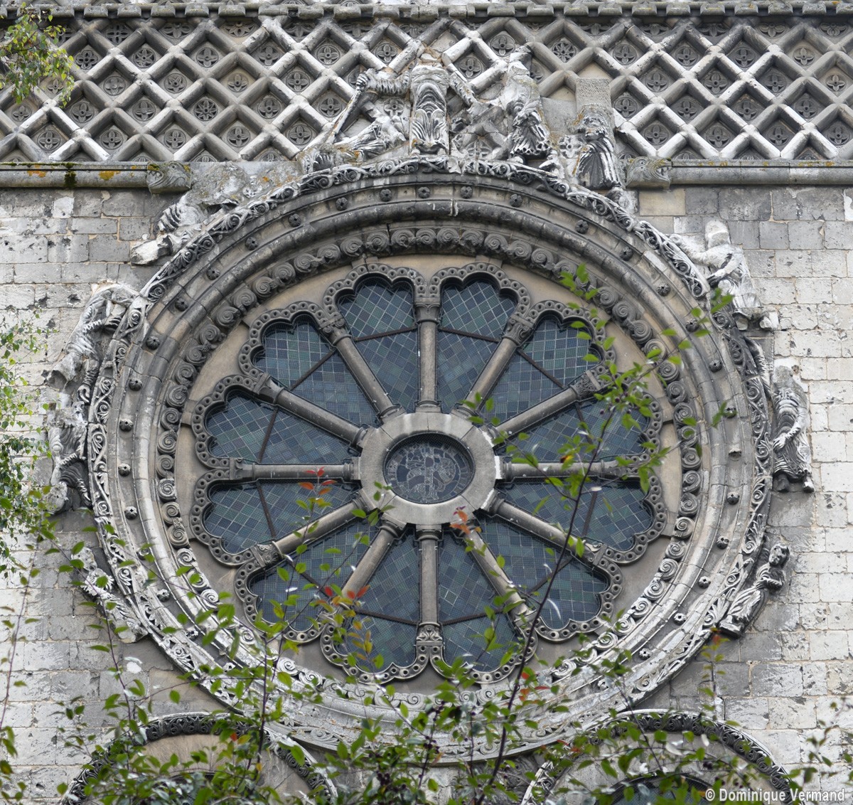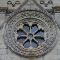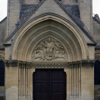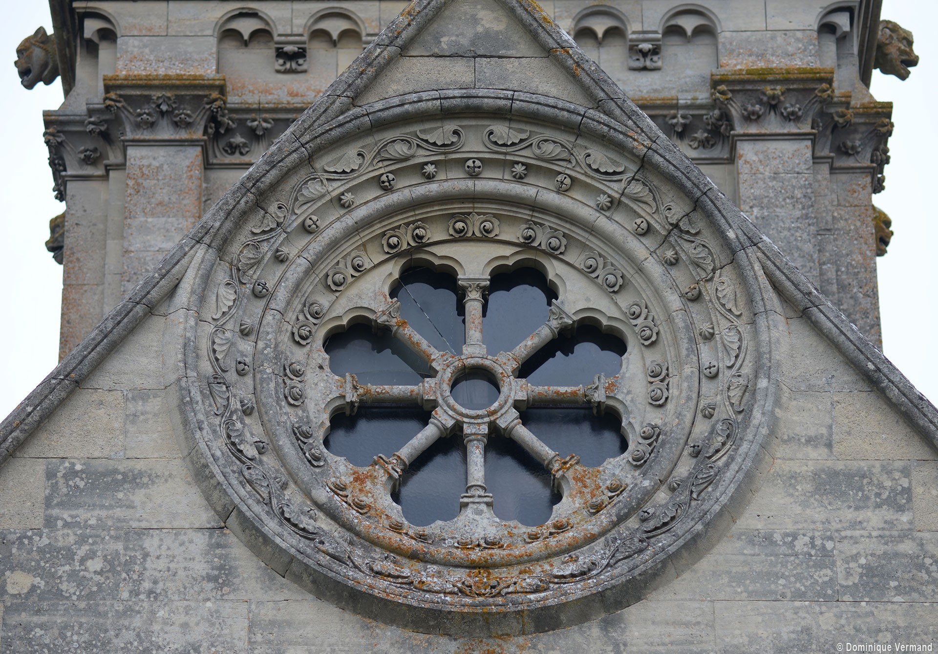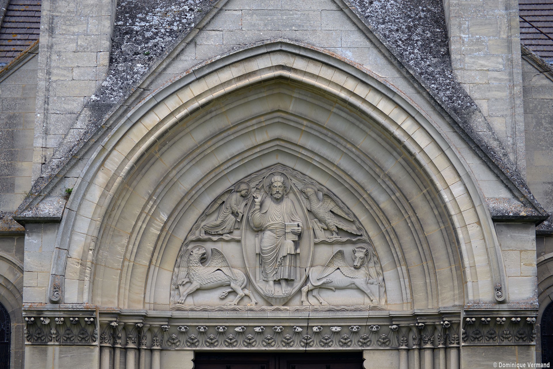A l’extérieur, on remarquera plus particulièrement la façade, dans laquelle s’ouvre un important portail à gâble avec une représentation du Jugement Dernier et dont le pignon est percé d’une rose inspirée de celle de Saint-Etienne de Beauvais.