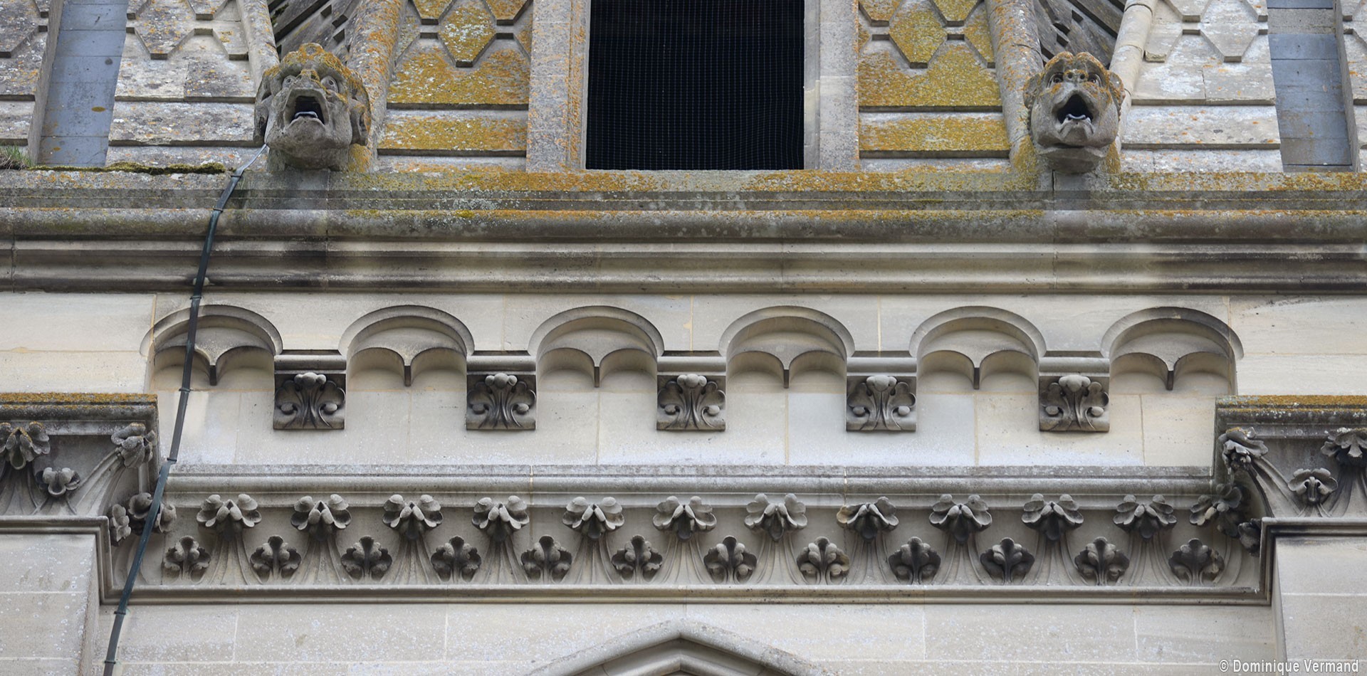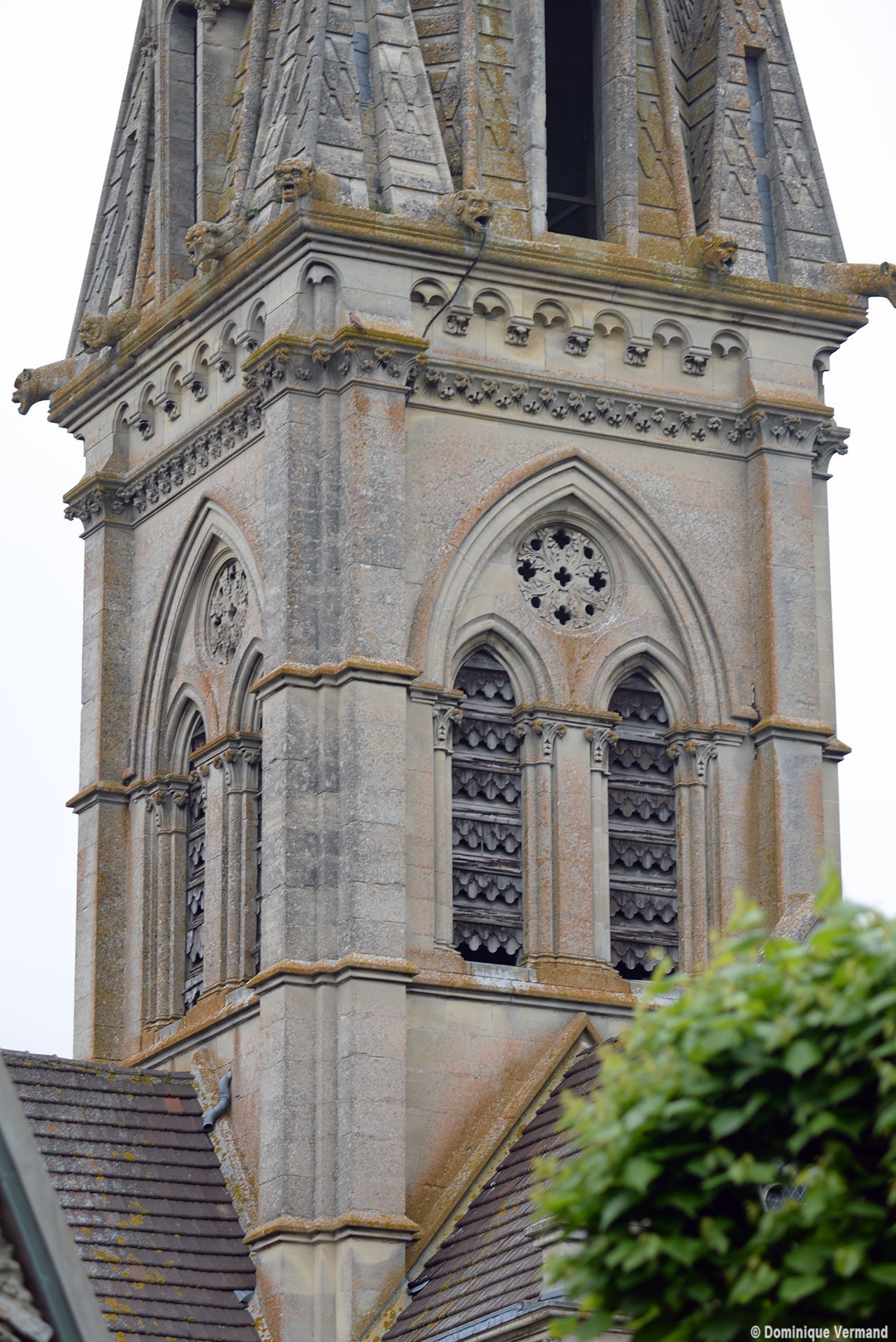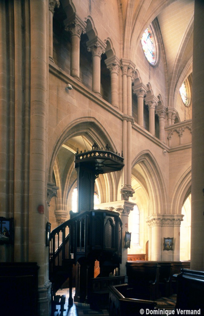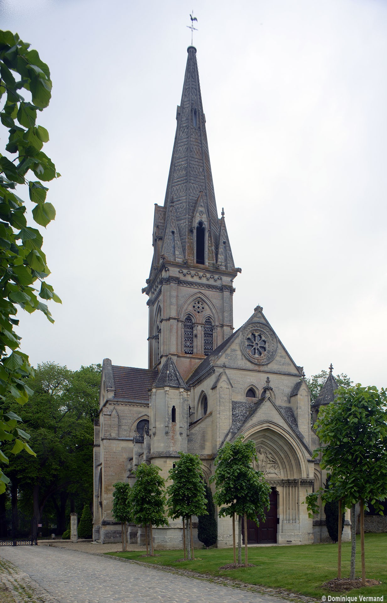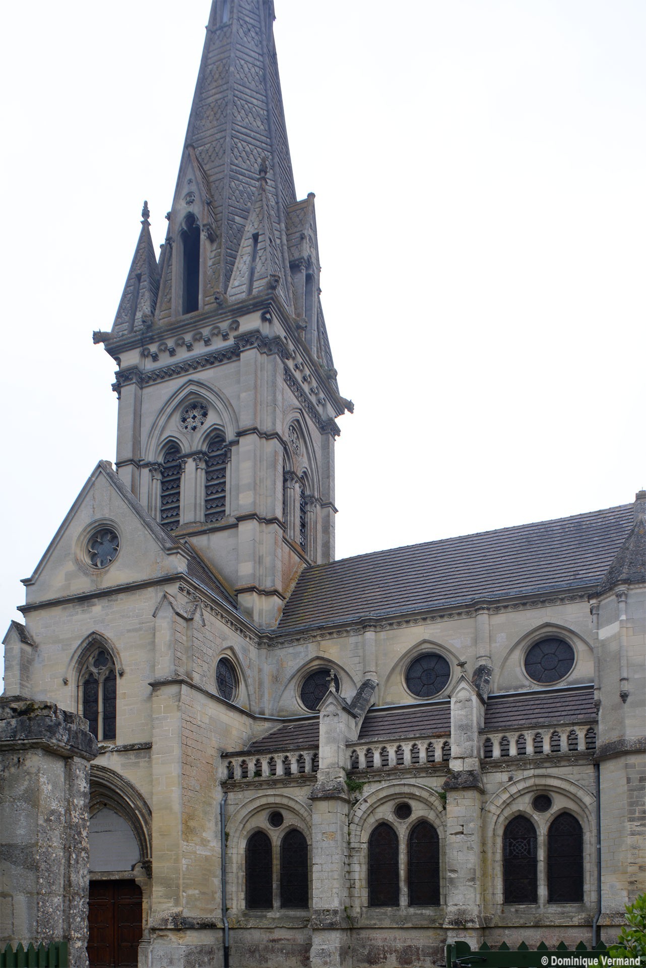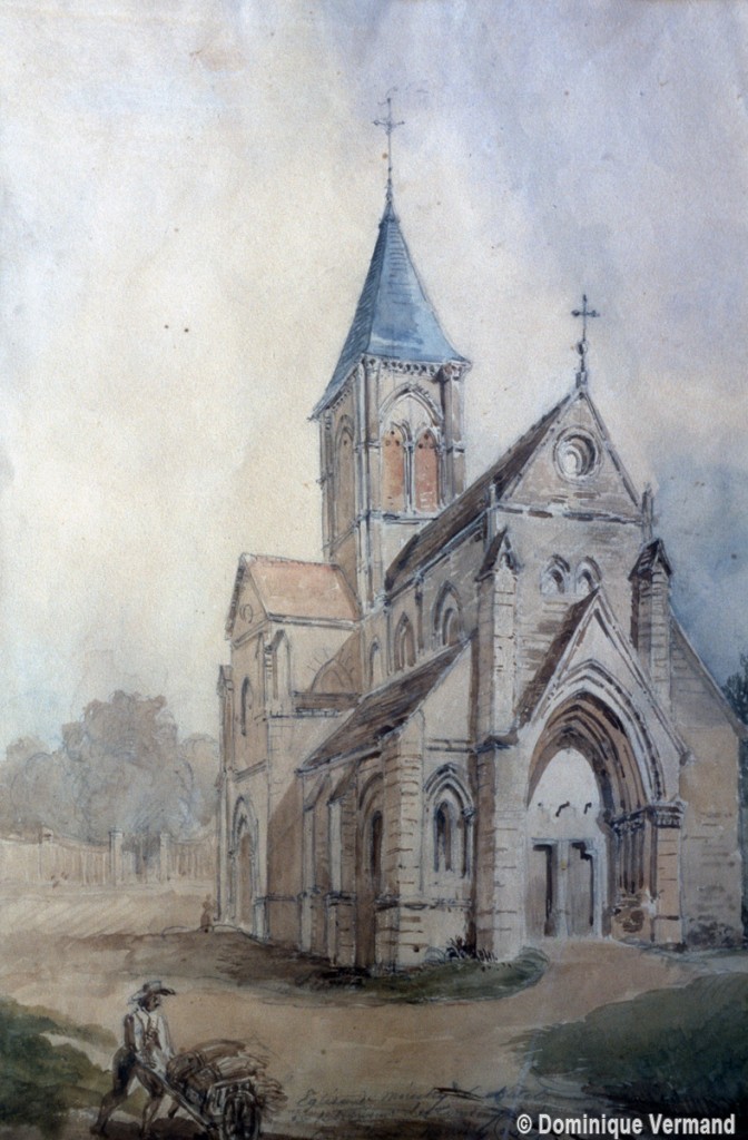 L’église actuelle, qui a toujours été paroissiale – une collégiale existait dans l’enceinte du château sous le titre de Notre-Dame -, est le fruit d’une restauration-reconstruction intégrale effectuée en style néo-gothique de 1857 à 1865. Des descriptions anciennes et une aquarelle conservée au château permettent toutefois de montrer que cette reconstruction s’est effectuée plus ou moins à l’identique de l’ancienne église, sauf pour le choeur. Doté d’un chevet plat, celui-ci remontait au début du 12ème siècle et son décor extérieur l’apparentait à celui de Saint-Etienne de Beauvais (corniche beauvaisine et colonnettes jumelées prolongeant les contreforts).