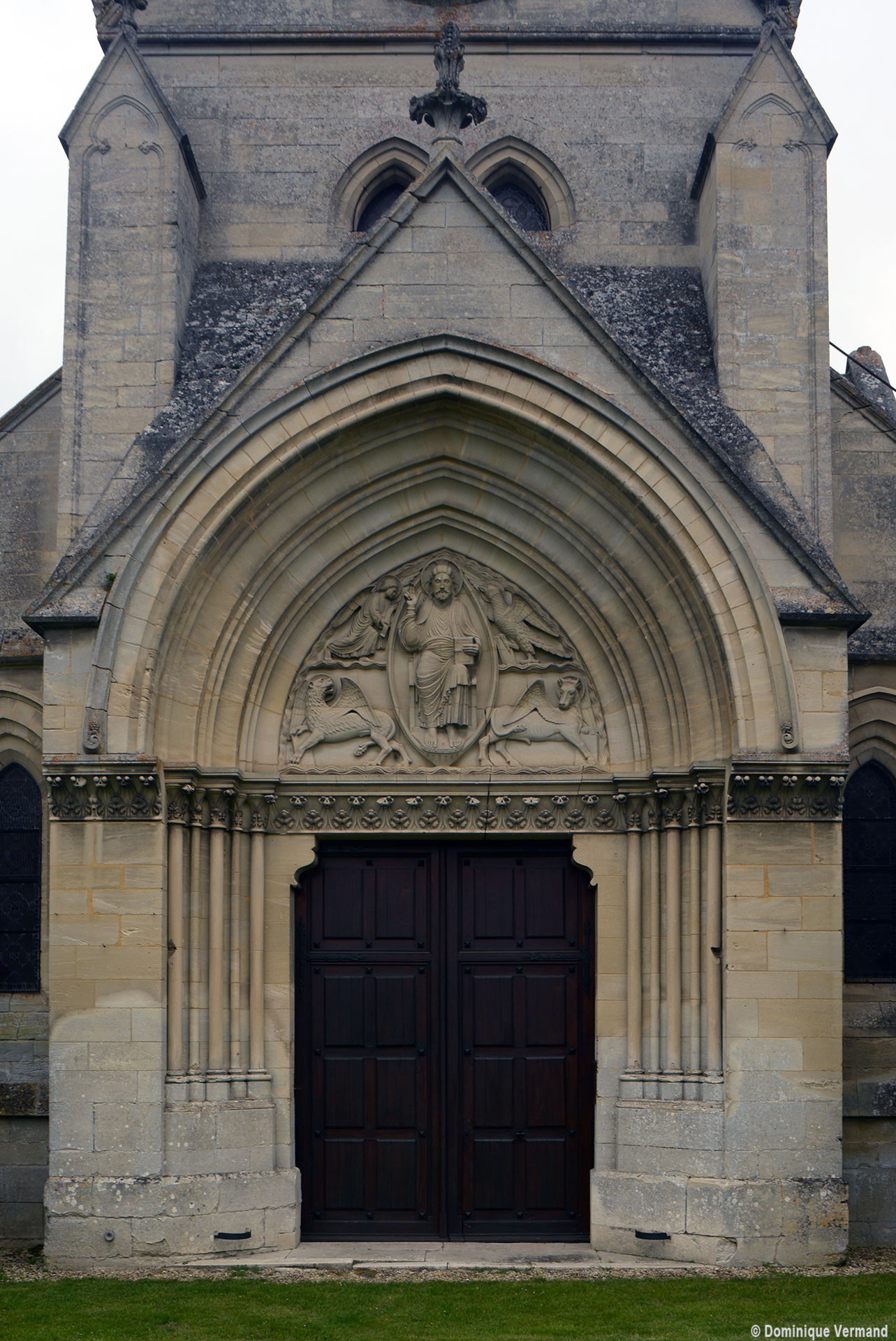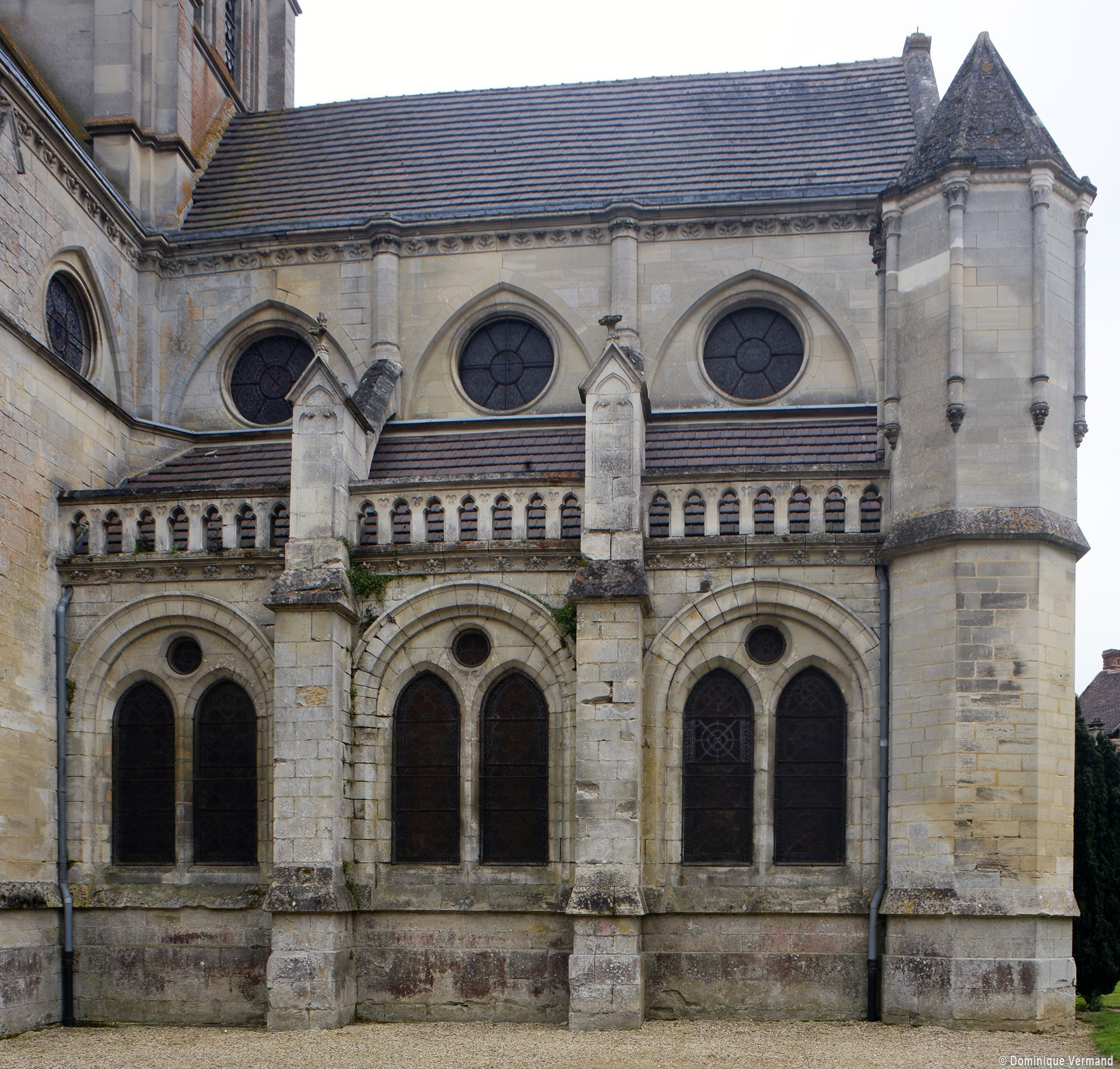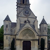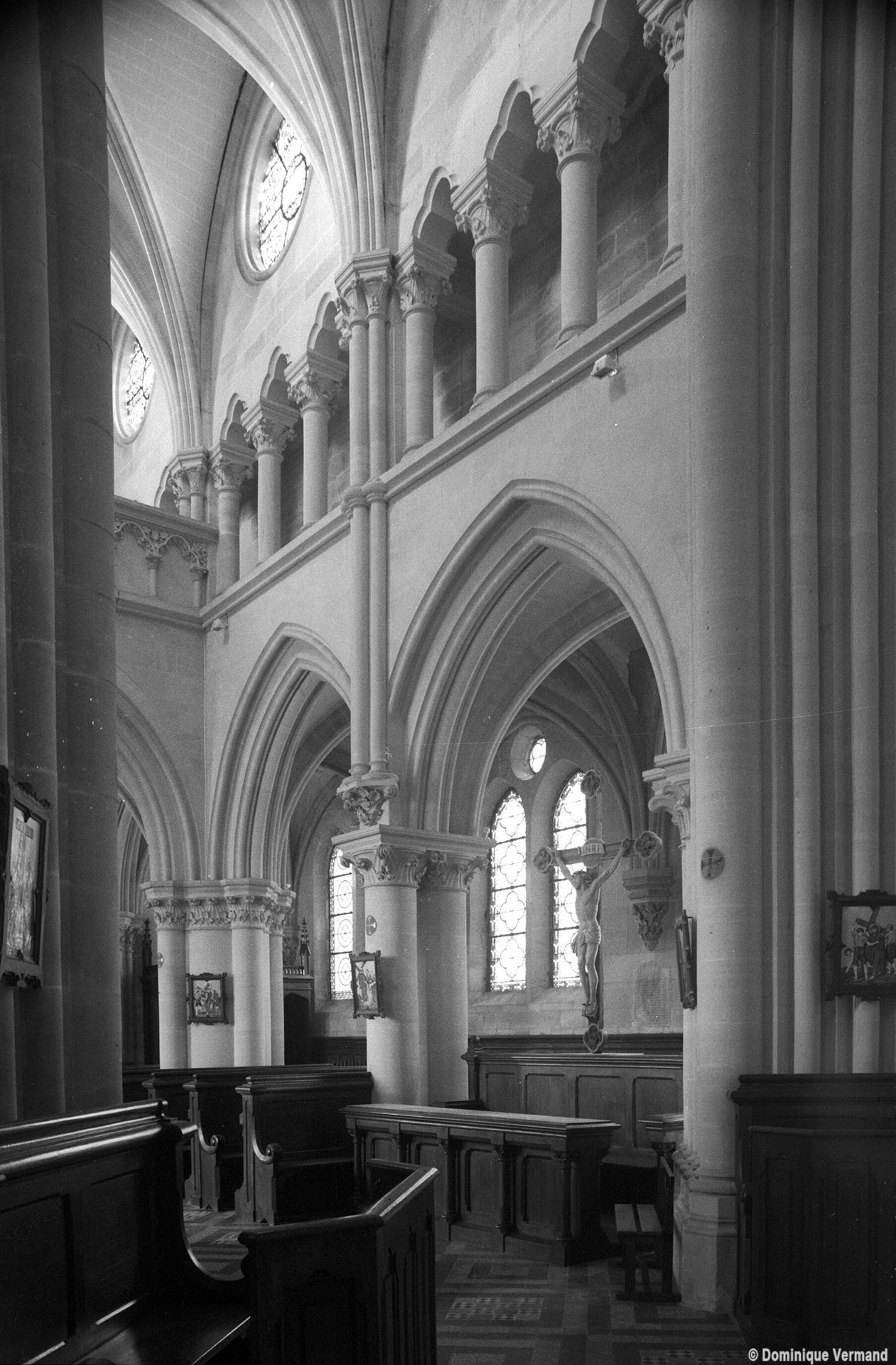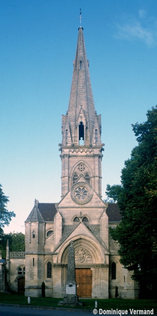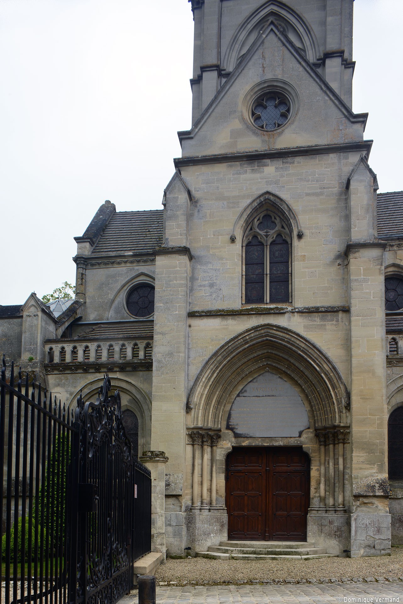 L’église actuelle, qui a toujours été paroissiale – une collégiale existait dans l’enceinte du château sous le titre de Notre-Dame -, est le fruit d’une restauration-reconstruction intégrale effectuée en style néo-gothique de 1857 à 1865. Des descriptions anciennes et une aquarelle conservée au château permettent toutefois de montrer que cette reconstruction s’est effectuée plus ou moins à l’identique de l’ancienne église, sauf pour le choeur. Doté d’un chevet plat, celui-ci remontait au début du 12ème siècle et son décor extérieur l’apparentait à celui de Saint-Etienne de Beauvais (corniche beauvaisine et colonnettes jumelées prolongeant les contreforts).