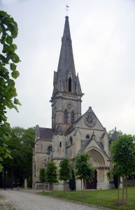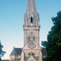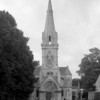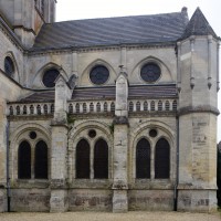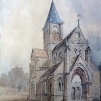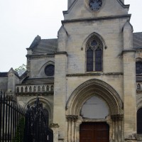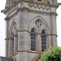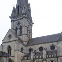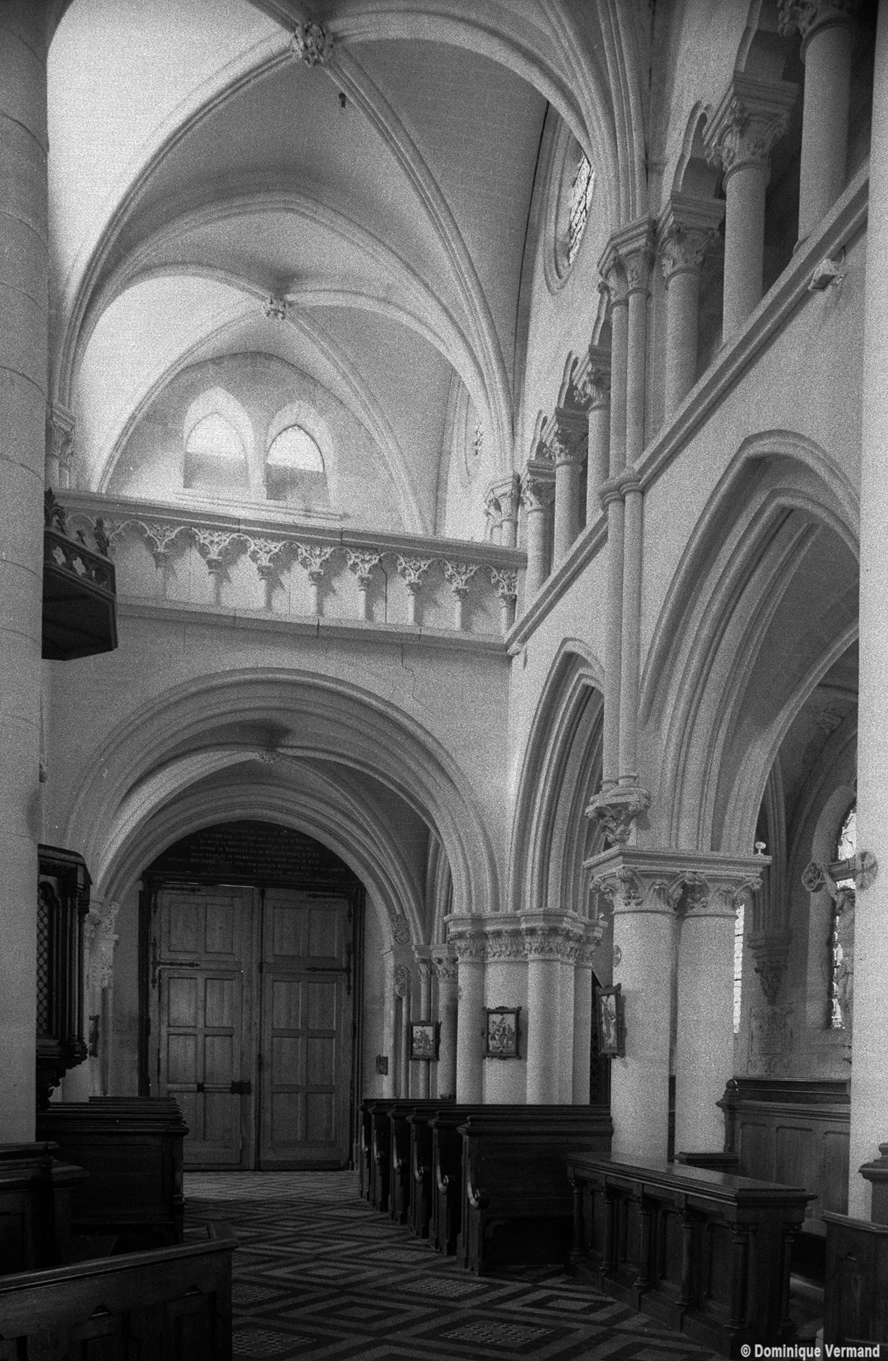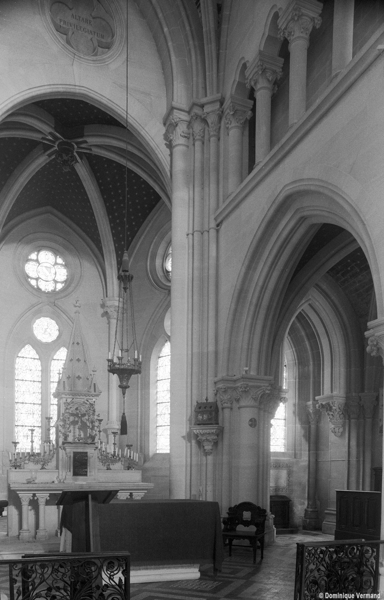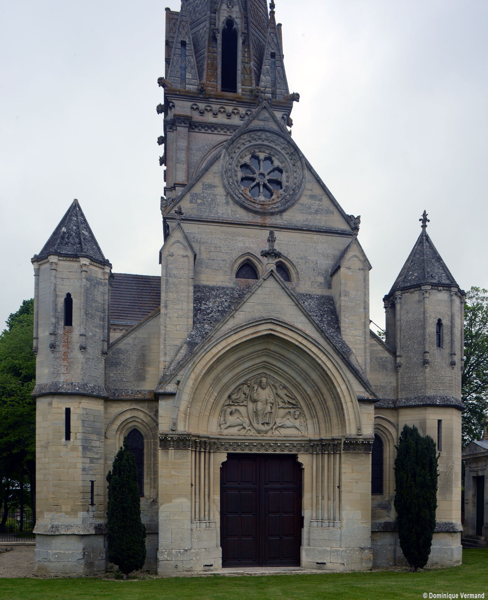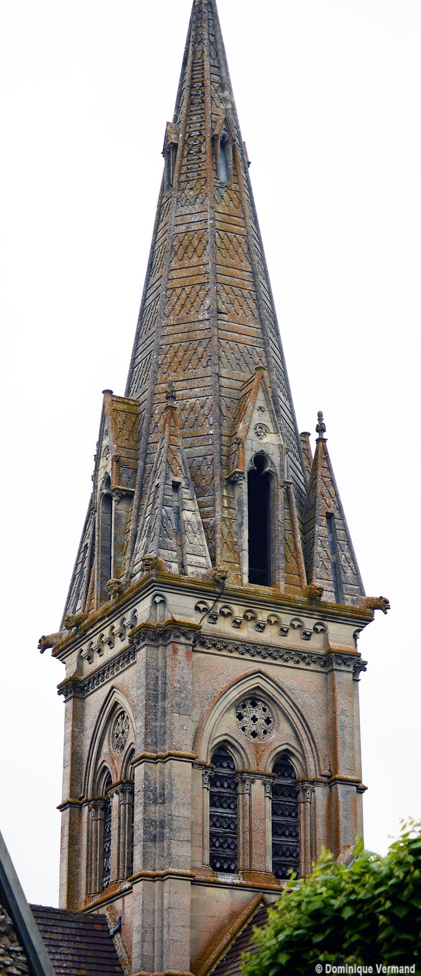 L’église actuelle, qui a toujours été paroissiale – une collégiale existait dans l’enceinte du château sous le titre de Notre-Dame -, est le fruit d’une restauration-reconstruction intégrale effectuée en style néo-gothique de 1857 à 1865. Des descriptions anciennes et une aquarelle conservée au château permettent toutefois de montrer que cette reconstruction s’est effectuée plus ou moins à l’identique de l’ancienne église, sauf pour le choeur. Doté d’un chevet plat, celui-ci remontait au début du 12ème siècle et son décor extérieur l’apparentait à celui de Saint-Etienne de Beauvais (corniche beauvaisine et colonnettes jumelées prolongeant les contreforts).