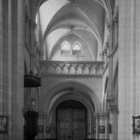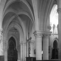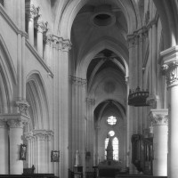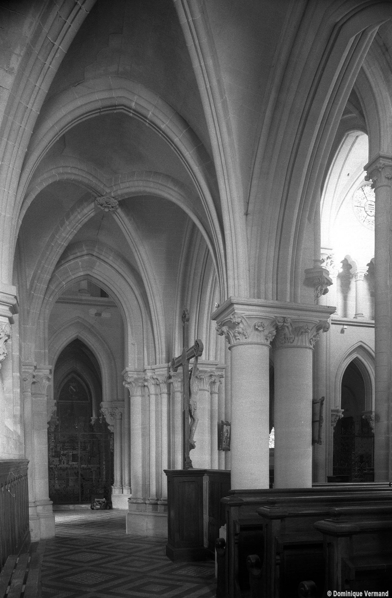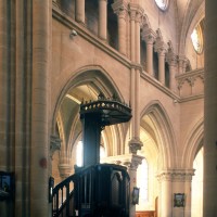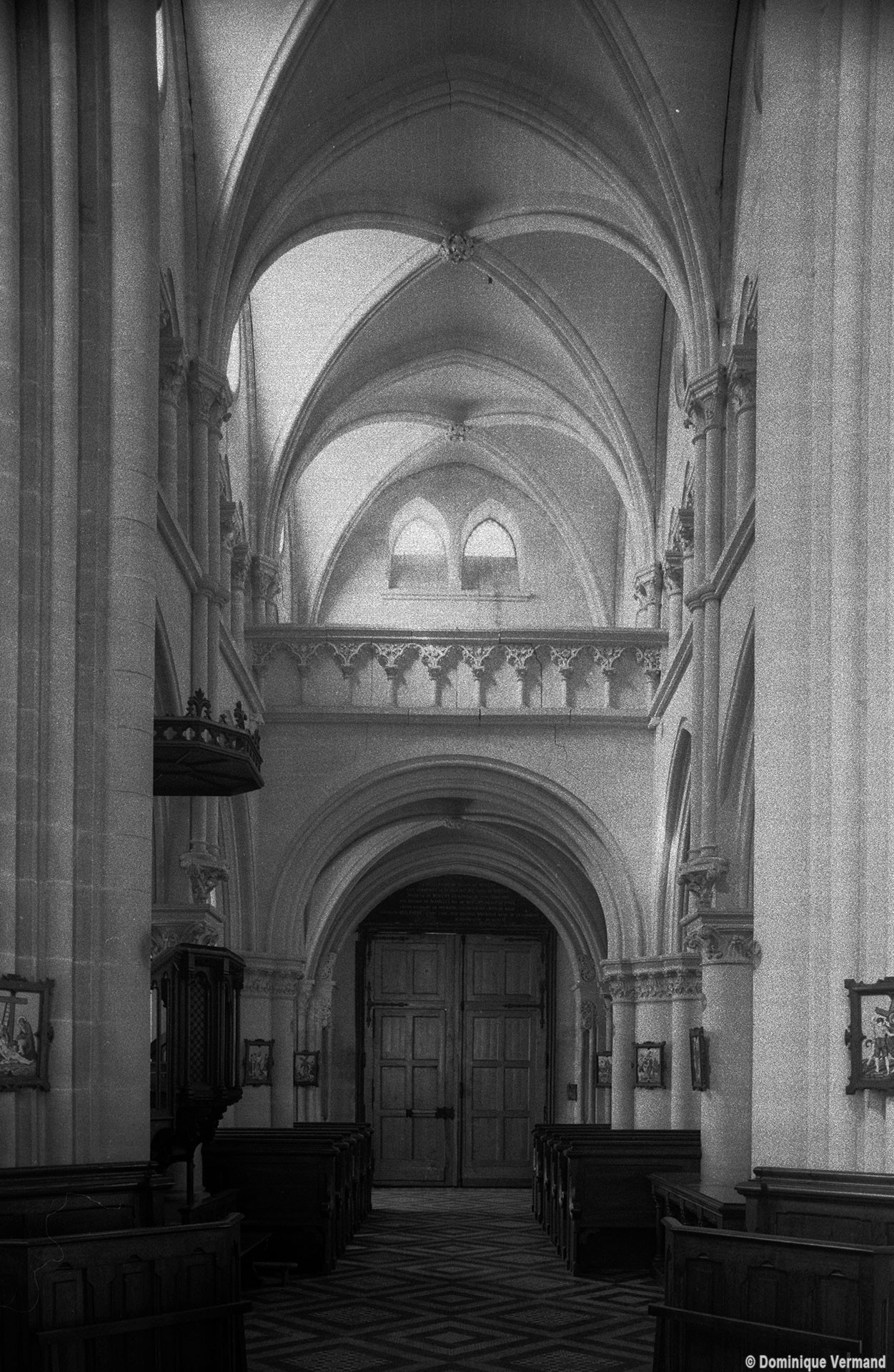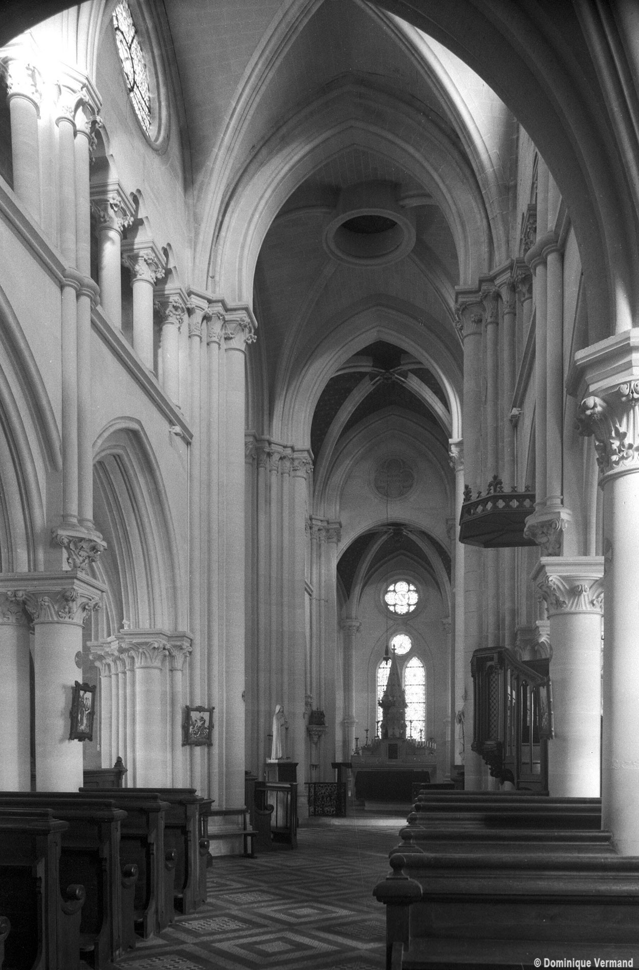 Evoquant les dispositions anciennes, l’élévation de la nef comporte trois niveaux : grandes arcades, triforium à arcatures trilobées et fenêtres hautes circulaires. Trois types de piles sont utilisés : composées (quatre demi-colonnes engagées dans un noyau circulaire), jumelées et fasciculées (à la croisée du transept) et déterminent un effet d’alternance pile forte/pile faible déjà signalé dans l’édifice précédent. Une tribune surmonte, comme autrefois, la première travée. Le style des chapiteaux à crochets est celui des années 1230 et l’ensemble s’inspire fortement de l’architecture régionale de la seconde moitié du 12ème et du début du 13ème siècle.