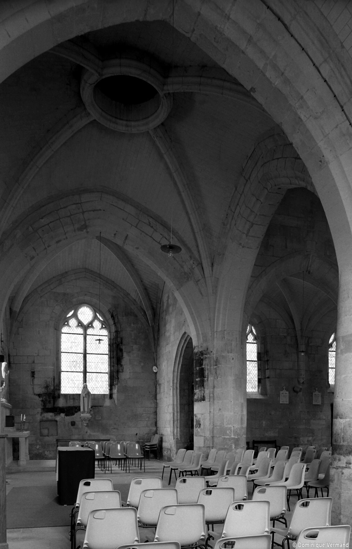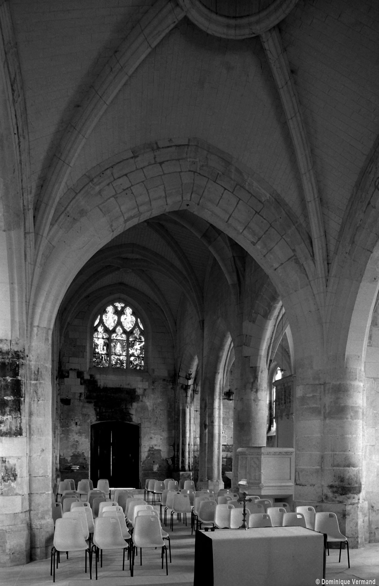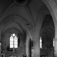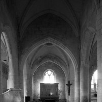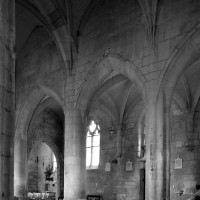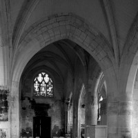 Mais ici, et comme souvent au 16ème siècle, le vaisseau central de la nef est aveugle et la lumière ne pénètre que par les fenêtres des bas-côtés, au réseau caractéristique du style gothique flamboyant comme, du reste, toutes les fenêtres de l’église. Les voûtes d’ogives à nervures prismatiques retombent par pénétration directe dans les piles de plan circulaire ou ondulé et, dans les bas-côtés, sur des culs-de-lampe, tous ces éléments étant caractéristiques du 16ème siècle. Dans le chœur, on note la présence, des deux côtés, de petites piscines liturgiques.