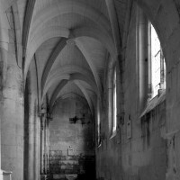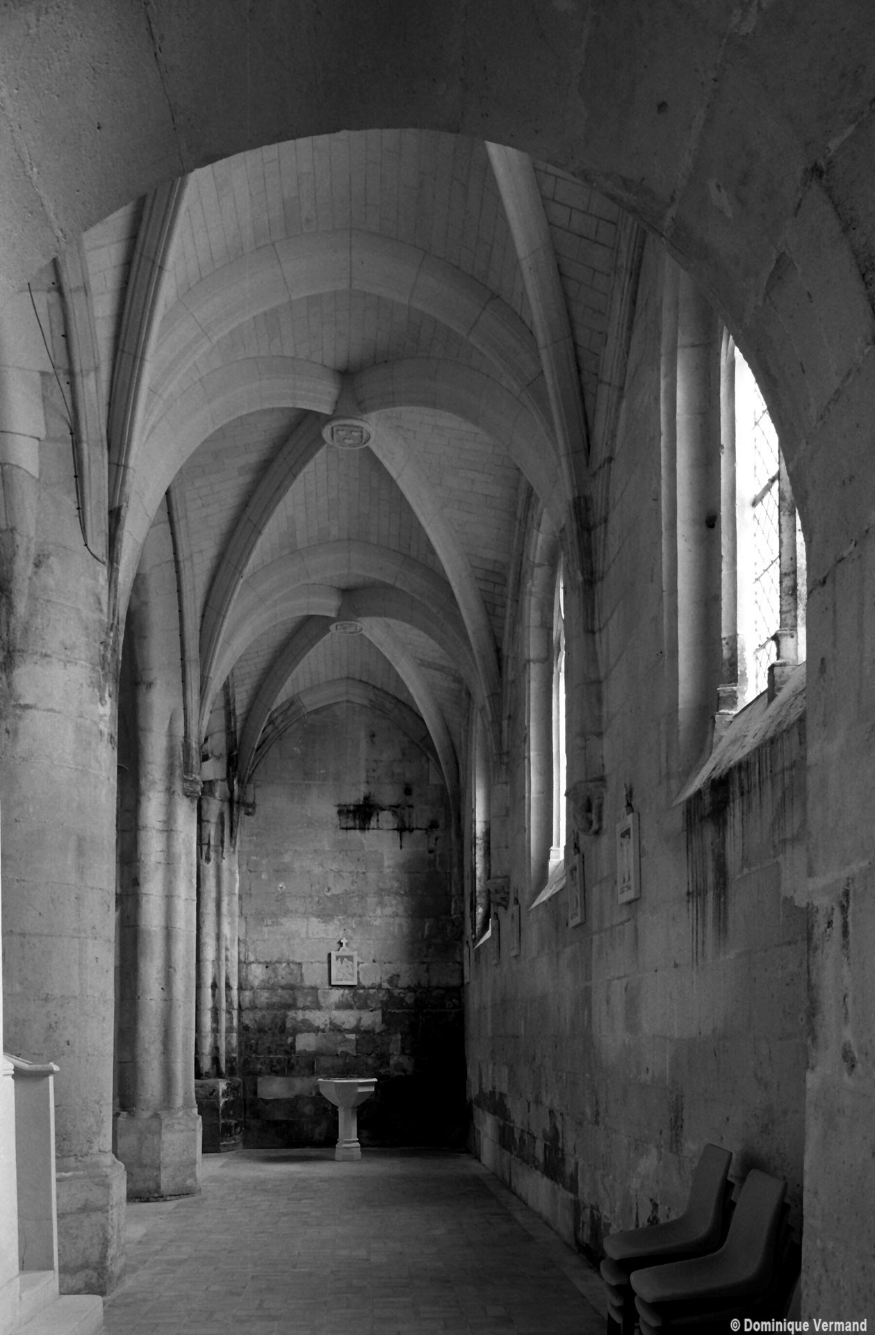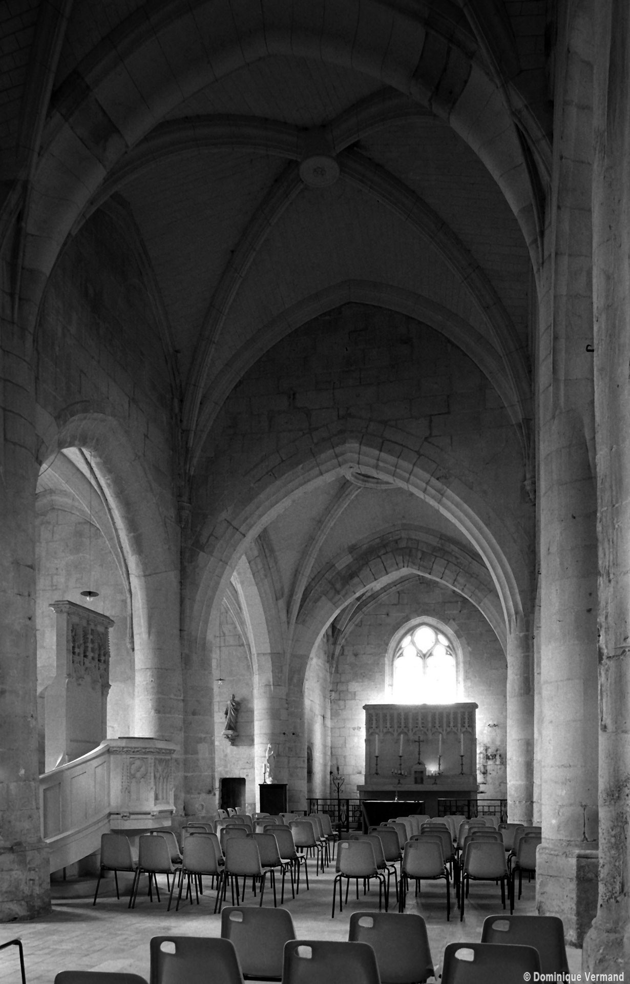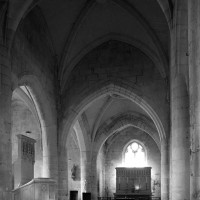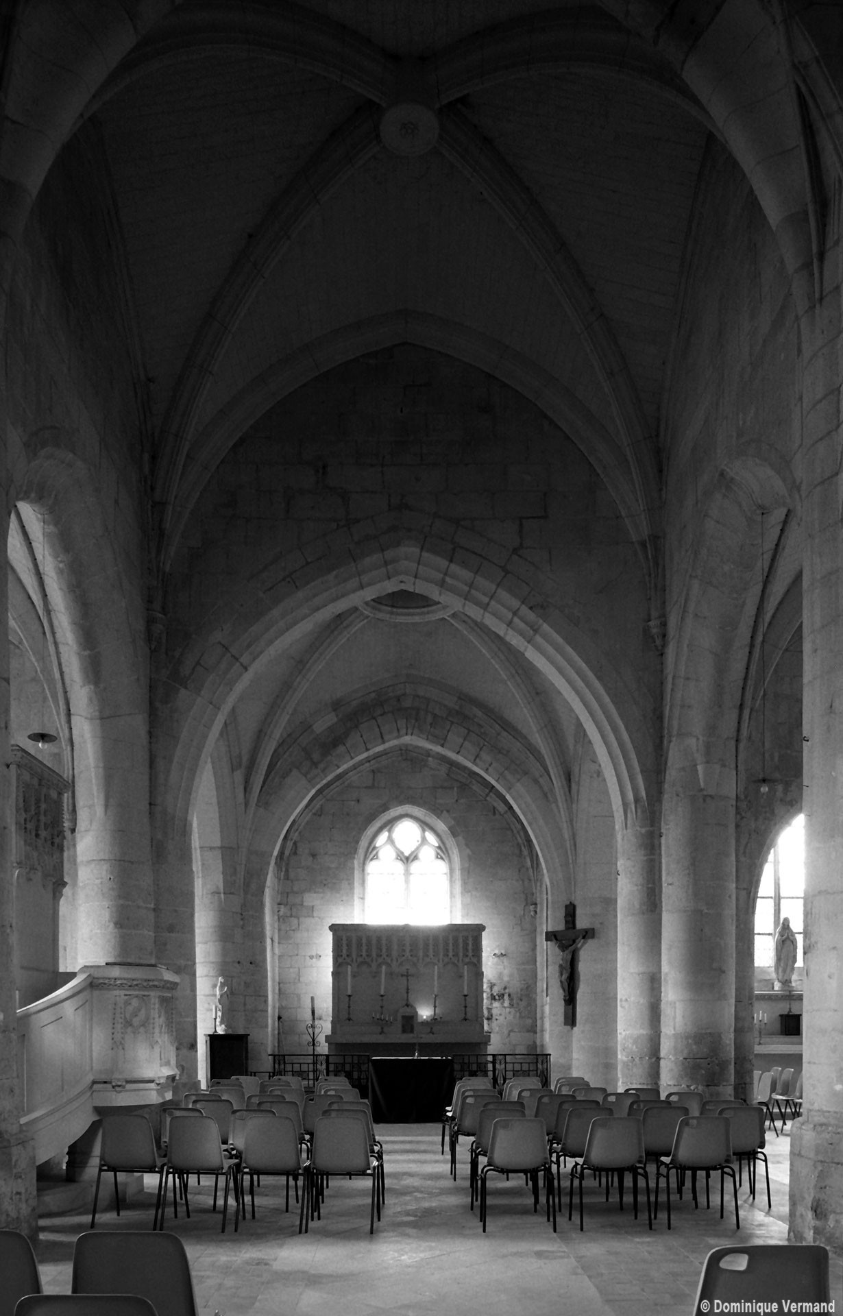 Mais ici, et comme souvent au 16ème siècle, le vaisseau central de la nef est aveugle et la lumière ne pénètre que par les fenêtres des bas-côtés, au réseau caractéristique du style gothique flamboyant comme, du reste, toutes les fenêtres de l’église. Les voûtes d’ogives à nervures prismatiques retombent par pénétration directe dans les piles de plan circulaire ou ondulé et, dans les bas-côtés, sur des culs-de-lampe, tous ces éléments étant caractéristiques du 16ème siècle. Dans le chœur, on note la présence, des deux côtés, de petites piscines liturgiques.