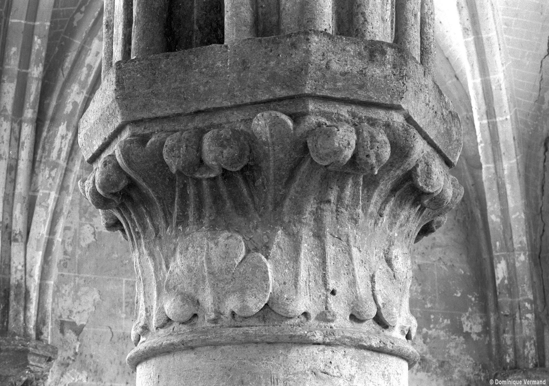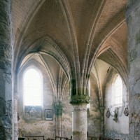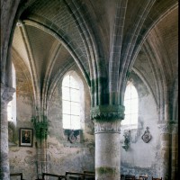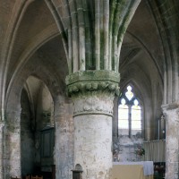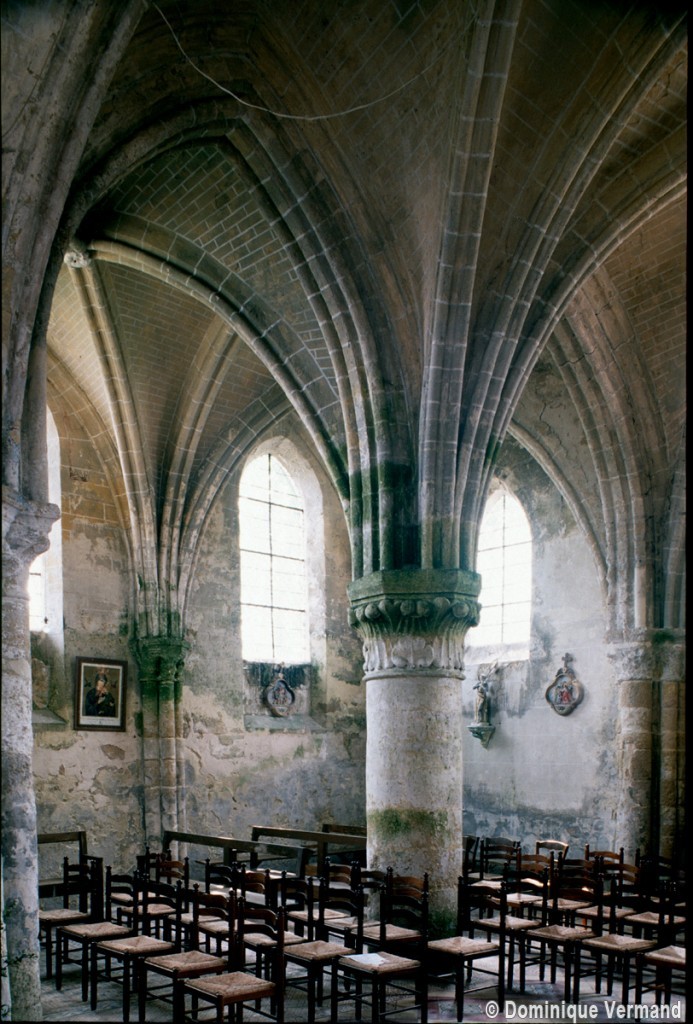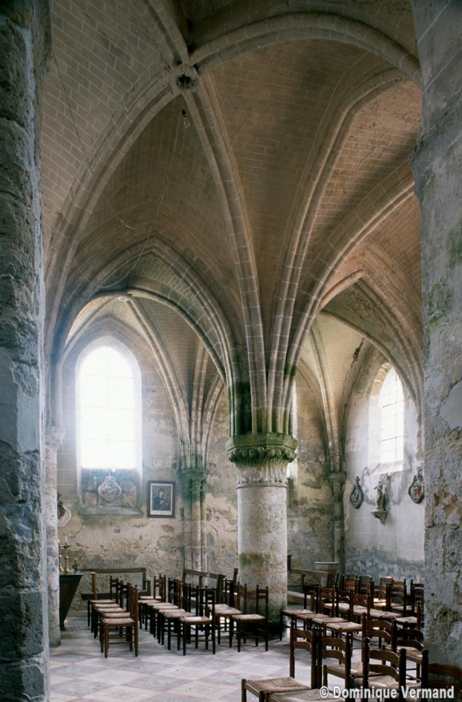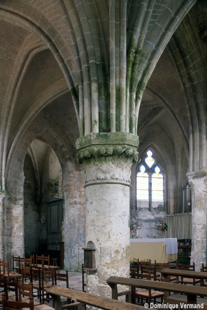 Partie la plus ancienne, le choeur-halle a été bâti au début du 13ème siècle. Formé de deux travées avec bas-côtés, ses six voûtes sont portées à la même hauteur et reçues, au nord sur un puissant massif de maçonnerie en raison de la présence du clocher, au sud sur une élégante pile circulaire. L’unique chapiteau de cette dernière, décoré de feuilles dentelées et de larges tiges côtelées se terminant en crochets, voit se concentrer sur lui quatre doubleaux et quatre ogives.