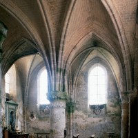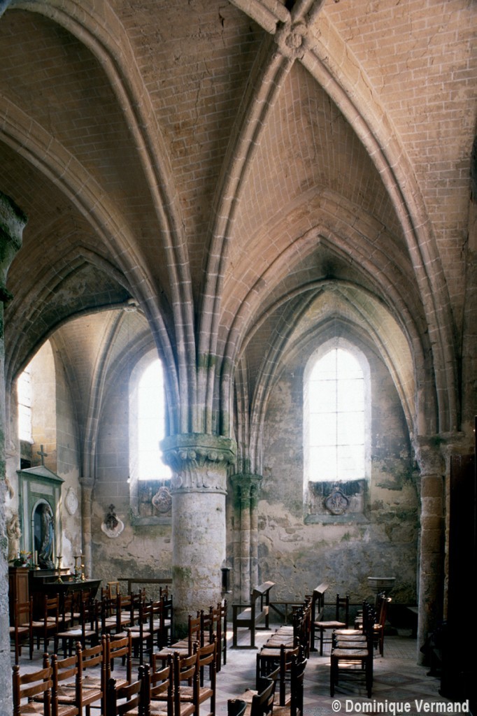 Dans le bas-côté nord, associé au clocher, les retombées se font sur des culs-de-lampe décorés de masques ou de visages plus ou moins grossiers. Toutes les fenêtres sont de simples lancettes, sans meneaux intermédiaires donc. On sera sensible à la sobre beauté de cette architecture gothique qui, malgré des dimensions réduites, manifeste le souci de créer un espace totalement unifié. Plusieurs églises du 16ème siècle de la région reprendront avec bonheur ce parti, y compris dans l’usage d’une seule toiture à deux rampants perpendiculaire à l’axe de l’édifice, et pignon unique pour les deux travées.