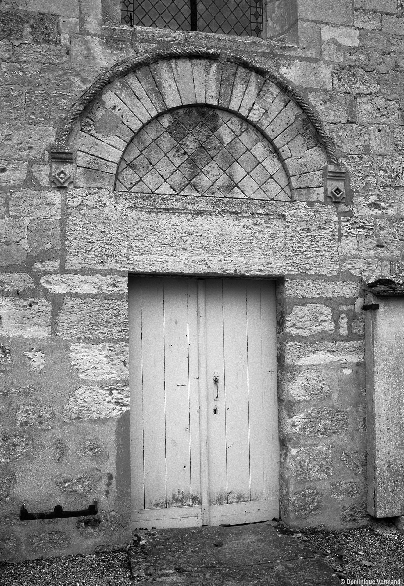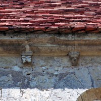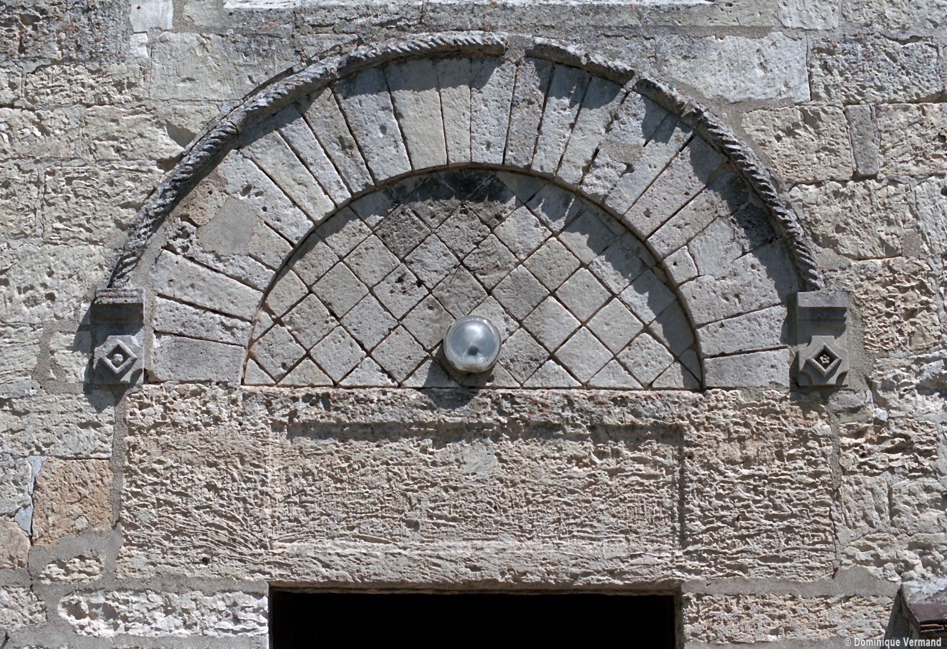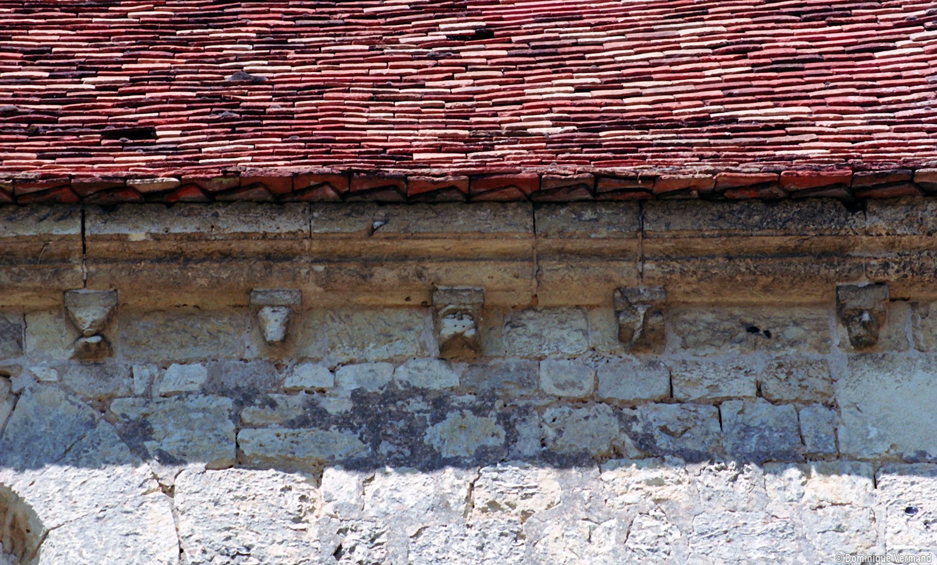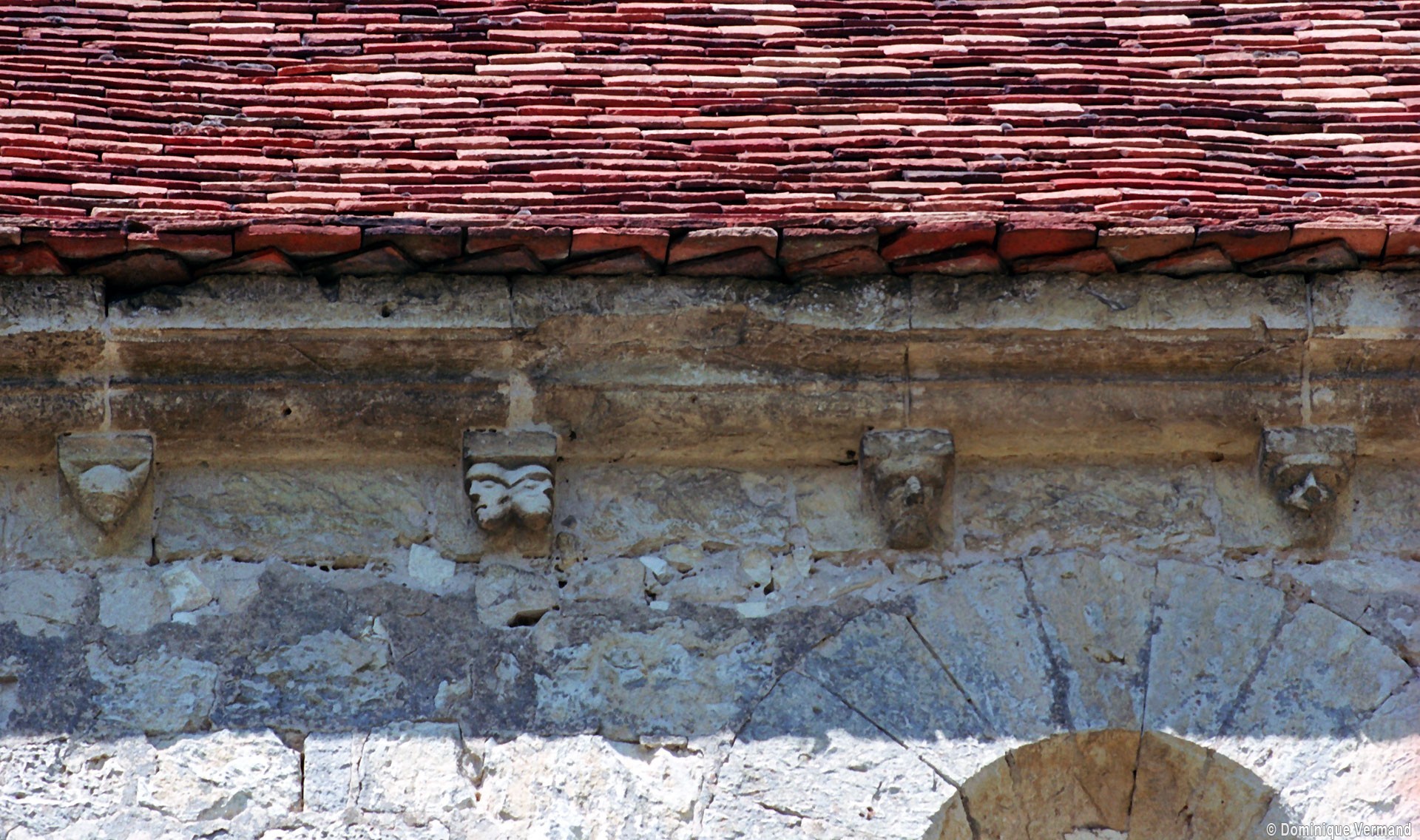 La façade, dont le pignon et la fenêtre ont été refaits, montre un portail intéressant par le décor réticulé (les pierres carrées sont disposées comme des losanges) de son tympan. Une moulure torsadée reçue sur des cabochons tardifs souligne l’archivolte. Les murs gouttereaux sont percés chacun de trois petites fenêtres en plein cintre à double ébrasement. Au-dessus, la corniche à modillons sculptés de motifs divers, dont des têtes humaines ou animales, est parfaitement conservée. Au sud, un larmier court sous la base des fenêtres et devait correspondre à une toiture en appentis. Contrairement à la nef, qui en est dépourvue, le choeur est épaulé par des contreforts plats justifiés par les voûtes en pierre qui le couvrent intérieurement. Le clocher d’origine n’a subsisté que jusqu’à la hauteur de la corniche de la nef. Un étage de beffroi en charpente et ardoises le couronne depuis une date indéterminée.