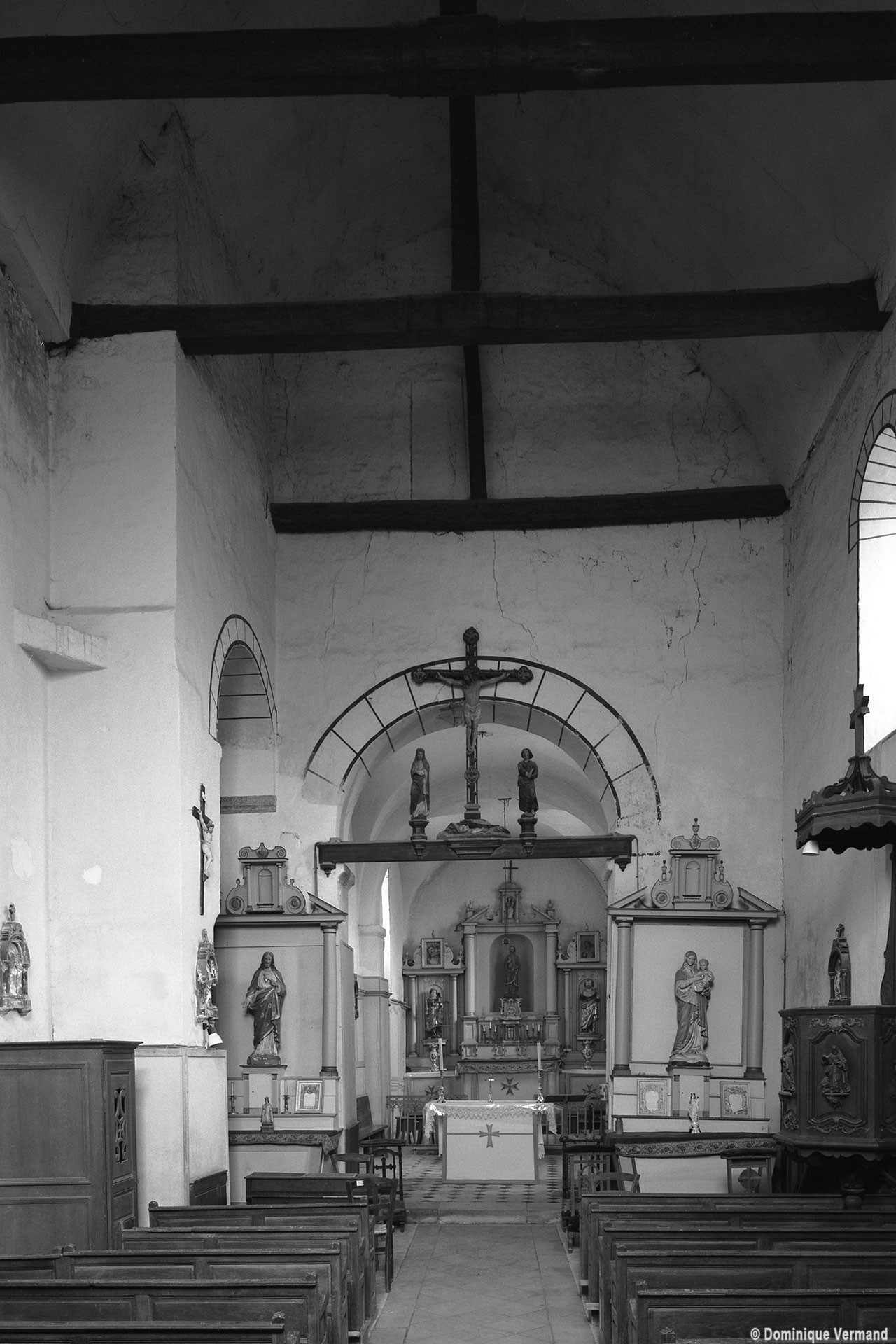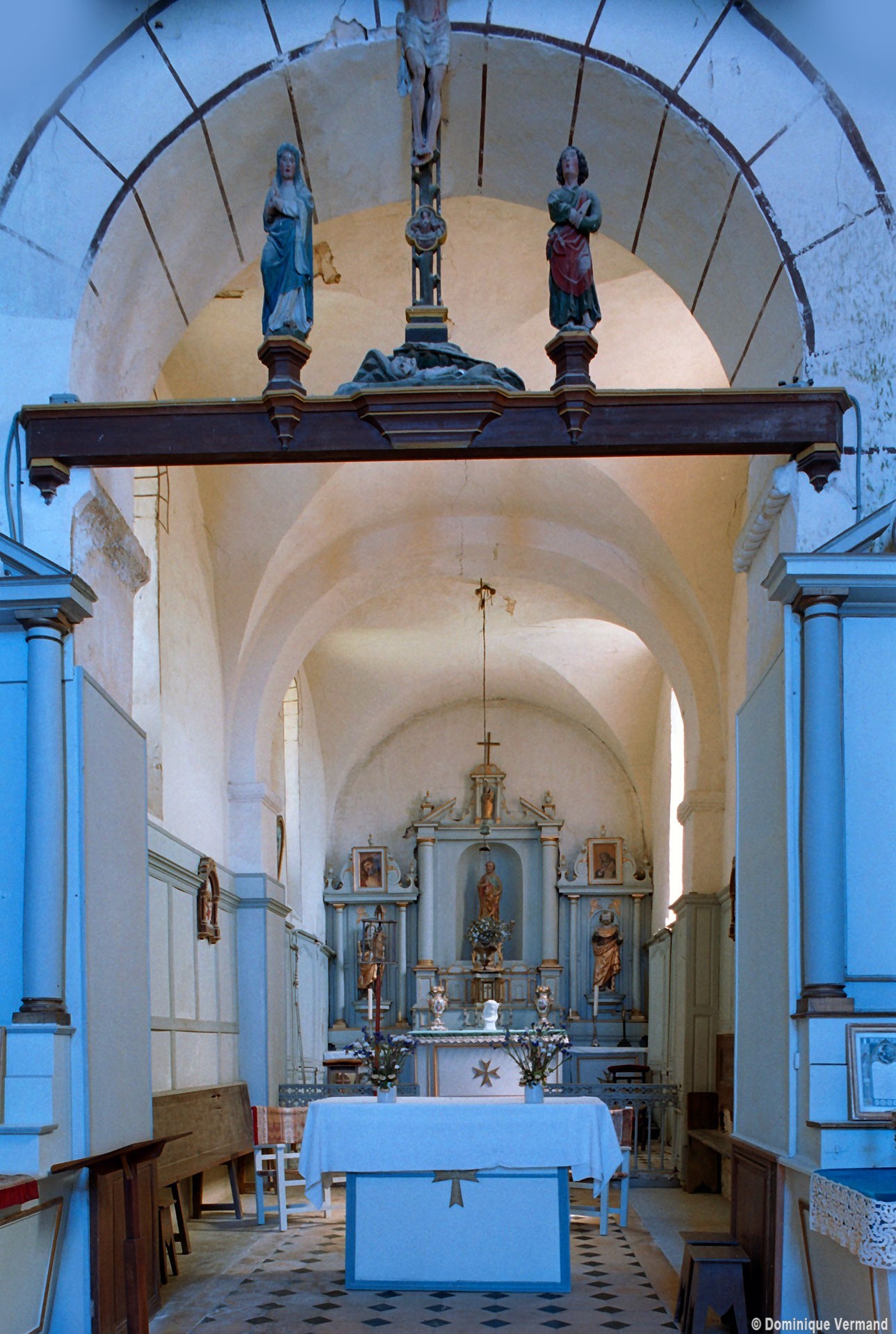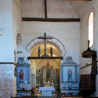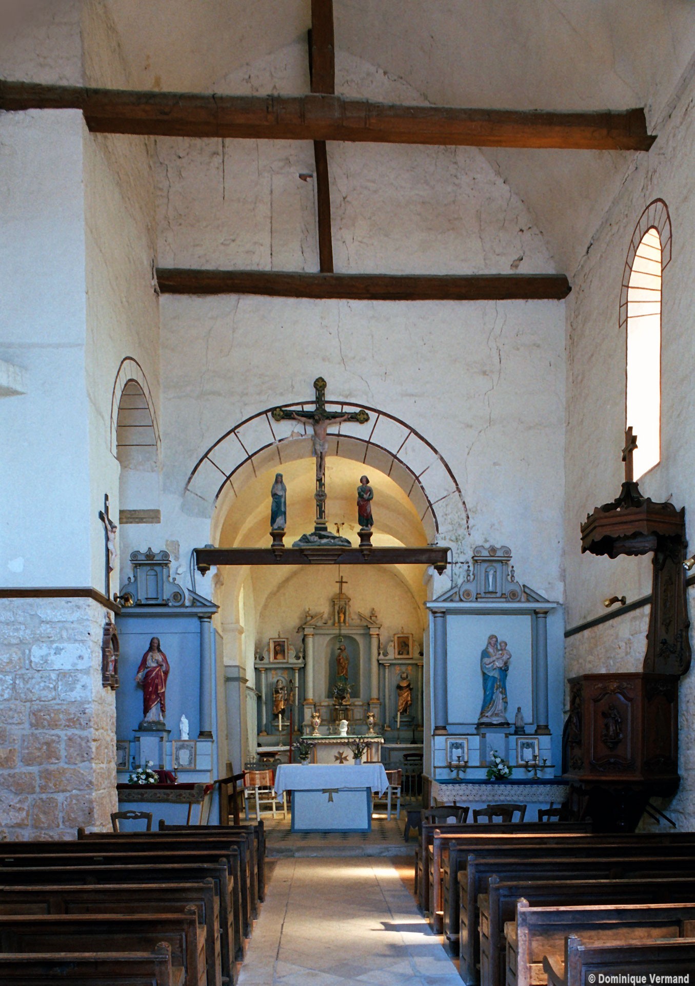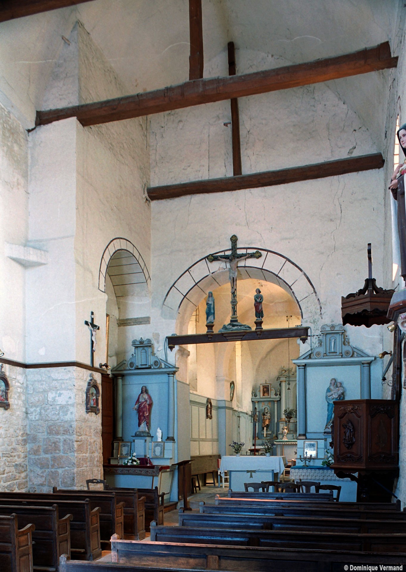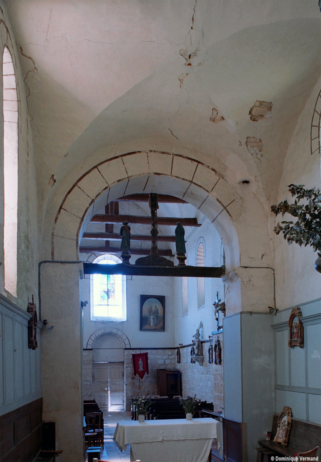 A l’intérieur, l’attention se porte sur le choeur et la base du clocher, qui communiquent tous deux avec la nef par une arcade en plein cintre. Long de deux travées, le choeur a conservé ses voûtes d’arêtes en pierre. L’arcade qui assure la communication avec la nef (arc triomphal) et celle qui sépare les deux travées retombent sur des pilastres par l’intermédiaire de tailloirs simplement moulurés, l’un étant toutefois décoré d’une torsade. La base du clocher est également voûtée d’arêtes et son arcade retombe, de même, sur deux tailloirs à décor torsadé.