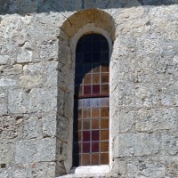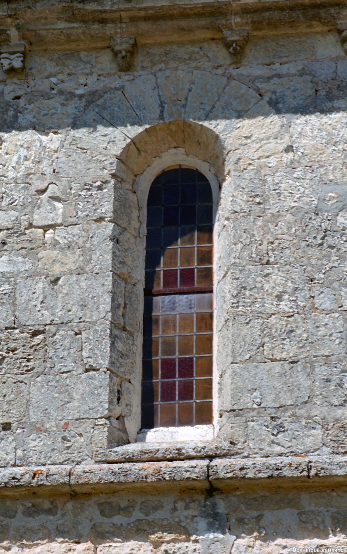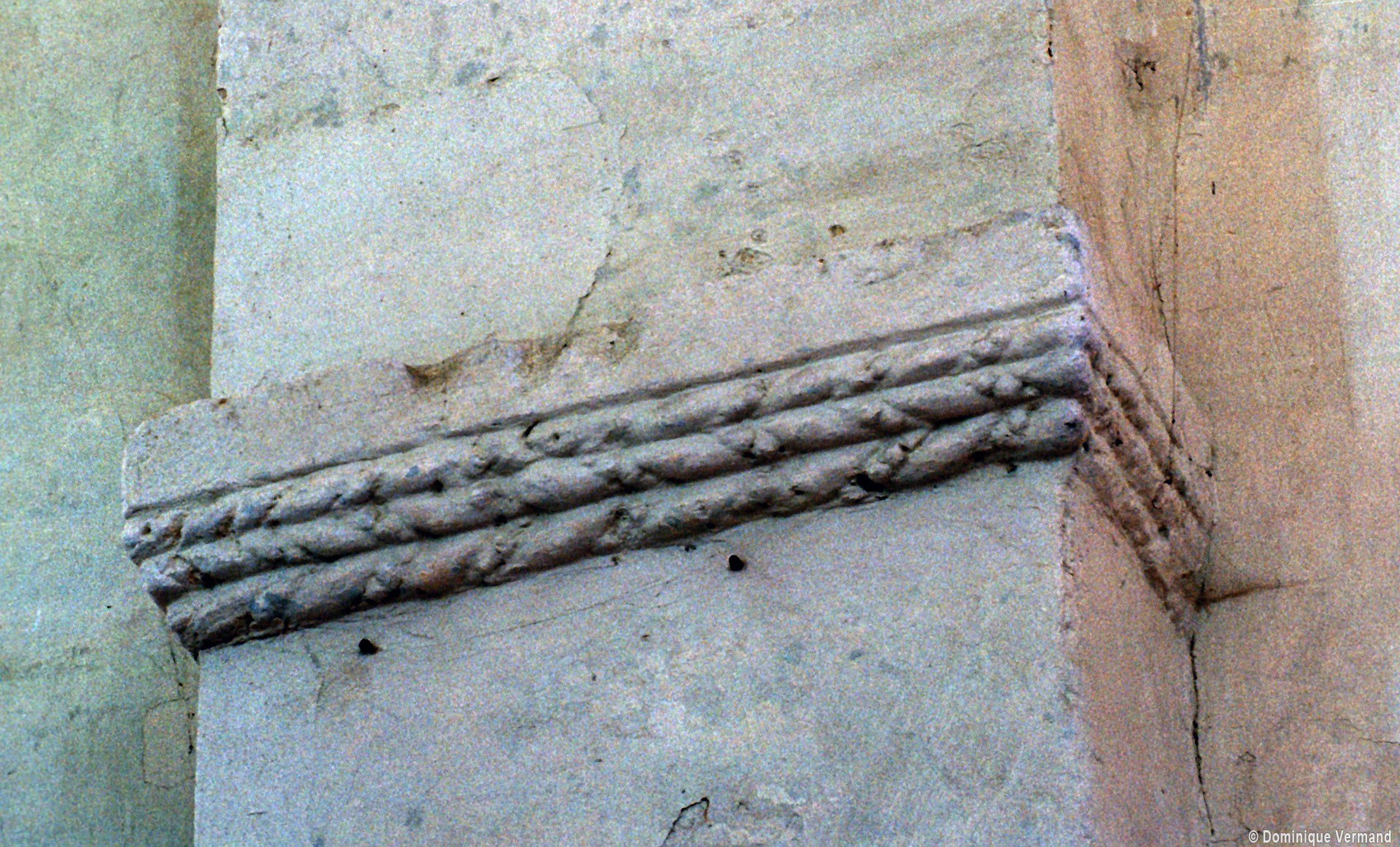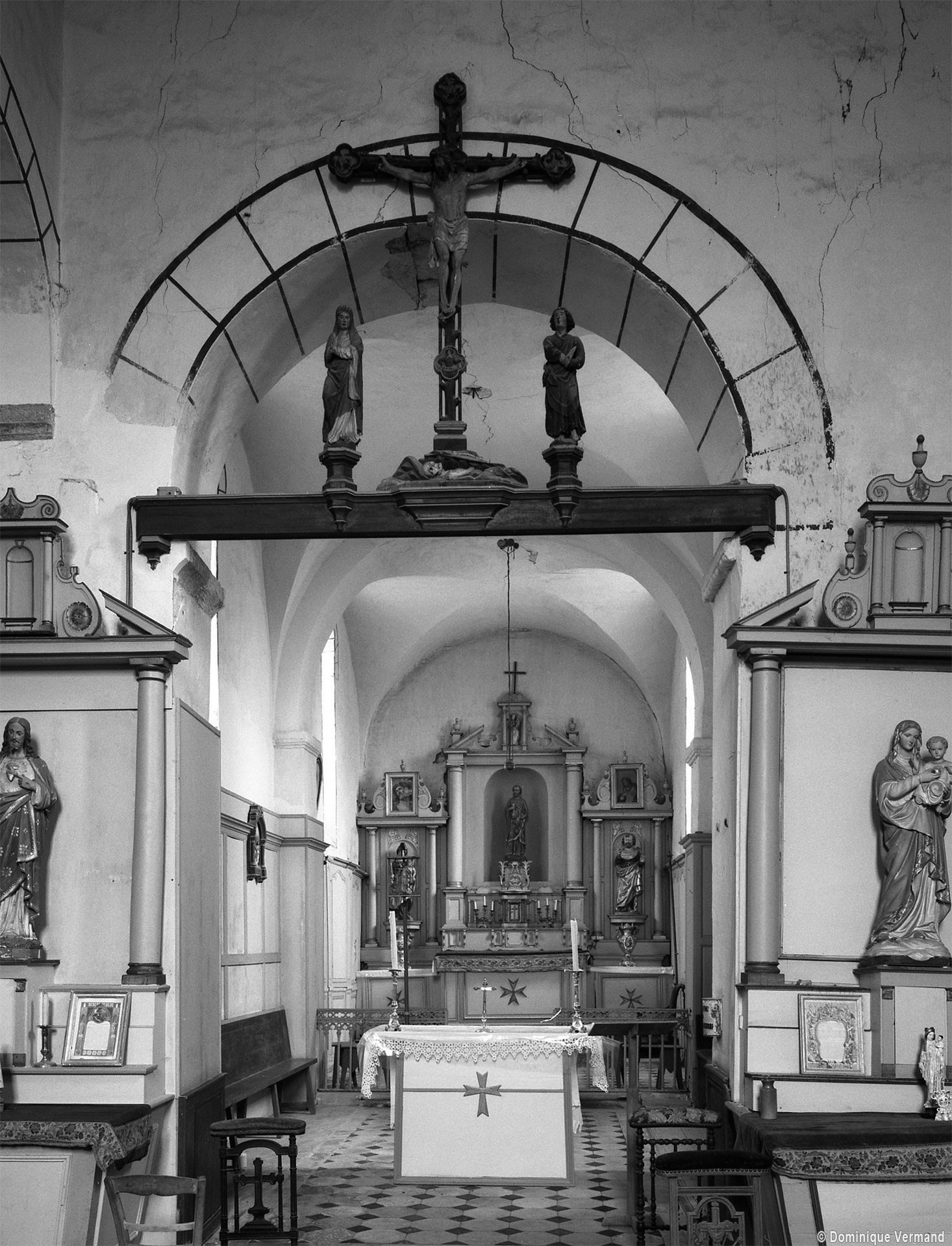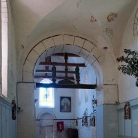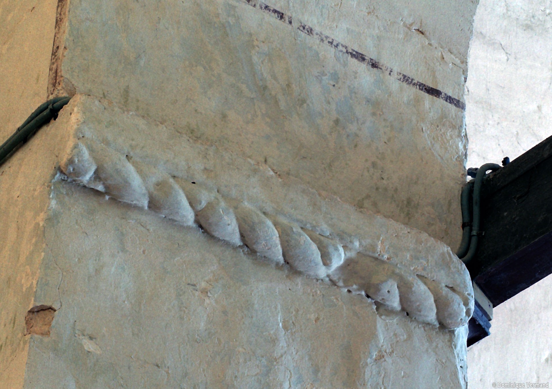 A l’intérieur, l’attention se porte sur le choeur et la base du clocher, qui communiquent tous deux avec la nef par une arcade en plein cintre. Long de deux travées, le choeur a conservé ses voûtes d’arêtes en pierre. L’arcade qui assure la communication avec la nef (arc triomphal) et celle qui sépare les deux travées retombent sur des pilastres par l’intermédiaire de tailloirs simplement moulurés, l’un étant toutefois décoré d’une torsade. La base du clocher est également voûtée d’arêtes et son arcade retombe, de même, sur deux tailloirs à décor torsadé.