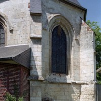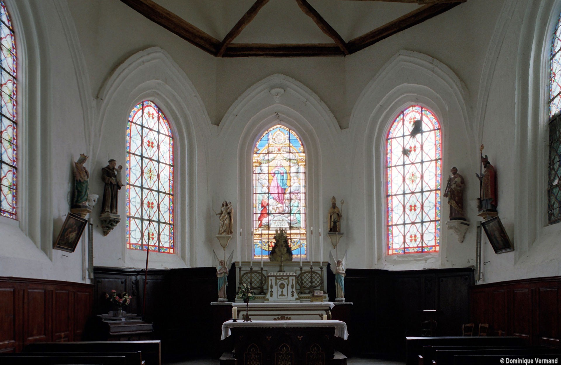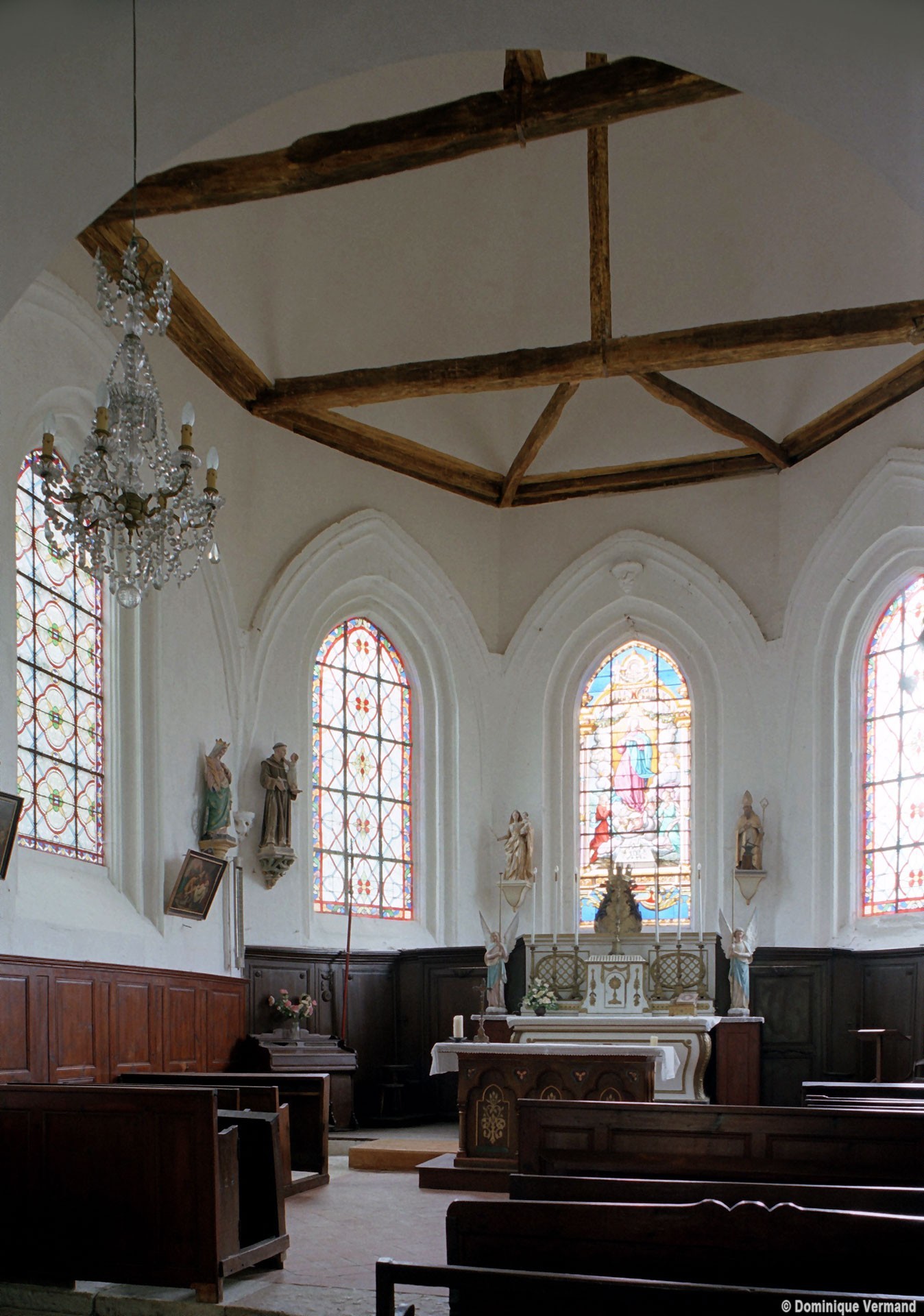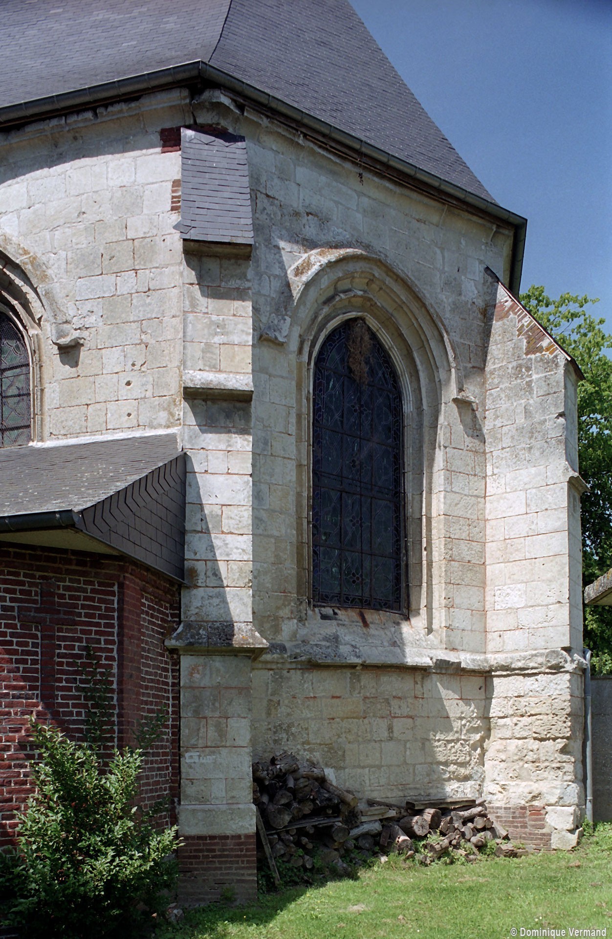 Constamment réparée, la nef est indatable avec précision. Elle est surmontée à l’ouest par un clocher en charpente et ardoises dont la moitié inférieure se confond avec la toiture de la nef et qui se termine par une flèche effilée. Une charpente indépendante des murs le reçoit à l’intérieur. Bâti en pierres crayeuses soigneusement appareillées et épaulé par des contreforts à ressauts, le choeur est du 16ème siècle. Les fenêtres sont des larges lancettes richement travaillées dont l’archivolte est soulignée par une moulure fortement marquée. Elles n’ont jamais eu de meneaux.