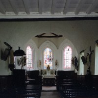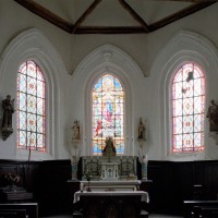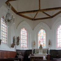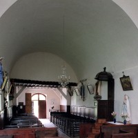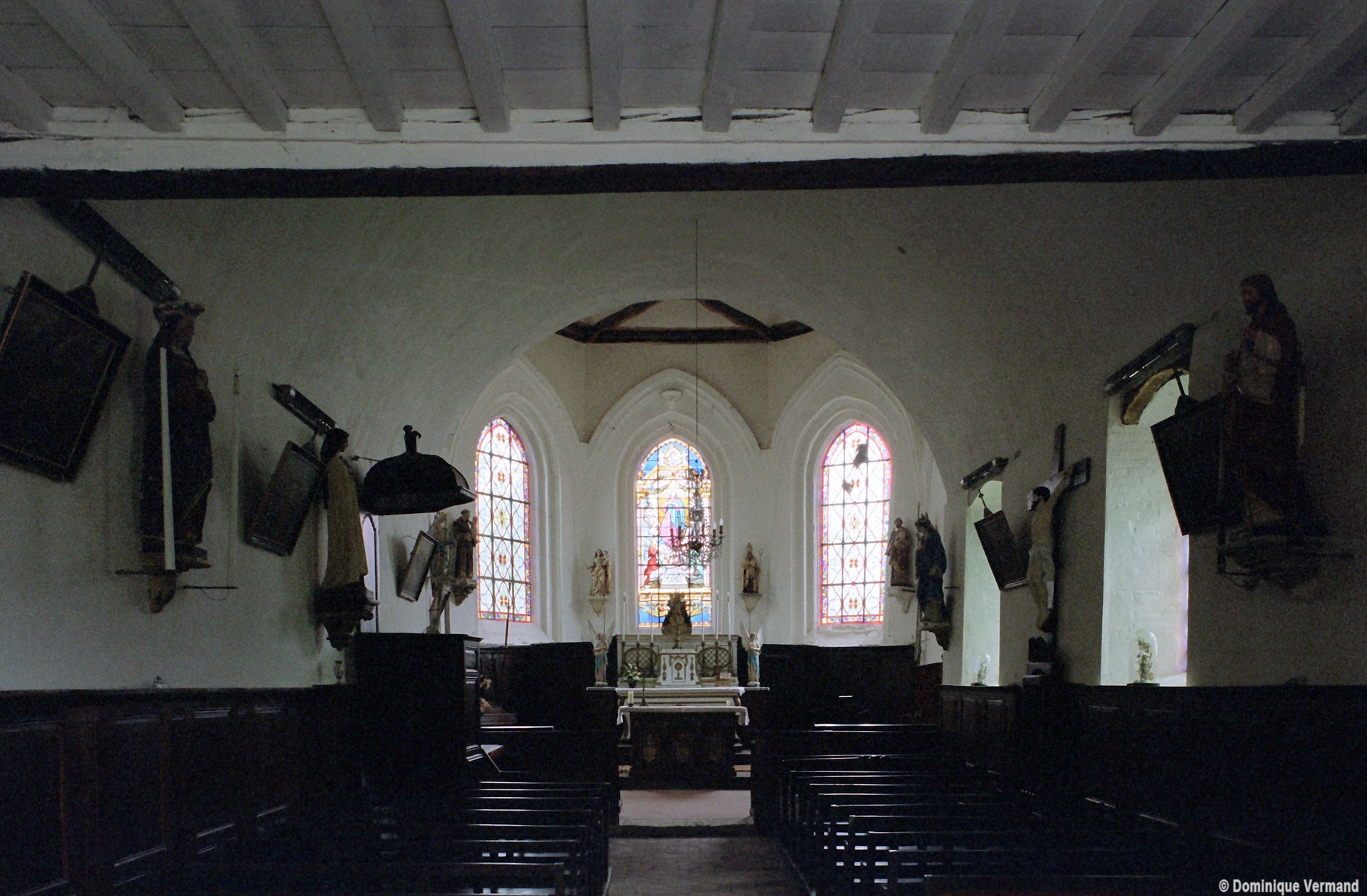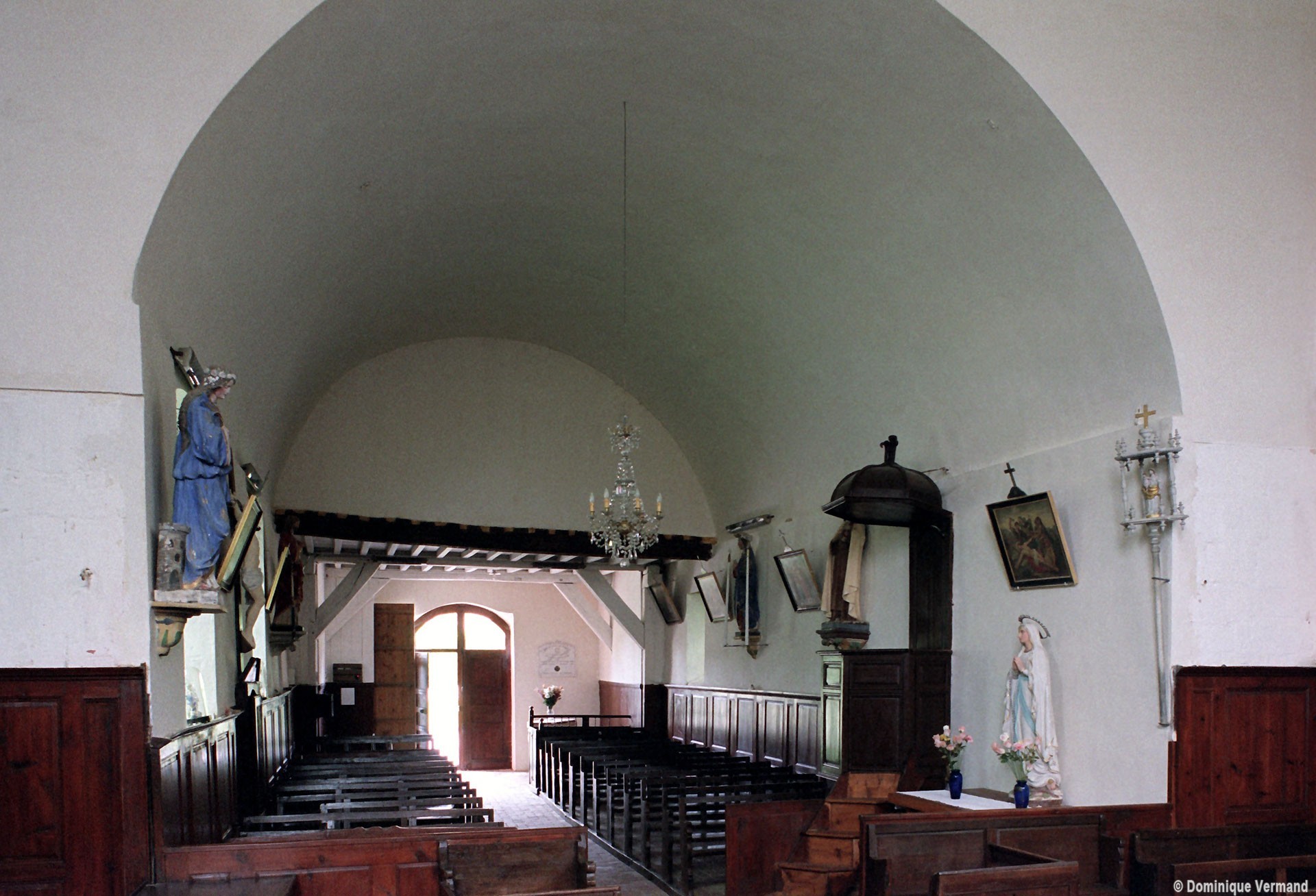 A l’intérieur, la présence systématique d’arcs formerets prouve qu’un voûtement en pierre était prévu ou bien a disparu. Le caractère très rustique de la charpente actuelle pourrait faire pencher en faveur de la seconde hypothèse. L’édifice a gardé son autel du 18ème siècle et quelques statues d’art populaire. On remarquera également la curieuse disposition du confessionnal, aménagé à la fin du 18ème siècle dans l’épaisseur d’un mur de la nef (2007).