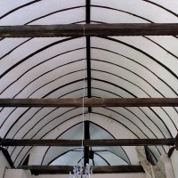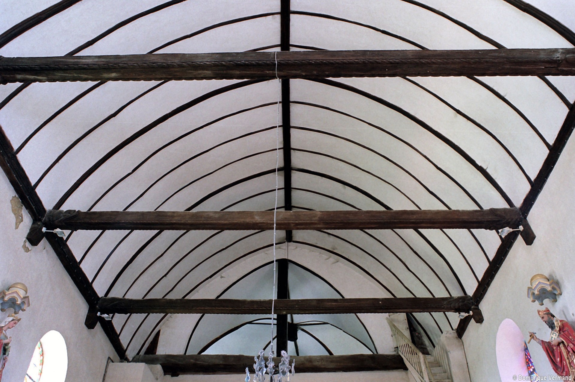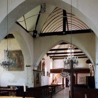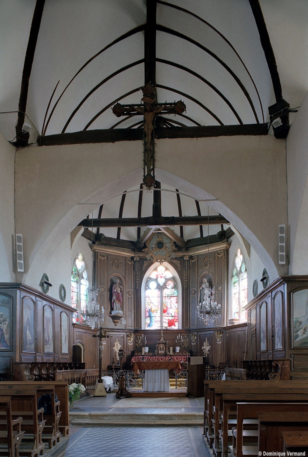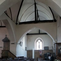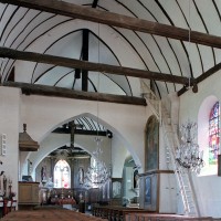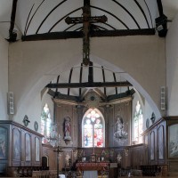 L’intérieur se signale surtout par la disposition très originale de la croisée. Les quatre arcades qui la délimitent et servent d’assise au clocher sont en effet associées, non à des plafonds plats mais à des charpentes en carène, avec pour résultat un vide inhabituel entre les deux parties. Pour leur part, les charpentes présentent une structure classique avec entraits (éléments horizontaux) et poinçons (éléments verticaux).