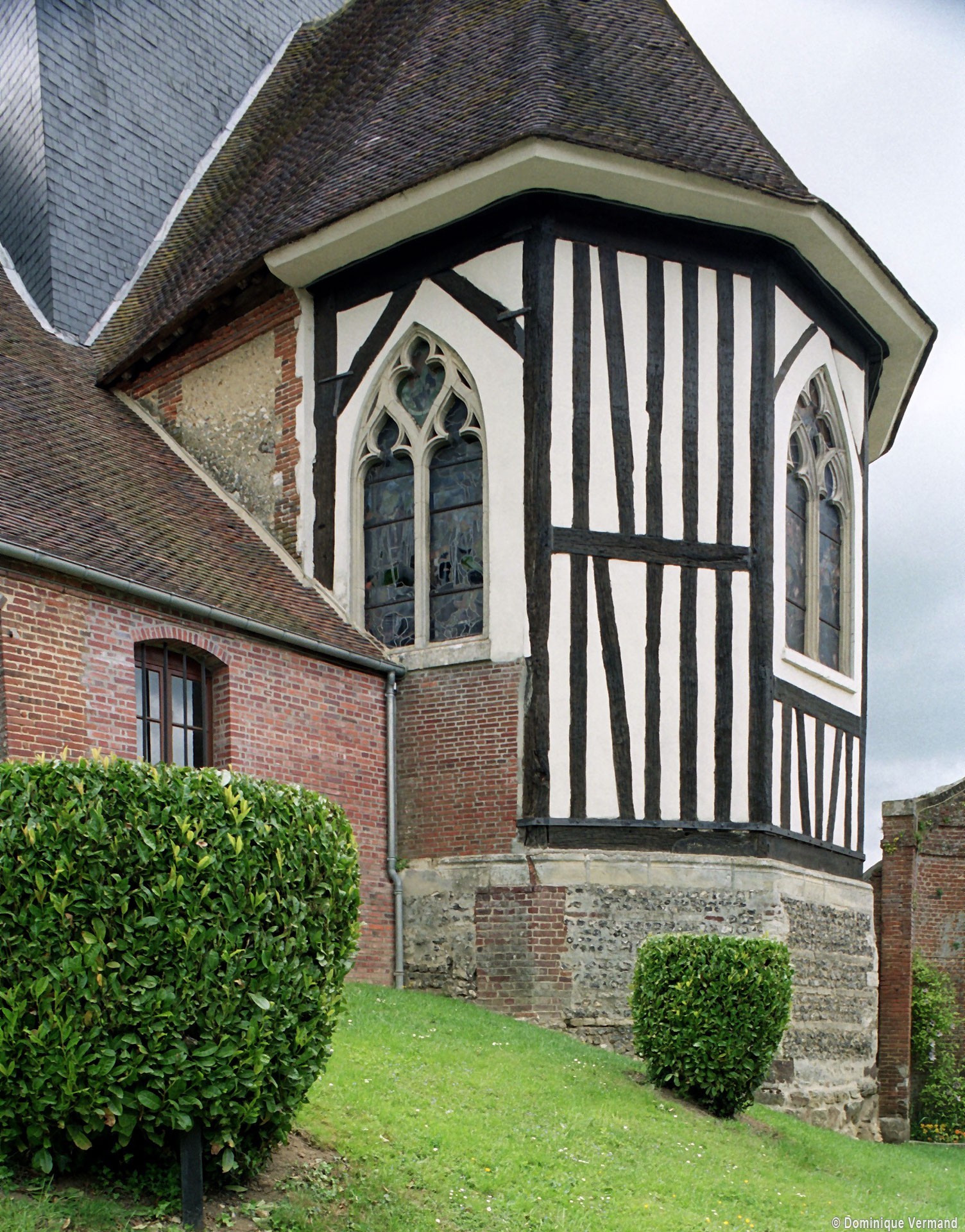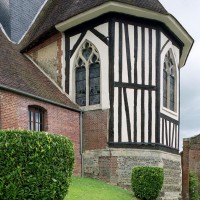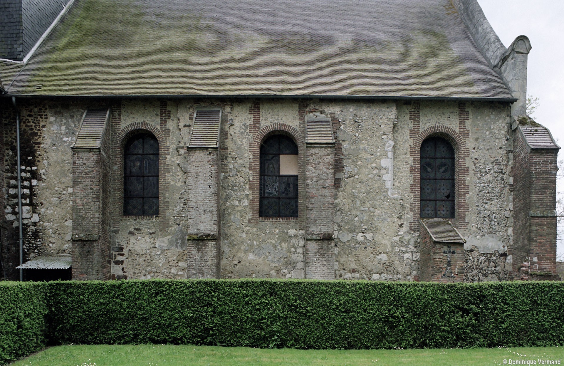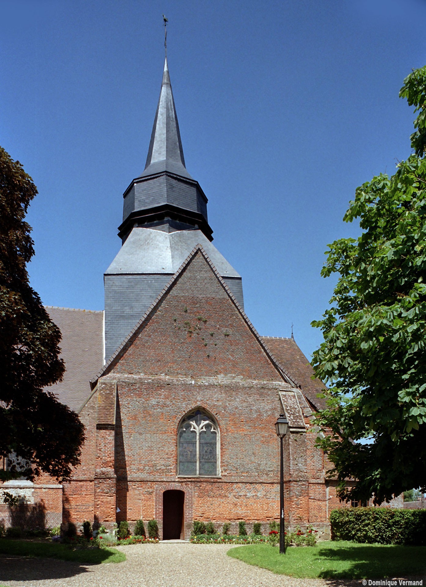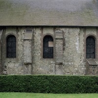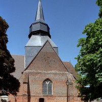 Comme souvent, la partie la plus ancienne est la nef, dont l’ossature remonte au 12ème siècle si l’on en juge par les restes d’une petite fenêtre en plein cintre visibles au mur nord. Construite à l’origine en silex, elle sera largement reprise au 18ème siècle avec l’insertion de chaînages, l’ajout de contreforts et le percement de fenêtres beaucoup plus grandes, tous réalisés en briques. Le transept et le choeur – celui-ci très refait par la suite – datent du 16ème siècle et constituent un intéressant exemple de l’utilisation de la brique à cette époque.