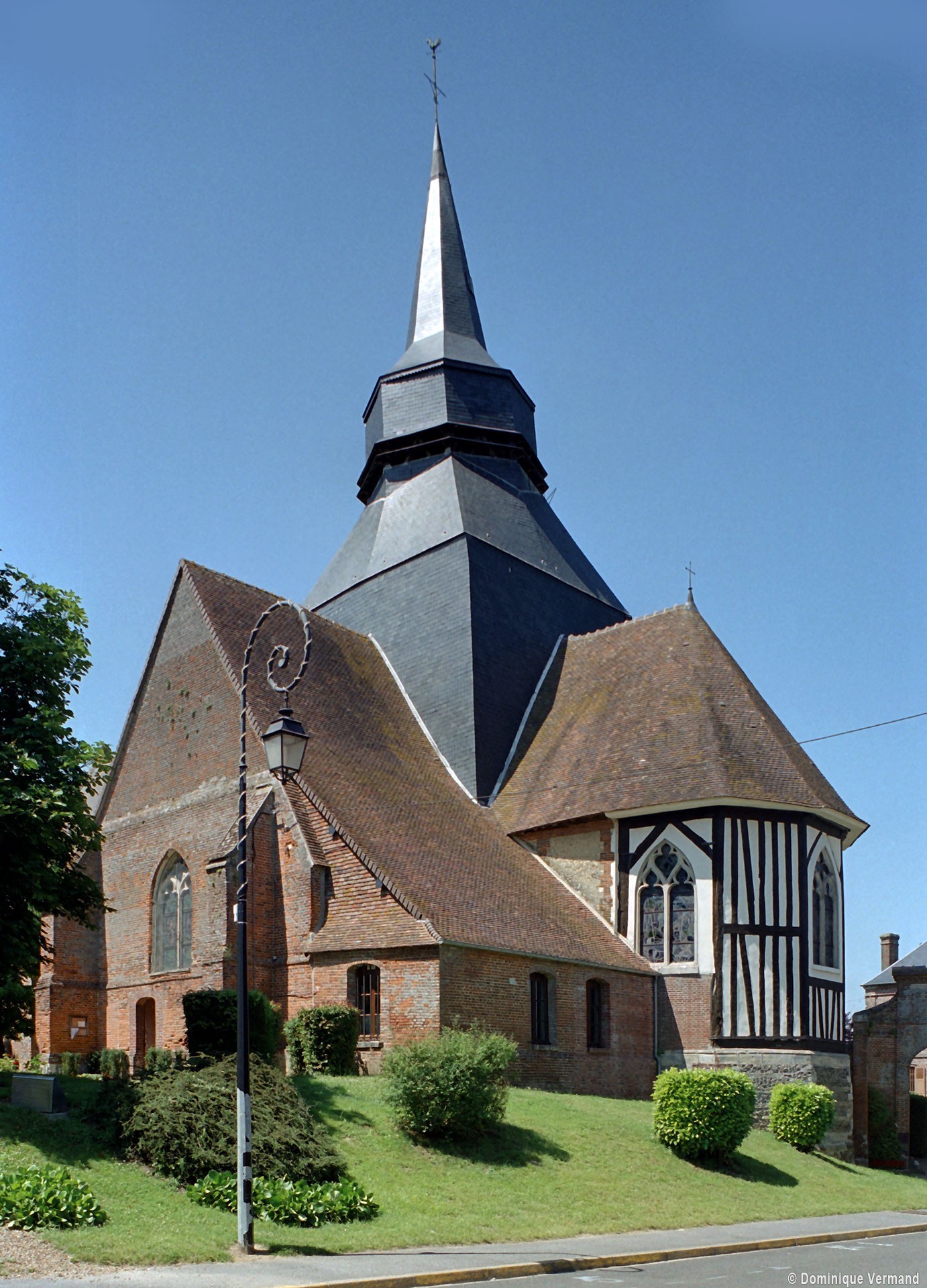Saint-Denis est un édifice composite qui surprend par son abside à colombage, une technique de construction habituellement réservée aux constructions civiles. Son plan affecte la forme d’une croix latine et ses différentes parties se distribuent autour du volumineux clocher en charpente recouverte d’ardoises que termine une flèche octogonale effilée.