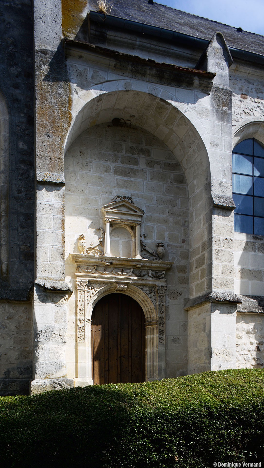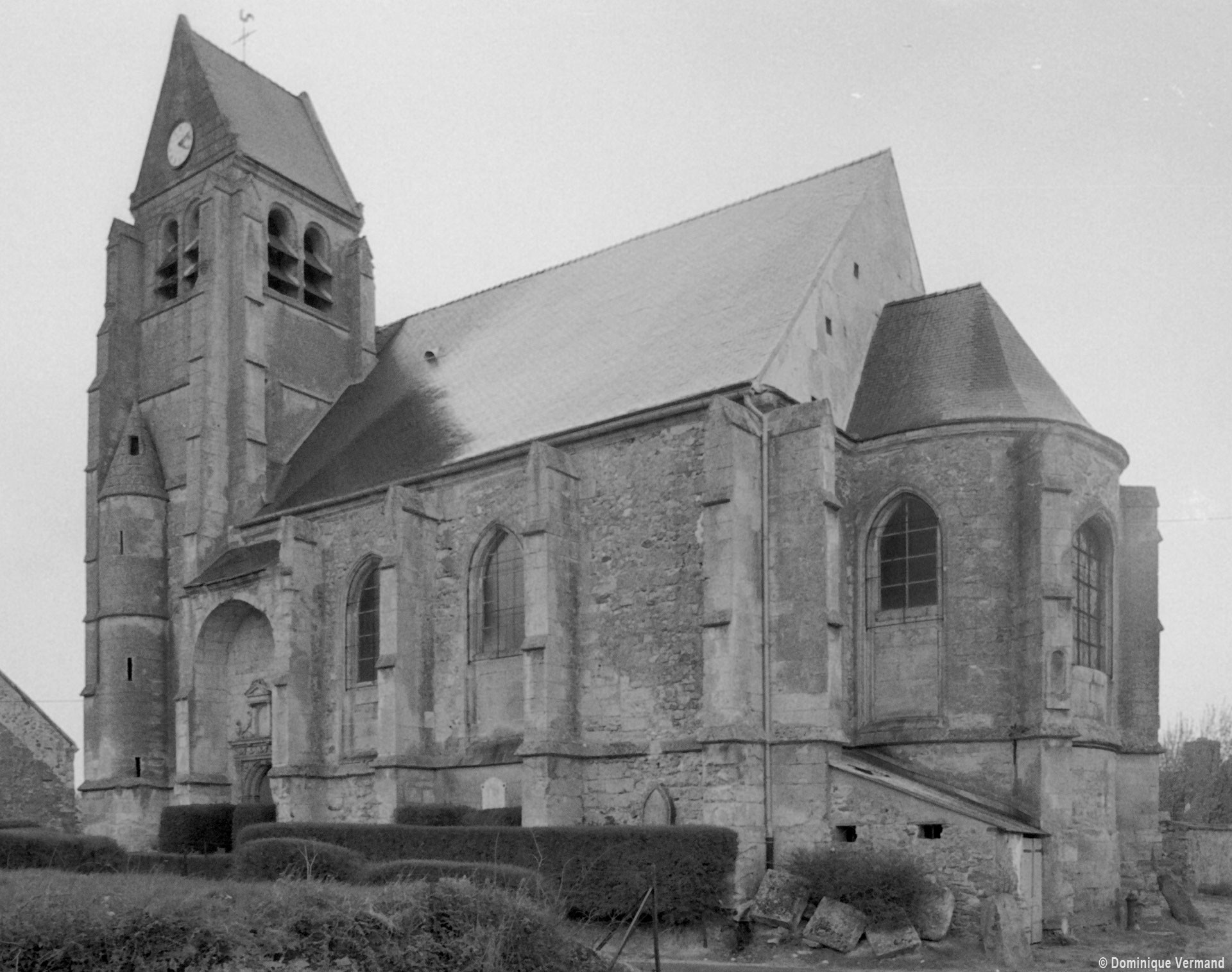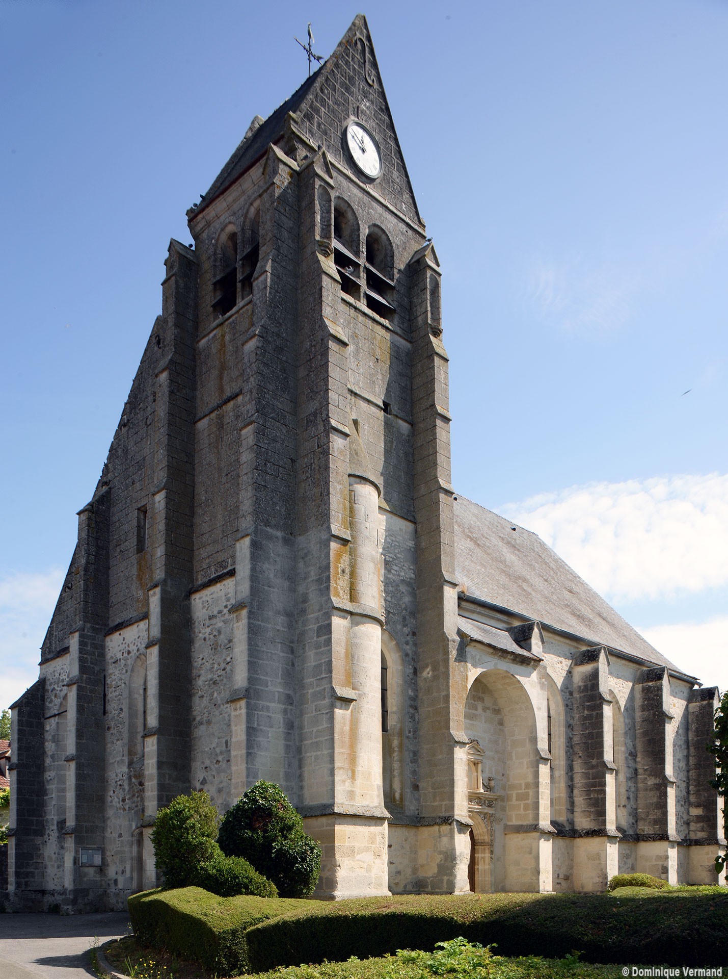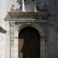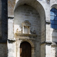 Suivant la tradition du gothique tardif, le clocher est sur la première travée du bas-côté, ici celui du sud. Ajouré d’un seul étage de baies géminées en plein cintre, il est épaulé par des contreforts comportant de nombreux larmiers. Dans cet ensemble assez austère, on n’appréciera que davantage le délicieux petit portail qu’encadrent et protègent deux contreforts et une petite voûte en berceau au droit de la seconde travée du bas-côté sud. Son décor architecturé, aux motifs variés et délicats, s’accorde bien avec la date de 1632 (ou 52 ?) que l’on peut lire sur le piédroit gauche (1997).