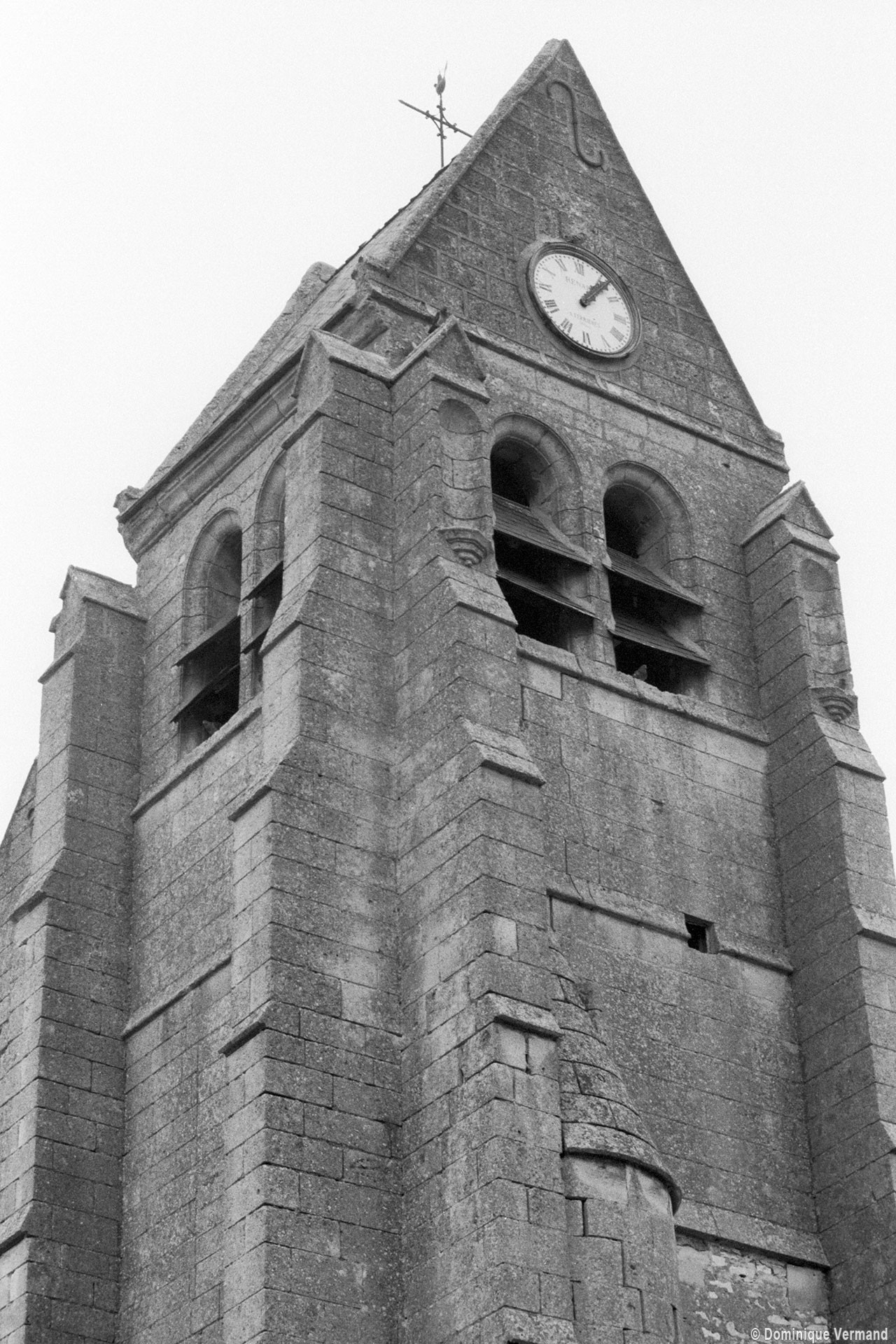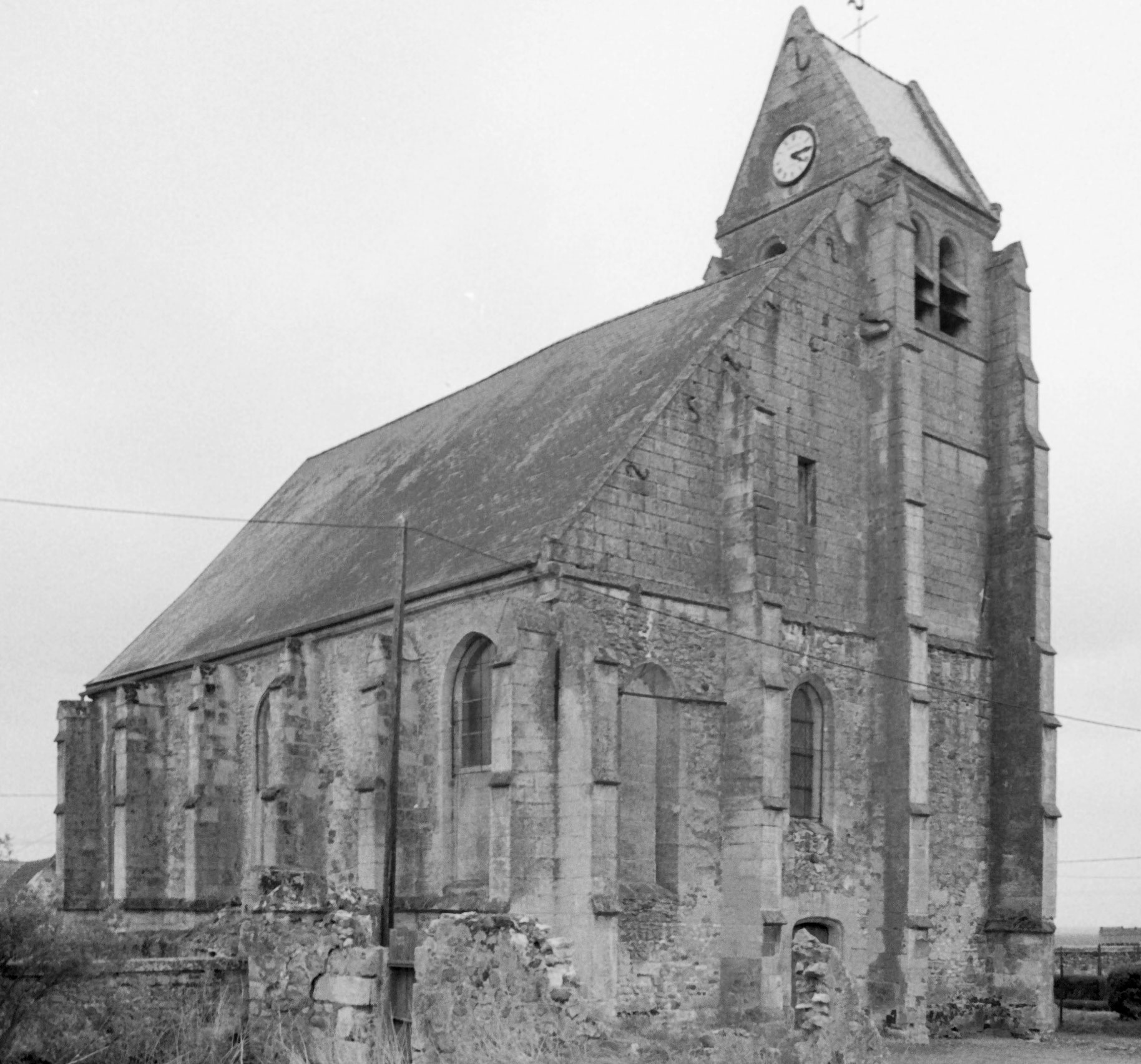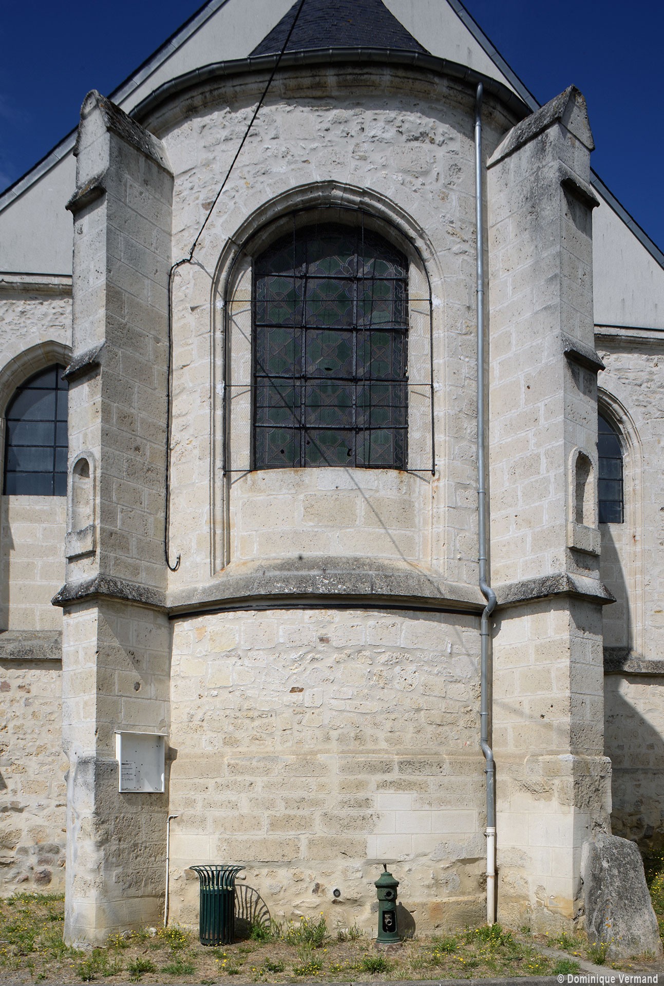 Suivant la tradition du gothique tardif, le clocher est sur la première travée du bas-côté, ici celui du sud. Ajouré d’un seul étage de baies géminées en plein cintre, il est épaulé par des contreforts comportant de nombreux larmiers. Dans cet ensemble assez austère, on n’appréciera que davantage le délicieux petit portail qu’encadrent et protègent deux contreforts et une petite voûte en berceau au droit de la seconde travée du bas-côté sud. Son décor architecturé, aux motifs variés et délicats, s’accorde bien avec la date de 1632 (ou 52 ?) que l’on peut lire sur le piédroit gauche (1997).