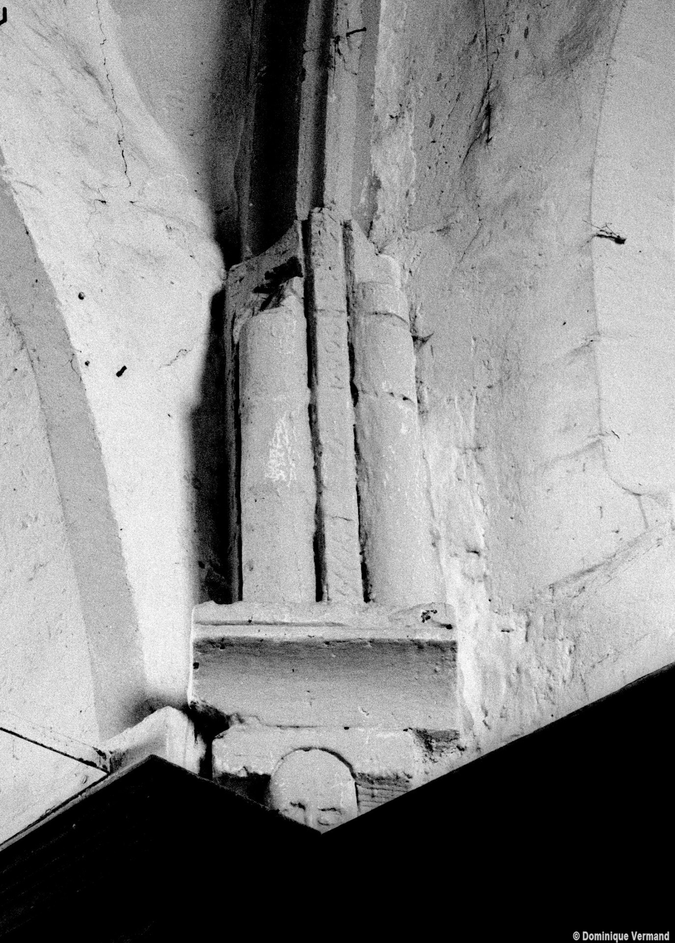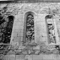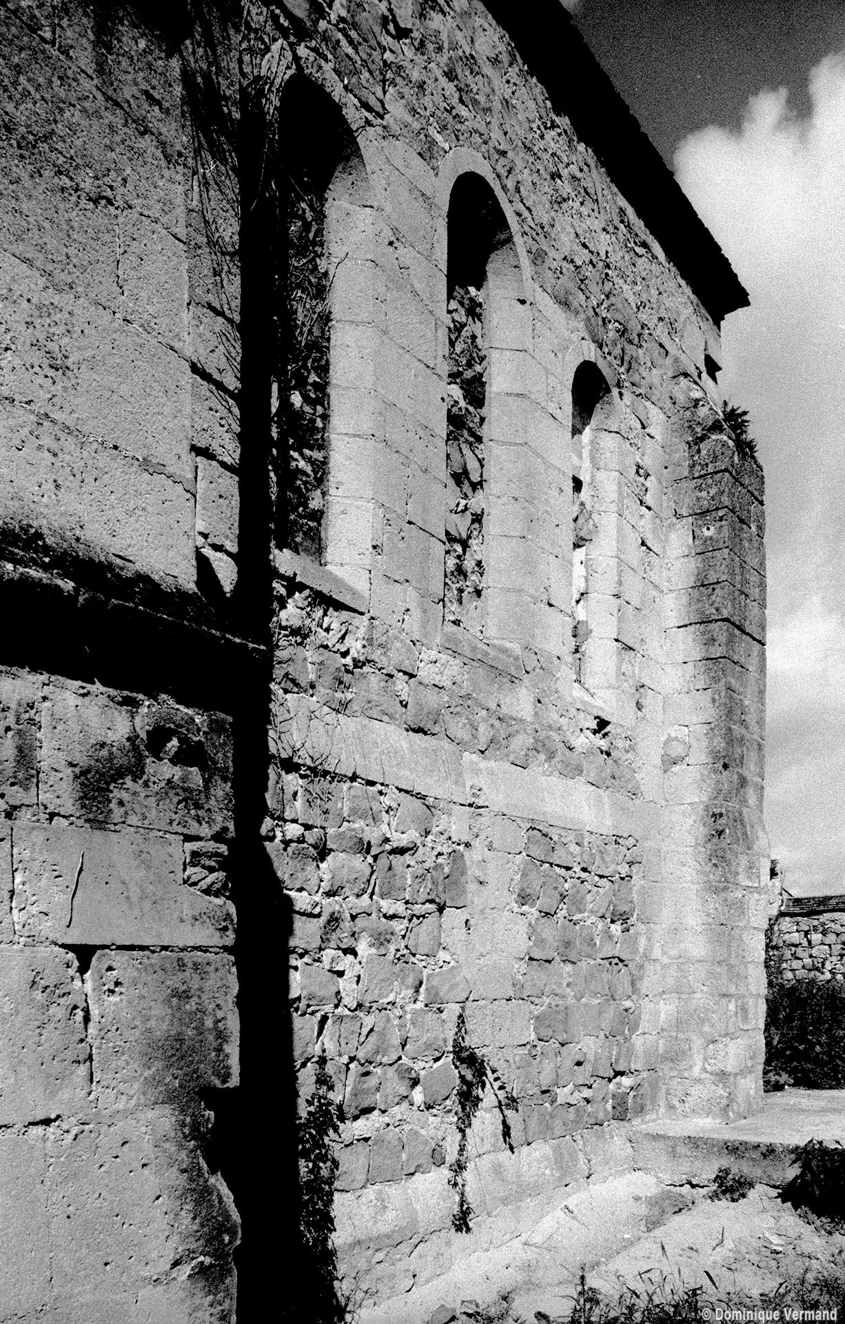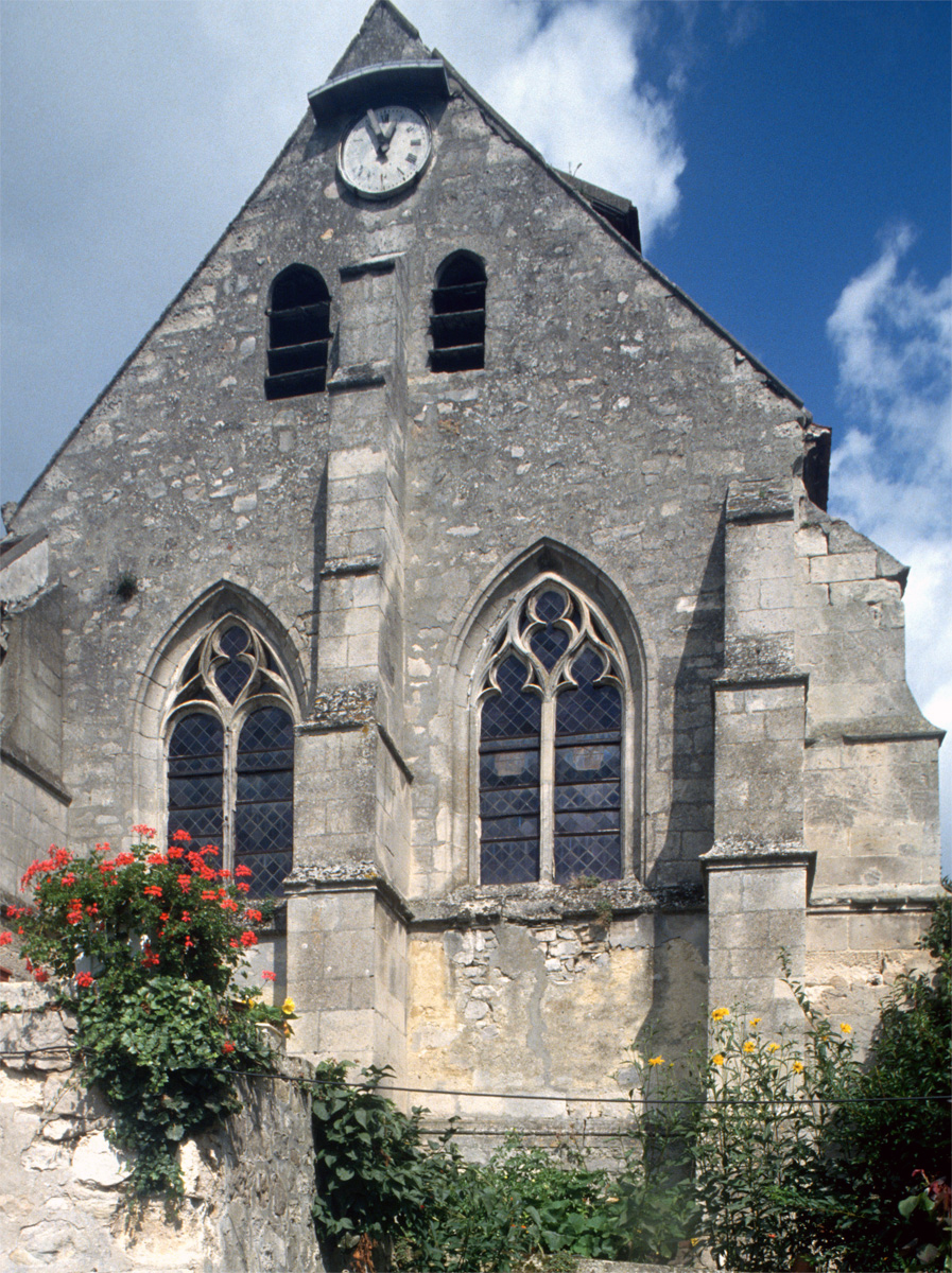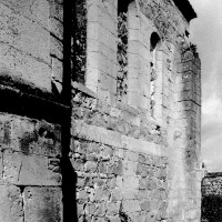 Masquée en grande partie par des propriétés particulières, Saint-Martin ne se découvre guère que de l’intérieur. Un choeur à chevet plat existait au début du 12ème siècle, dont il reste le mur oriental, ajouré d’un triplet de fenêtres en plein cintre. Une reprise dans la seconde moitié du même siècle a laissé l’arc triomphal, décoré de pointes de diamant et de dents de scie et, à son revers sud, l’amorce d’une ogive reçue sur un cul-de-lampe décoré d’un masque.